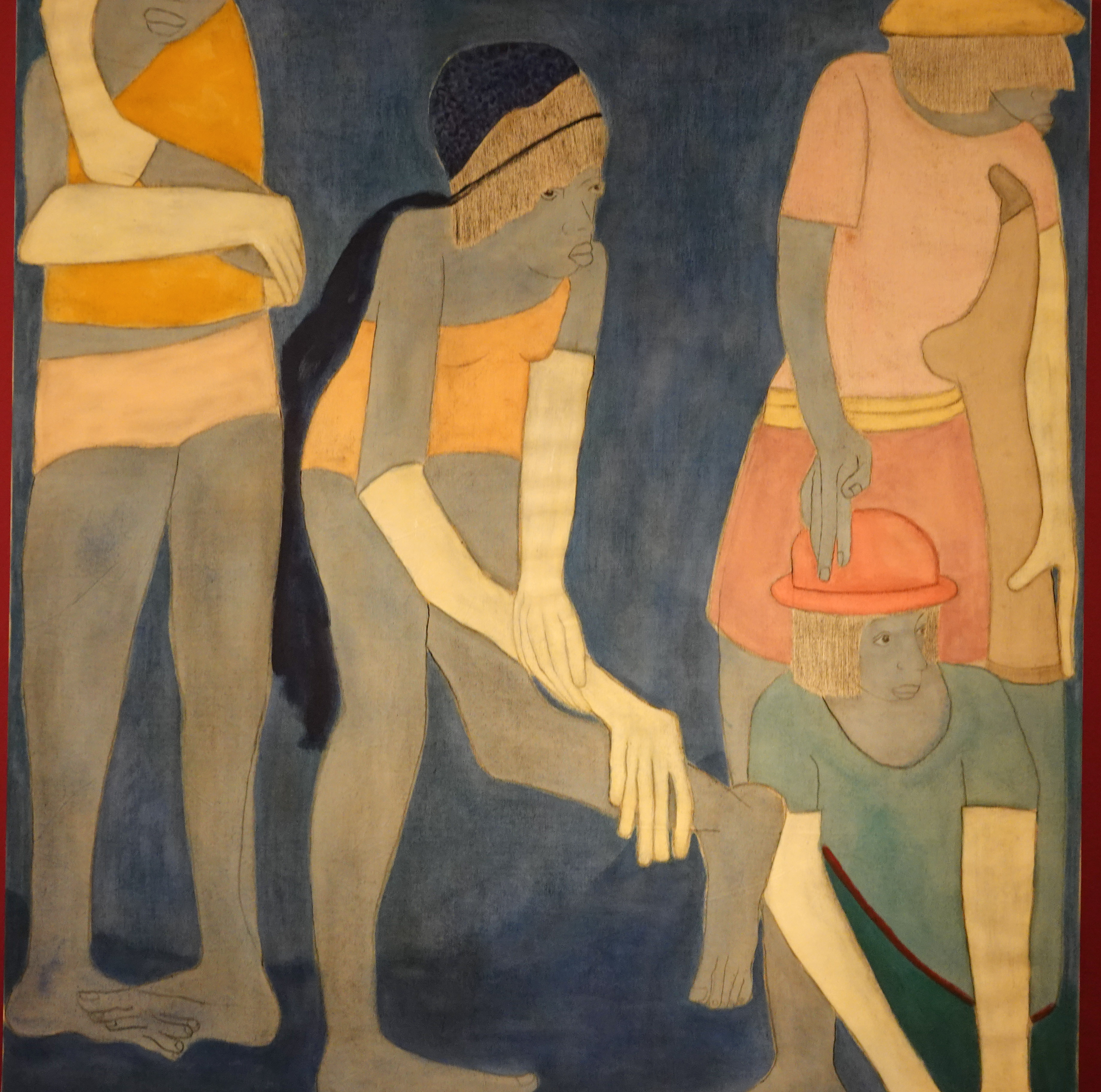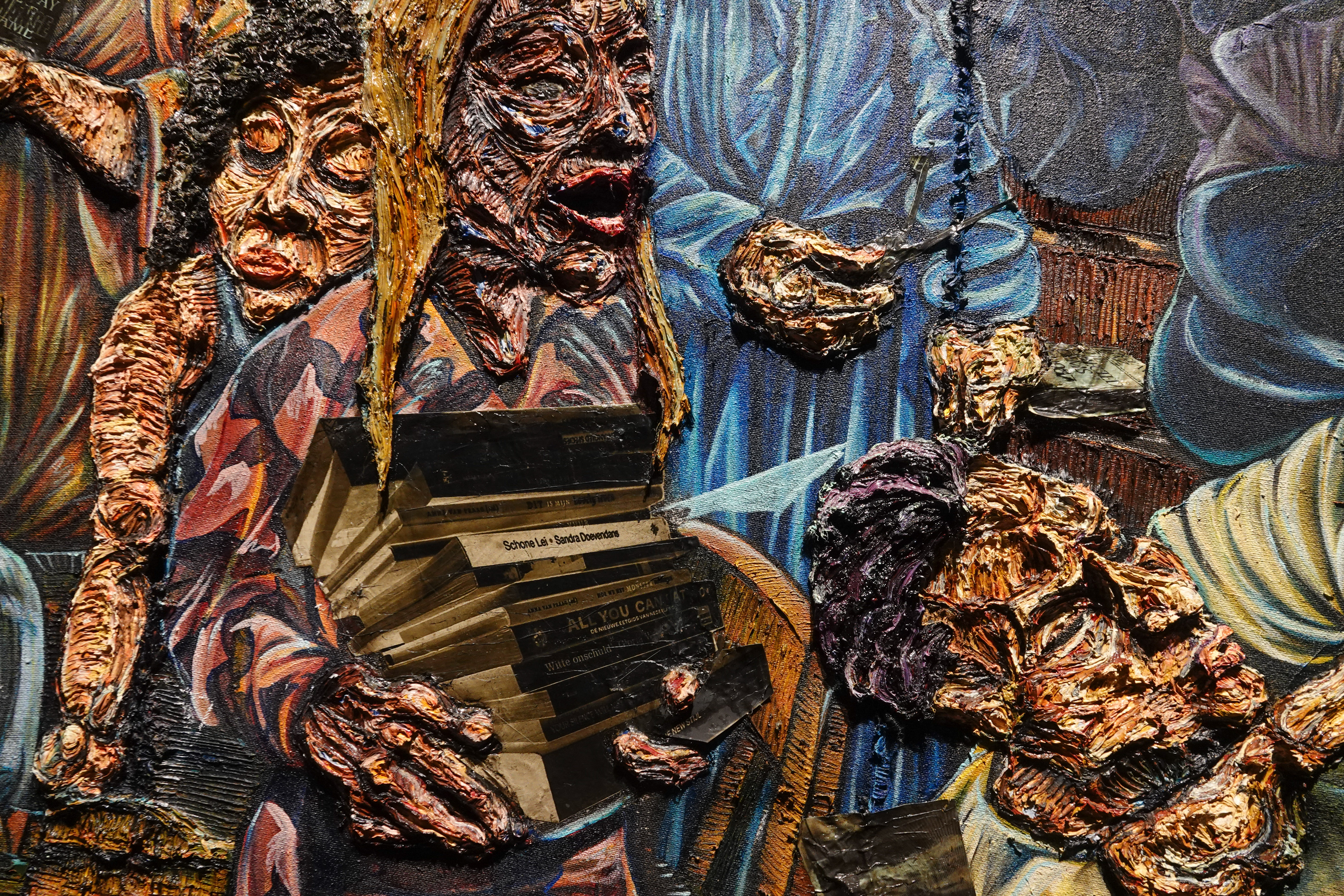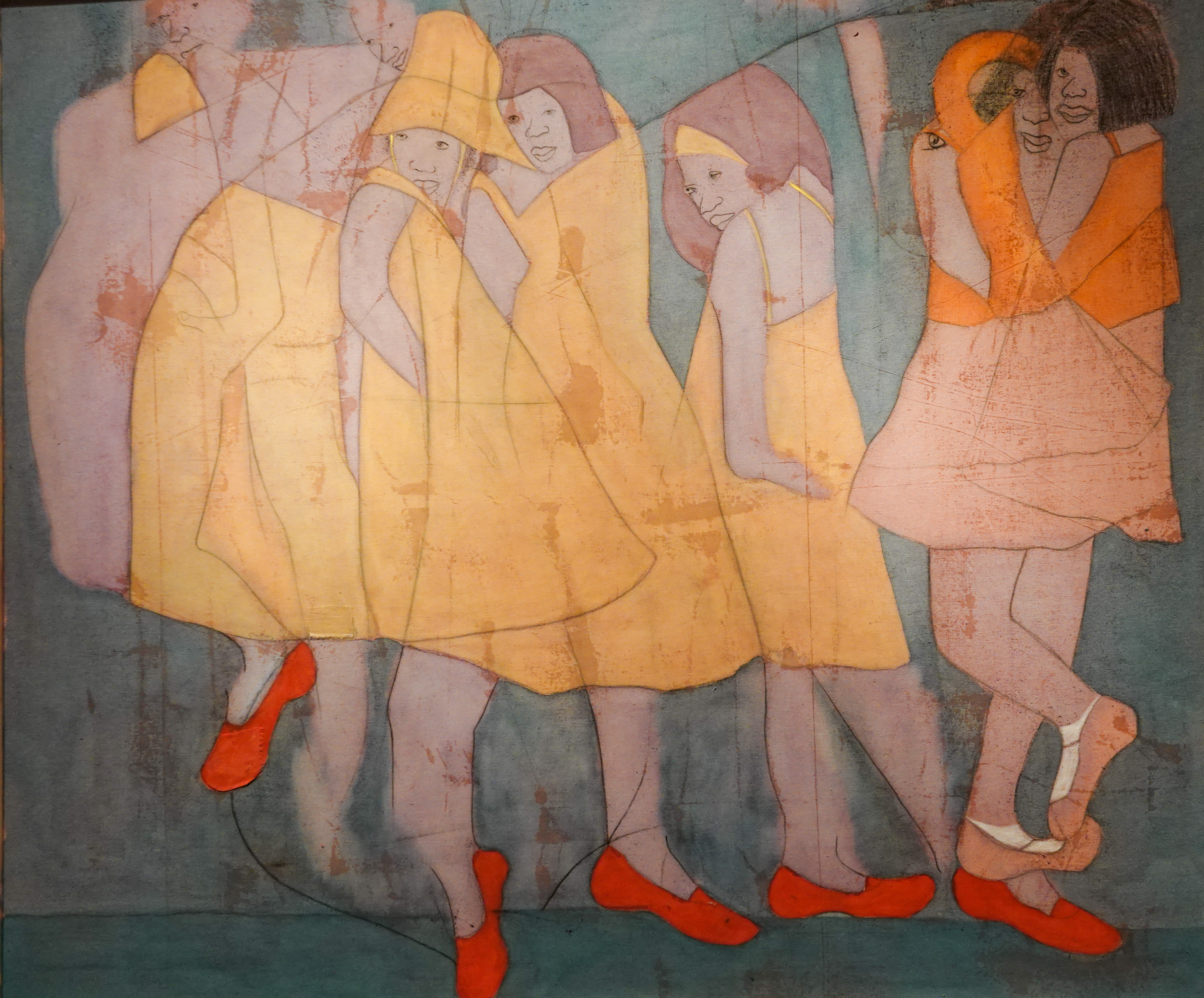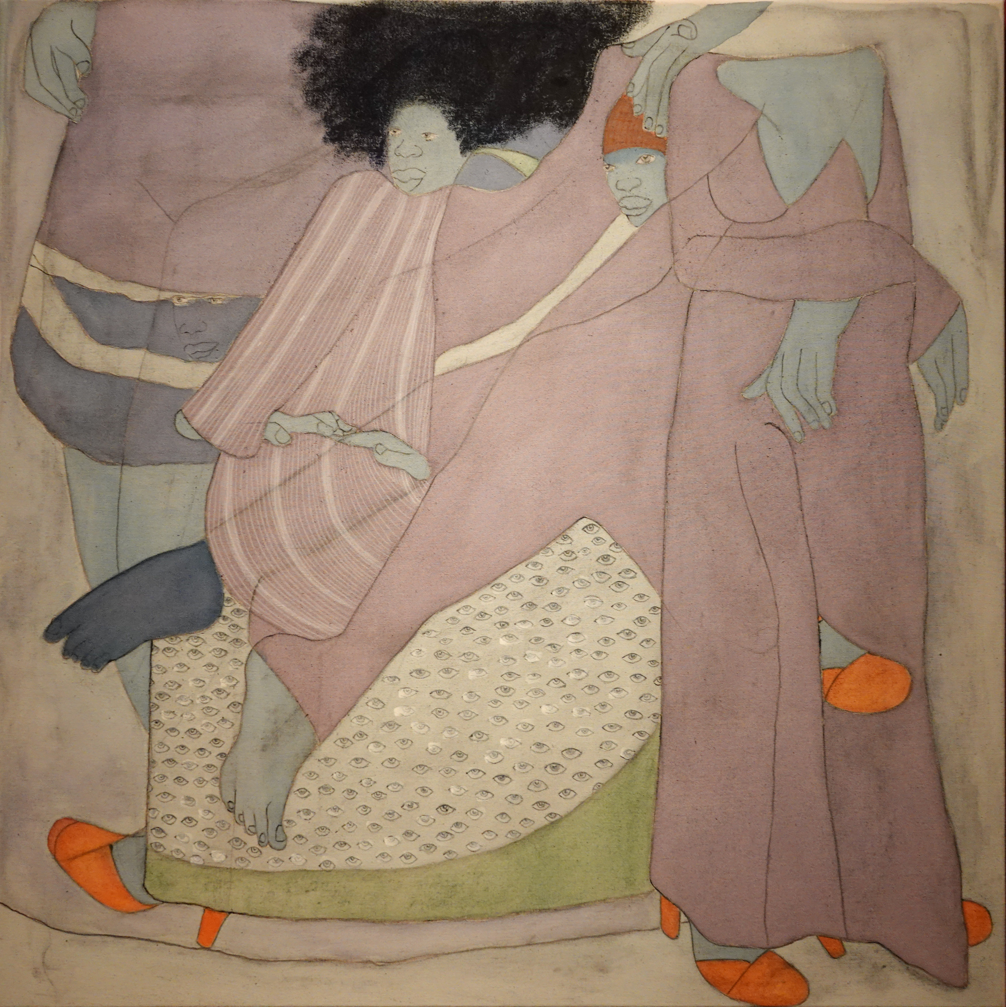De werken van Ivna Esajas houden het midden tussen tekeningen en schilderijen. De voorstellingen van mensen vormen een innige omstrengeling, waardoor je niet weet bij welk lichaam een gezicht, arm of been hoort.