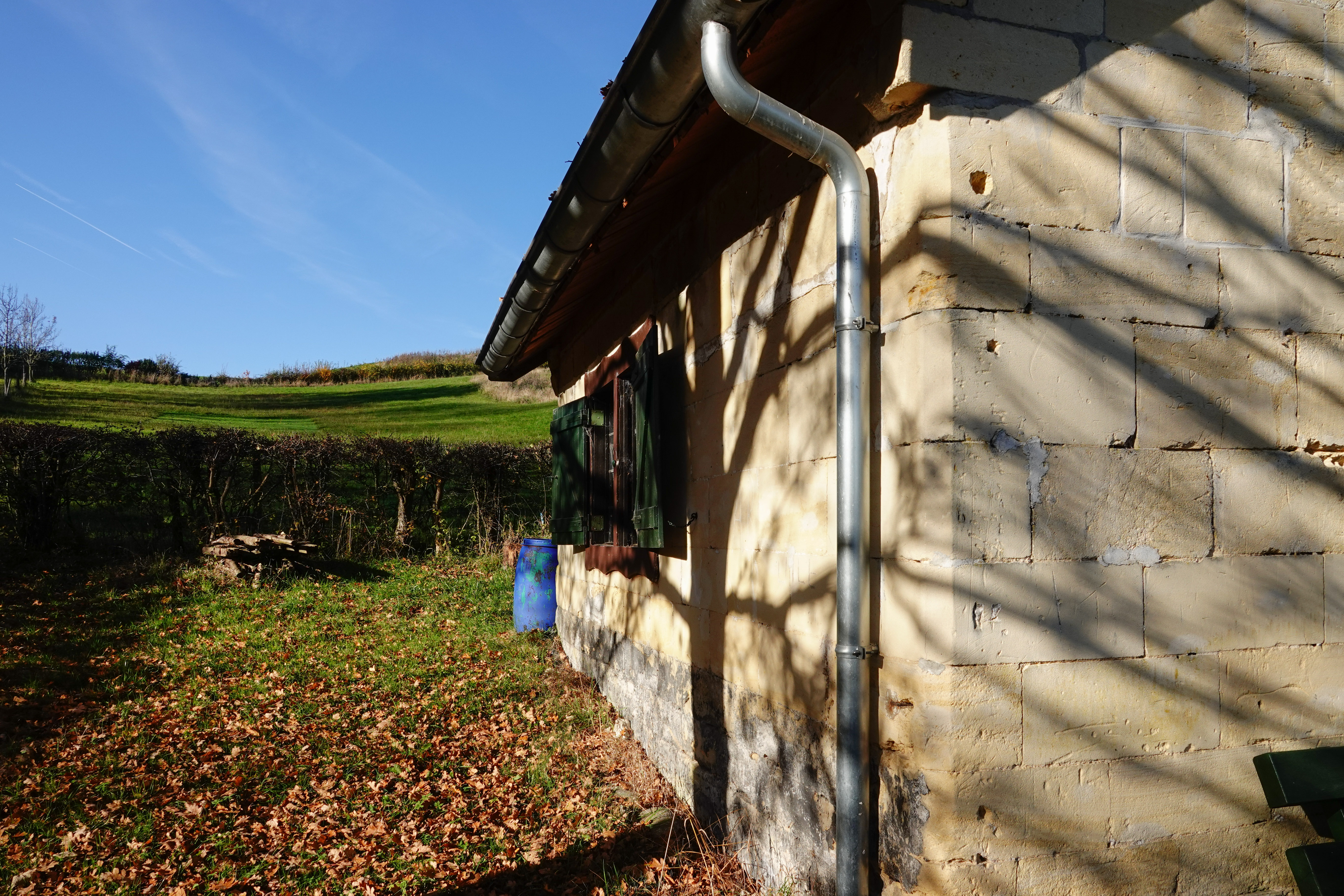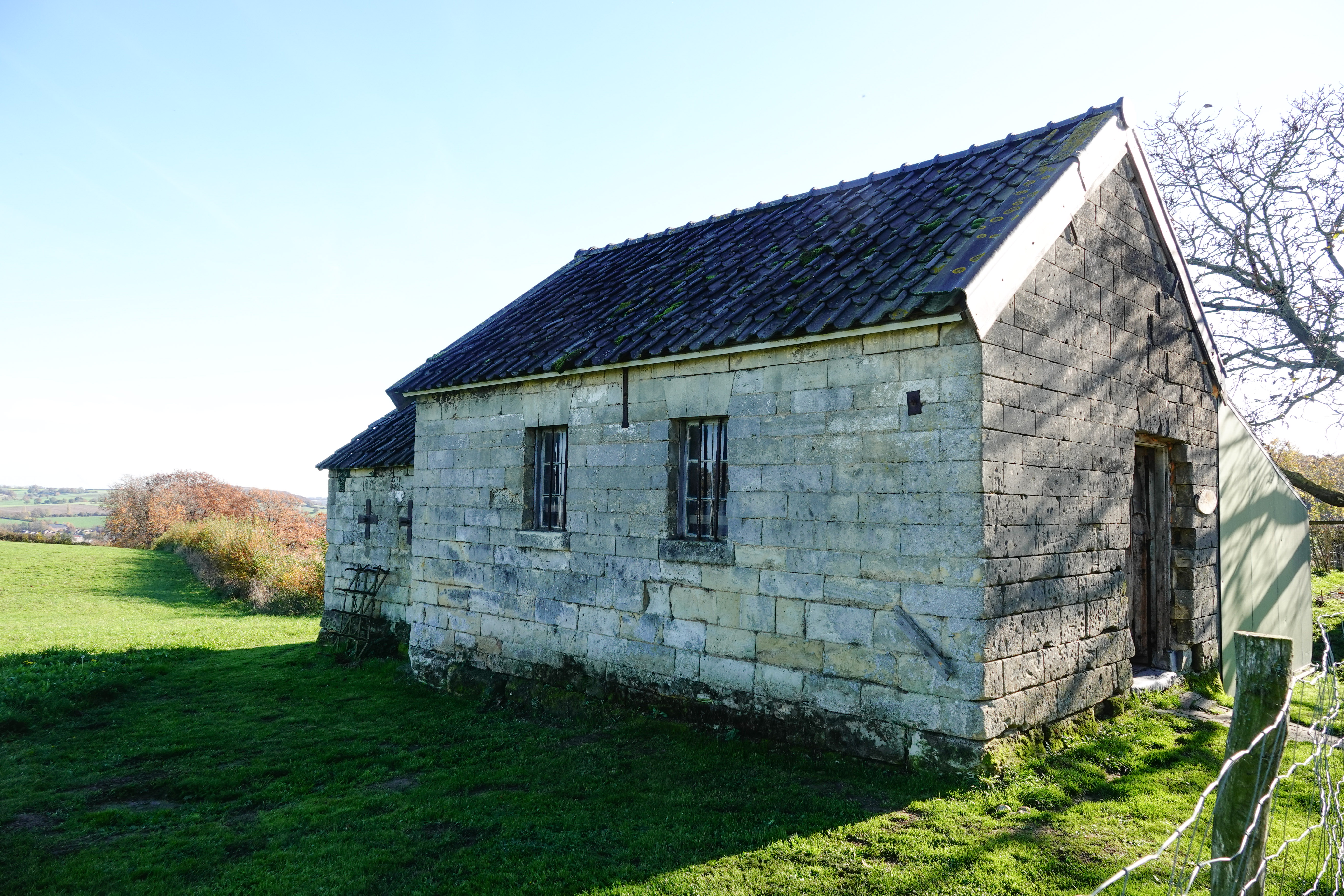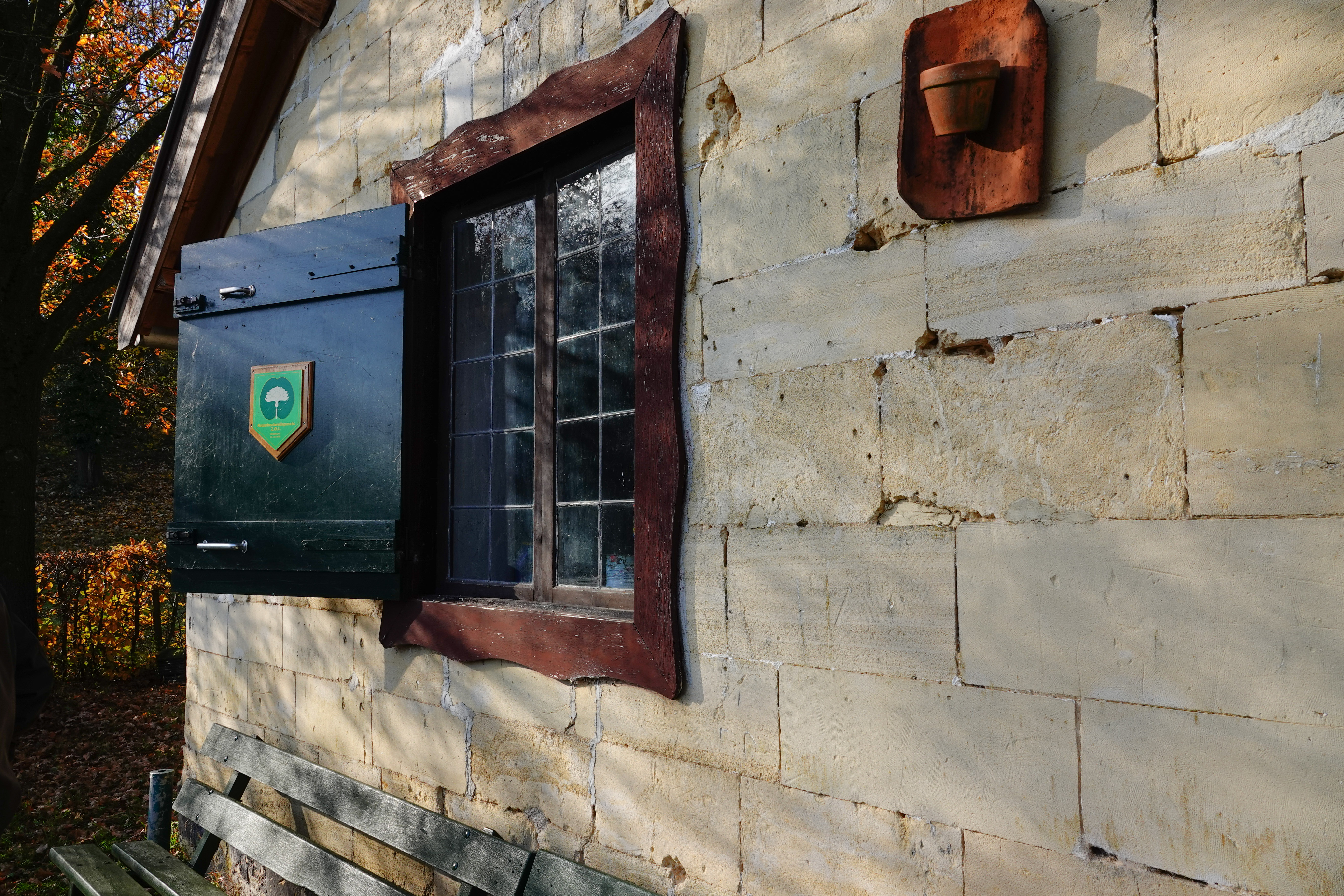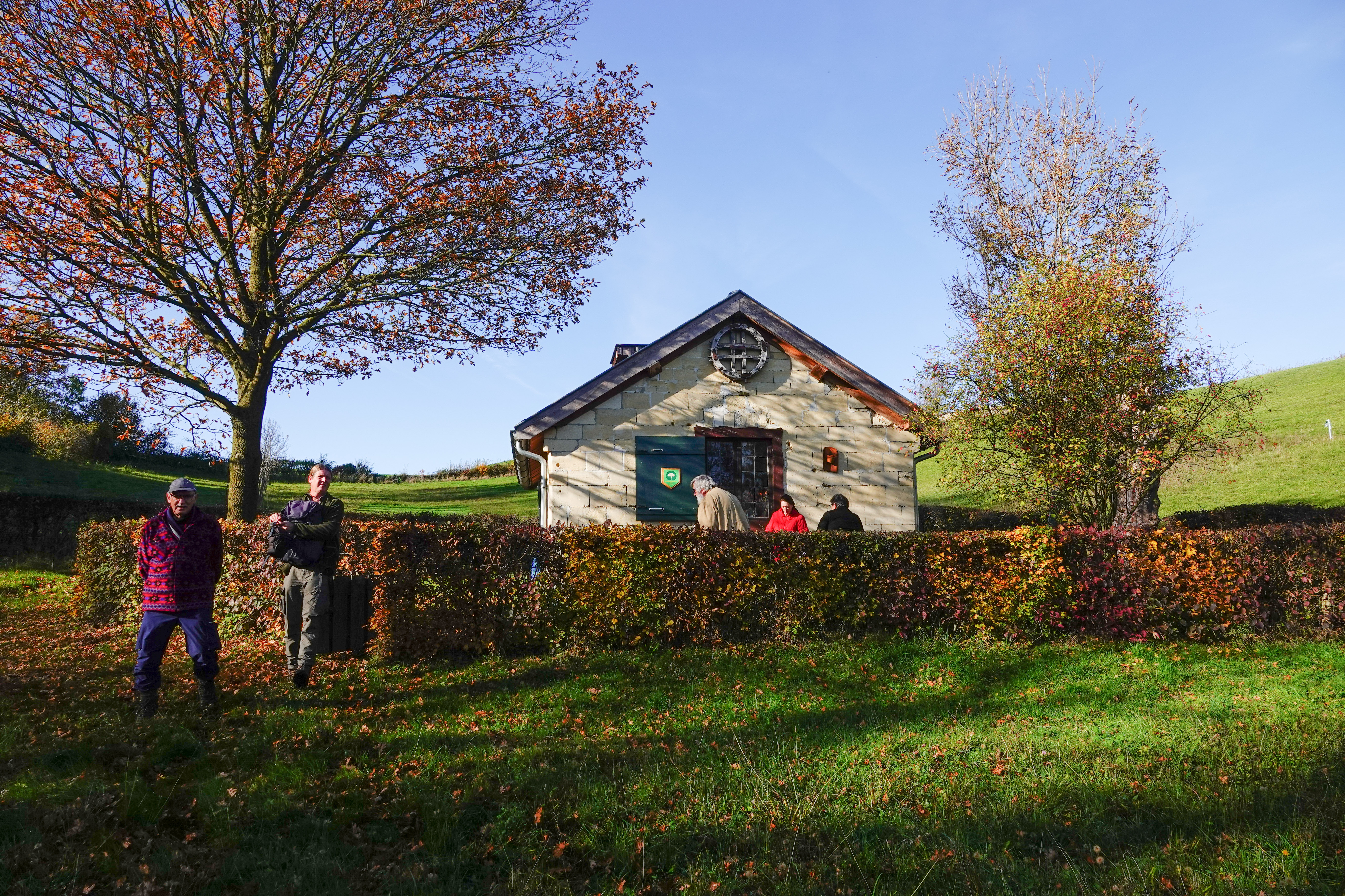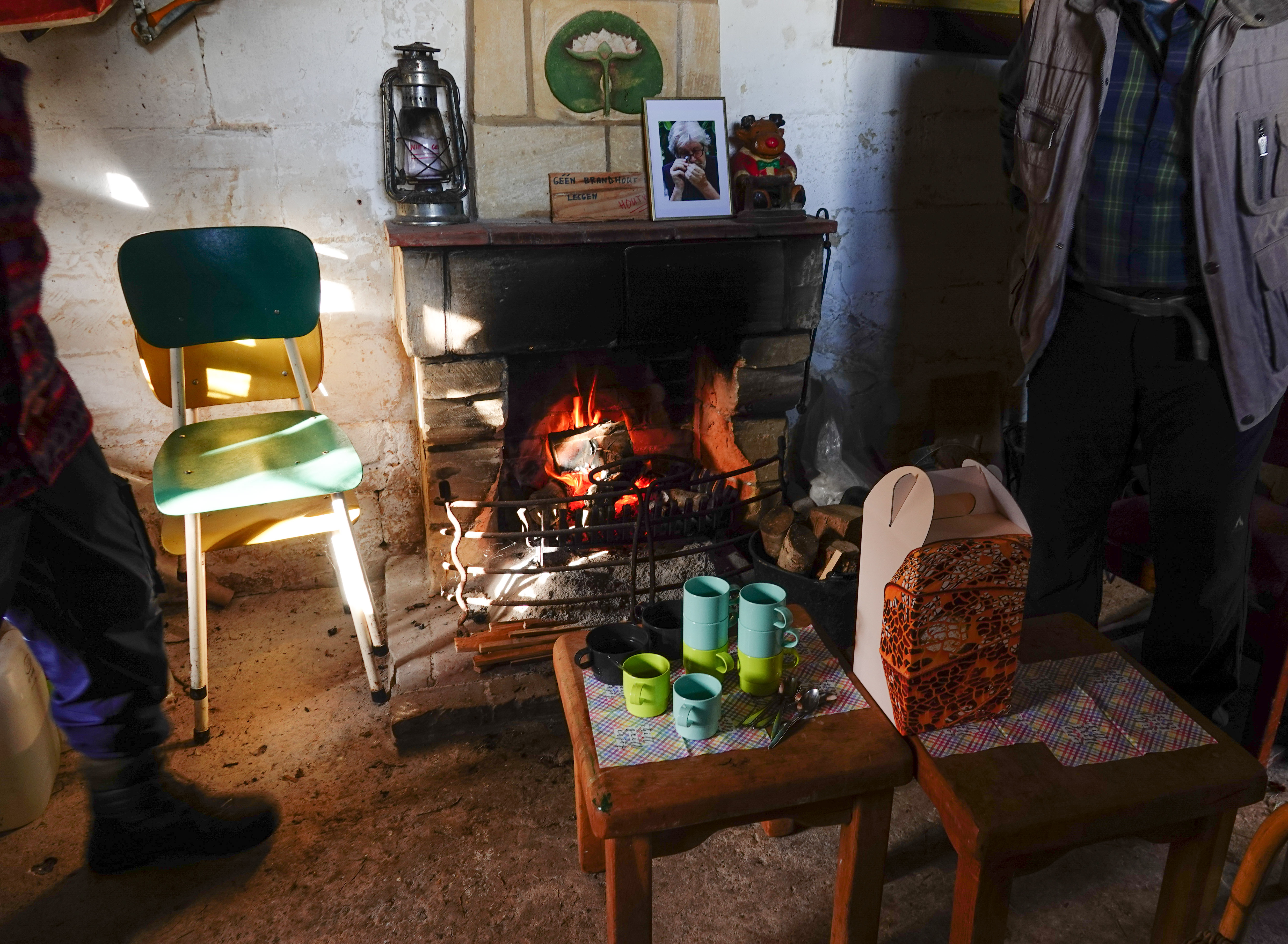 Er hoort een huisje bij, opgetrokken uit mergelsteen, dat dient om de werkers, die de boel onderhouden, zo nodig beschutting te geven, opslag van materialen, zoals stokjes om vindplaatsen van orchideeën mee te markeren en soms ook voor natuureducatie. En zoals vandaag, nogmaals mijn broer herdenken.