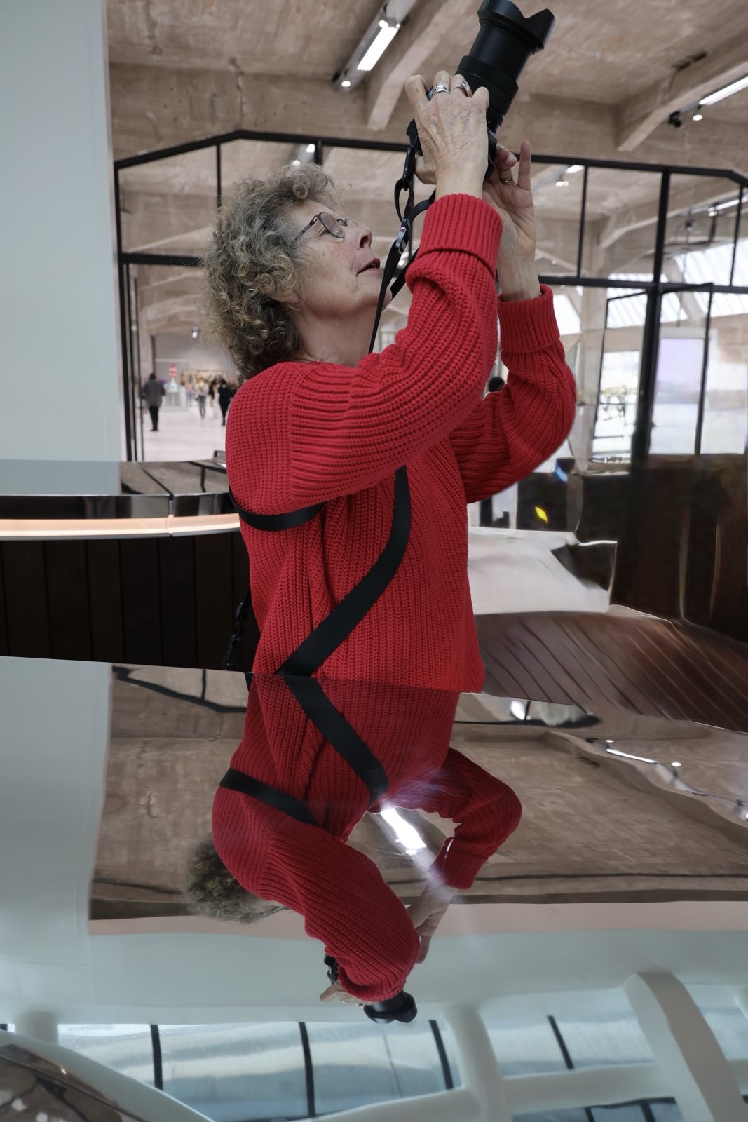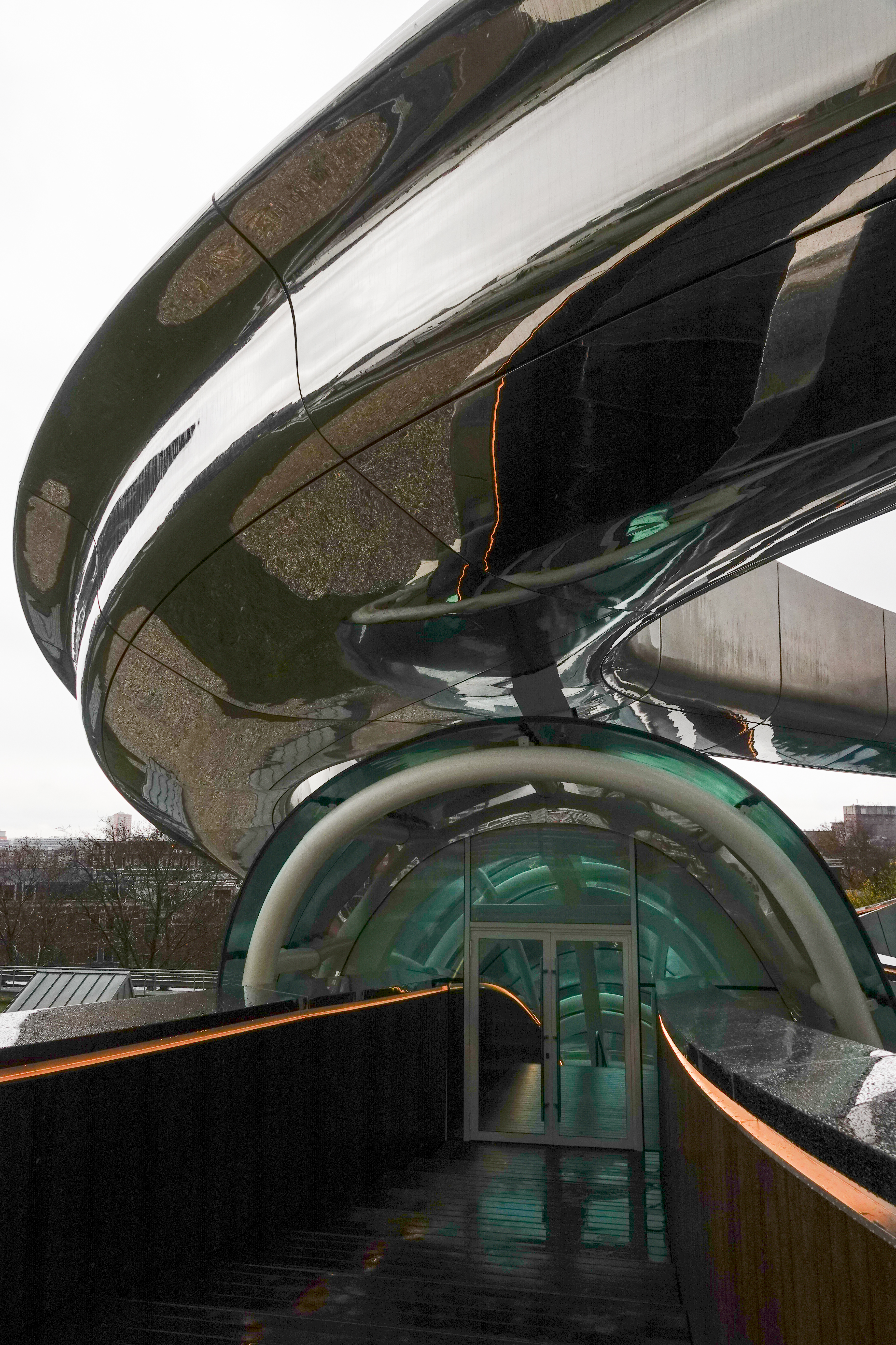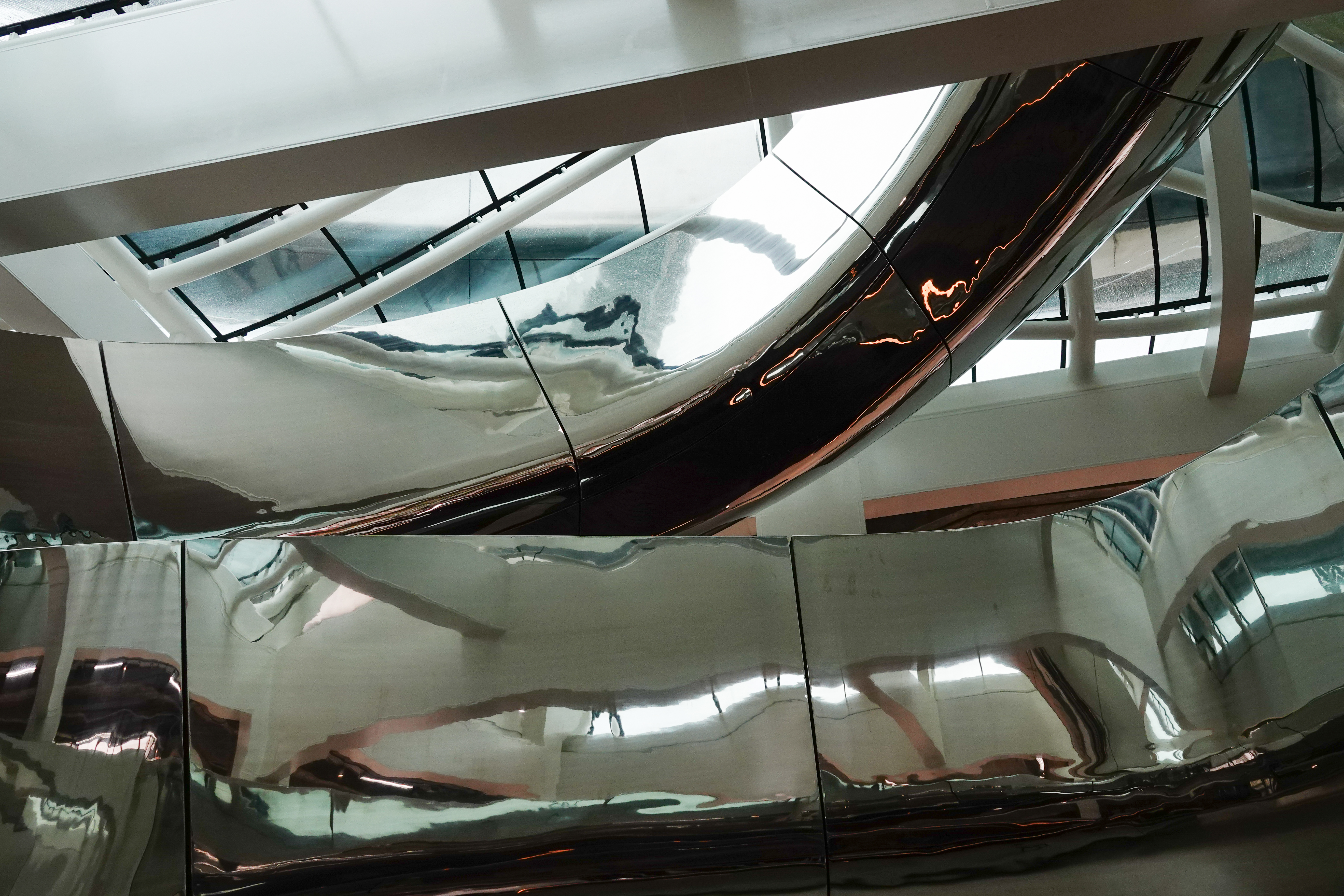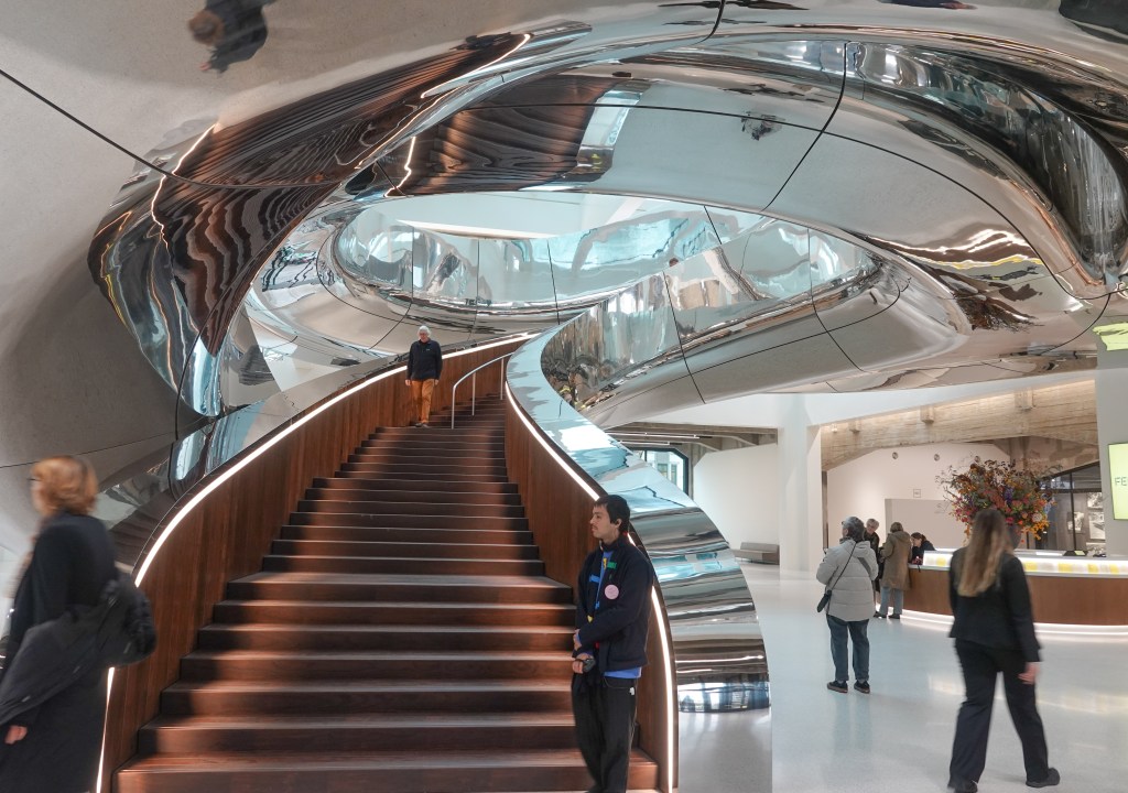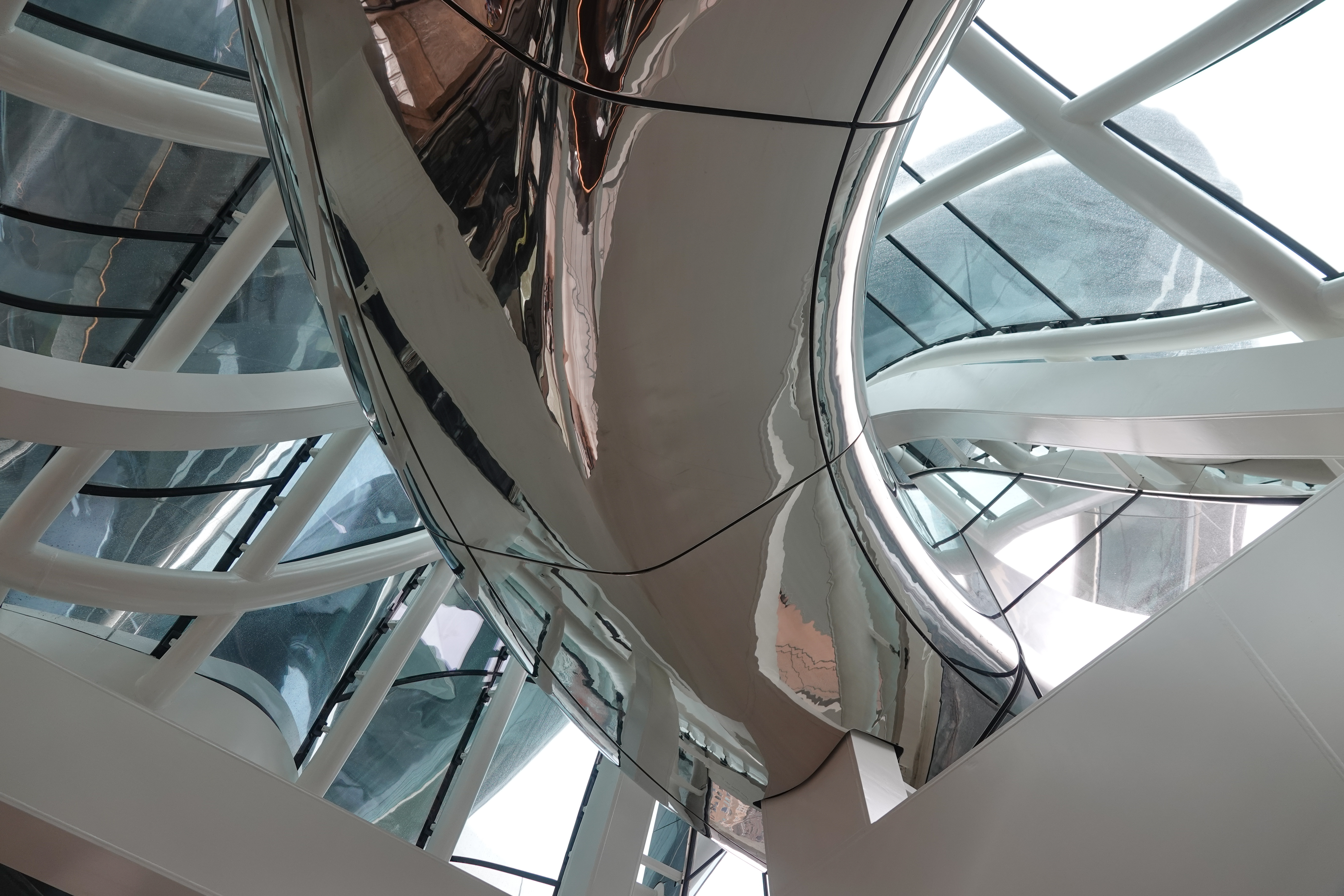 Het is eigenlijk een dubbel gedraaide trap, een futuristische toevoeging aan de ruim honderd jaar oude loods ontworpen door architect Ma Yansong, die omhoog wervelt naar een panoramadek boven het dak. Een kunstwerk en uitkijkpunt in één. Door de ronde vormen lijkt de Tornado in beweging te staan. Daarmee weerspiegelt het ontwerp de reuring en geschiedenis van de kades. De trap is gemaakt van spiegelend staal en M en ik raakten meteen geobsedeerd door al de spiegelingen, die de kronkelende buizen lieten zien.