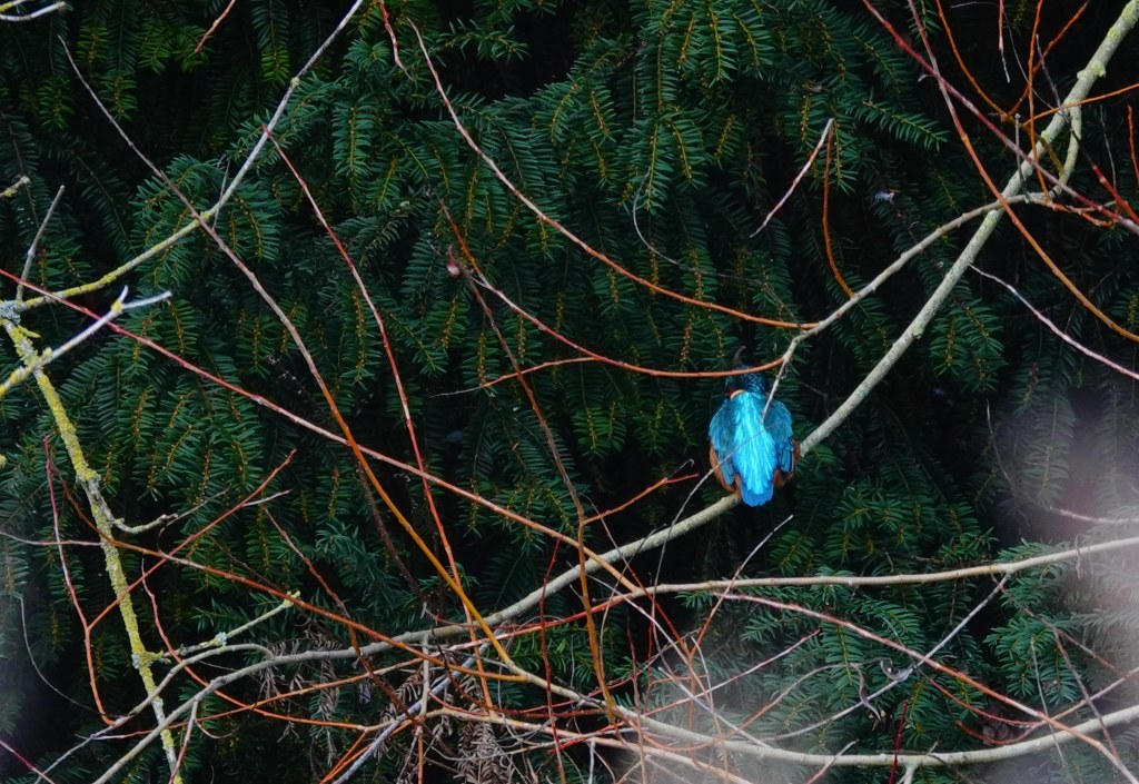 En als toetje zag ik de ijsvogel zitten aan de achterkant van het park. Helaas met zijn rug naar me toe en op een behoorlijke afstand. Maar de schitterende blauwe kleur was ontegenzeglijk de kleur van de ijsvogel. Met deze foto ben ik al blij, maar ik hoop toch, dat ik hem nog eens in een mooiere actiestand op de foto krijg. Zo blijft er wat te wensen en heb ik een doel om eruit te gaan!