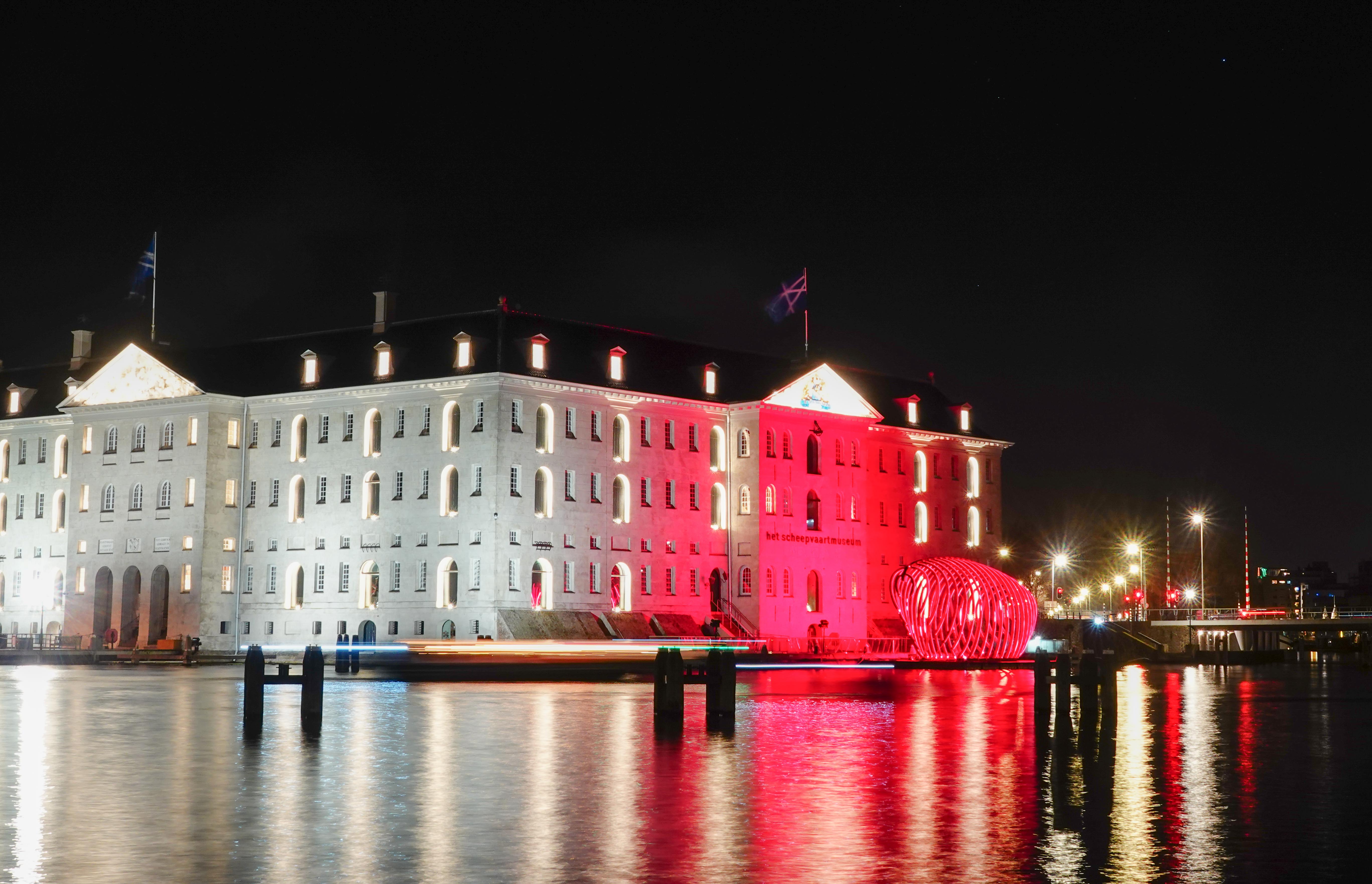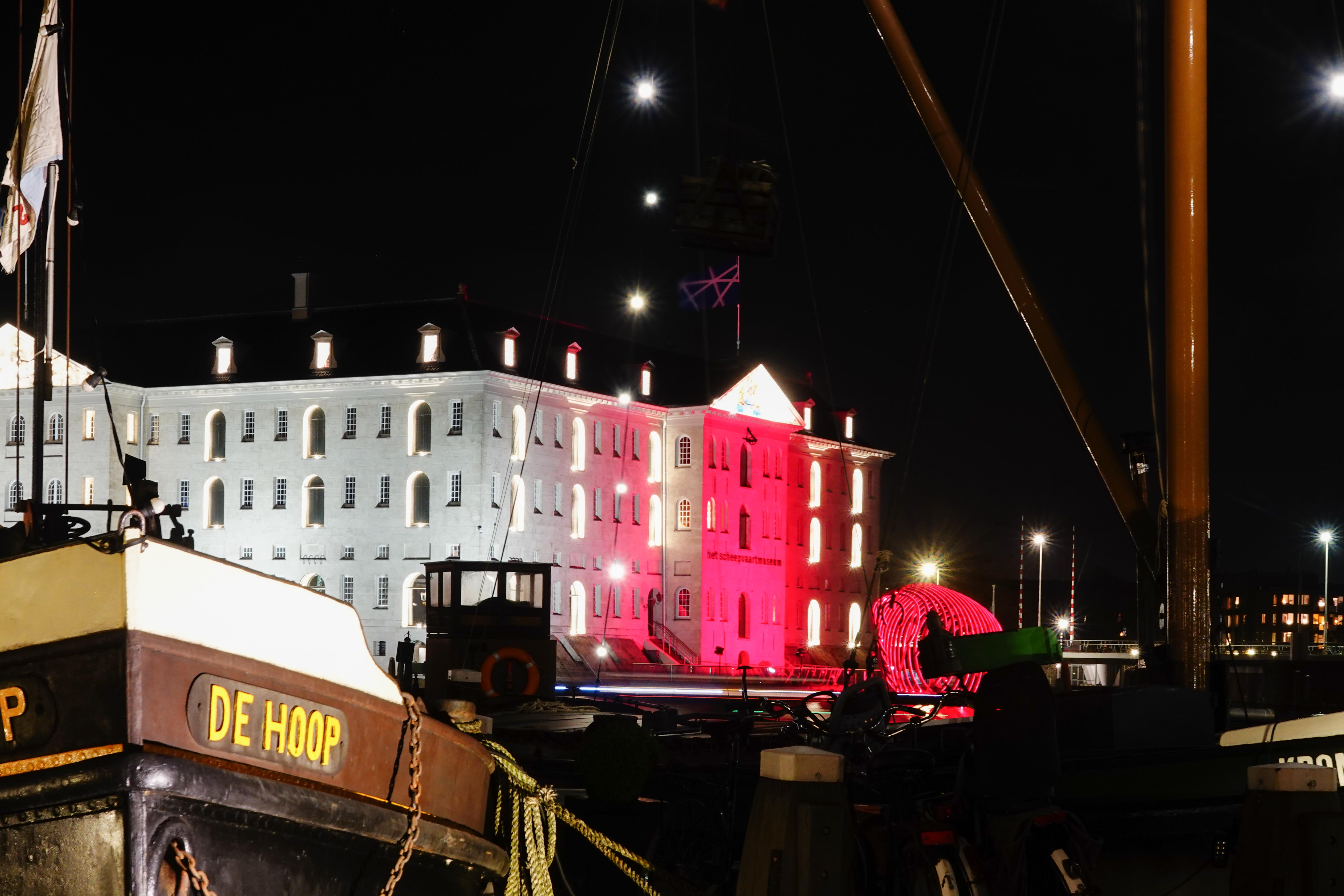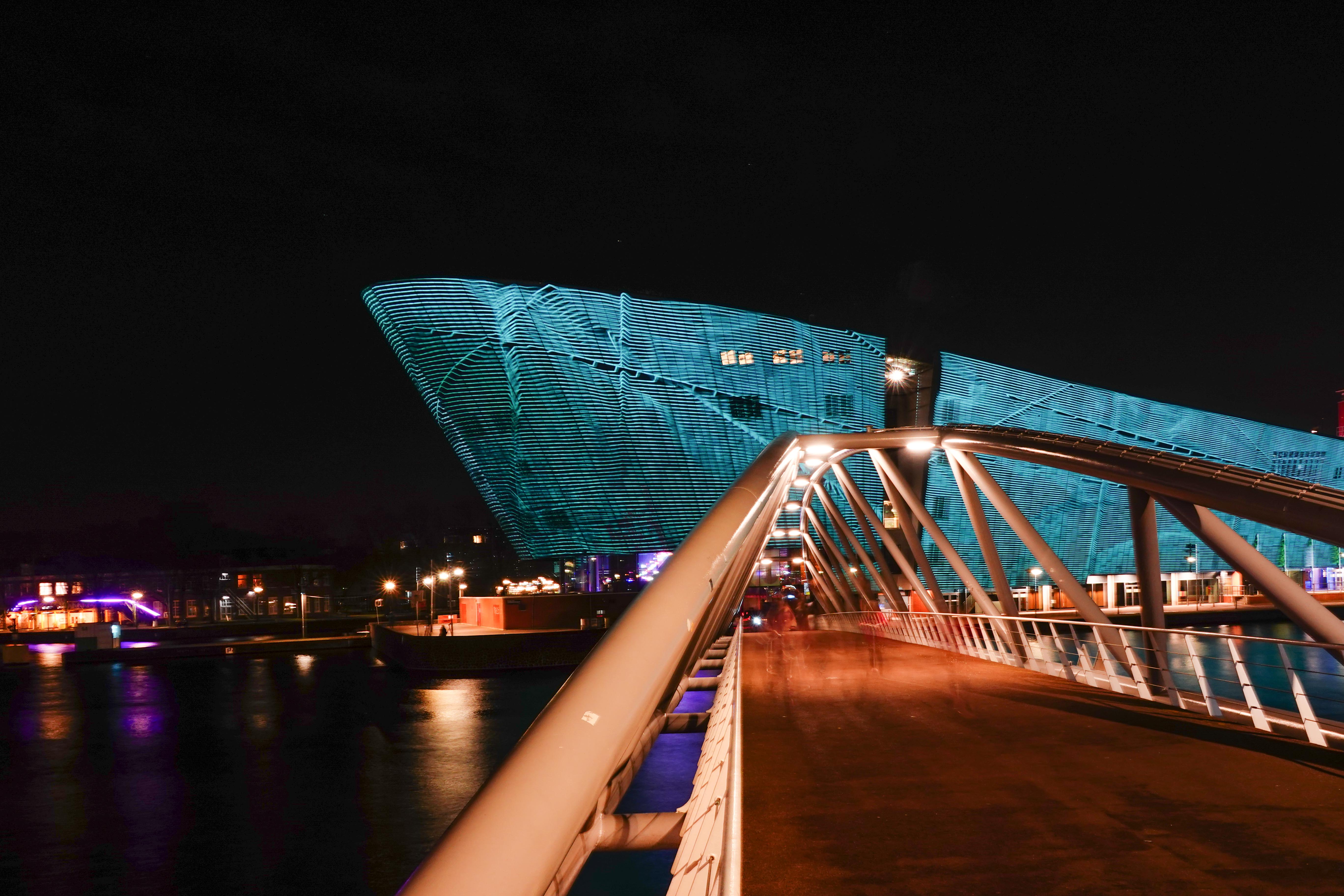 Samen met fotomaten trokken we de stad in om lichtkunstwerken van het Lightfestival te gaan fotograferen. Avondfotografie vraagt weer een heel andere techniek, die ik best moeilijk vind om te doen. De foto’s moeten op statief genomen worden, vanwege de lange sluitertijden die nodig zijn, want je wilt niet alles bewogen in beeld hebben. We startten bij NEMO. Dat gebouw had als lichtobject een indrukwekkende wisselende beeldprojectie op zijn buitenkant. Een uitdaging om dat scherp te krijgen.
