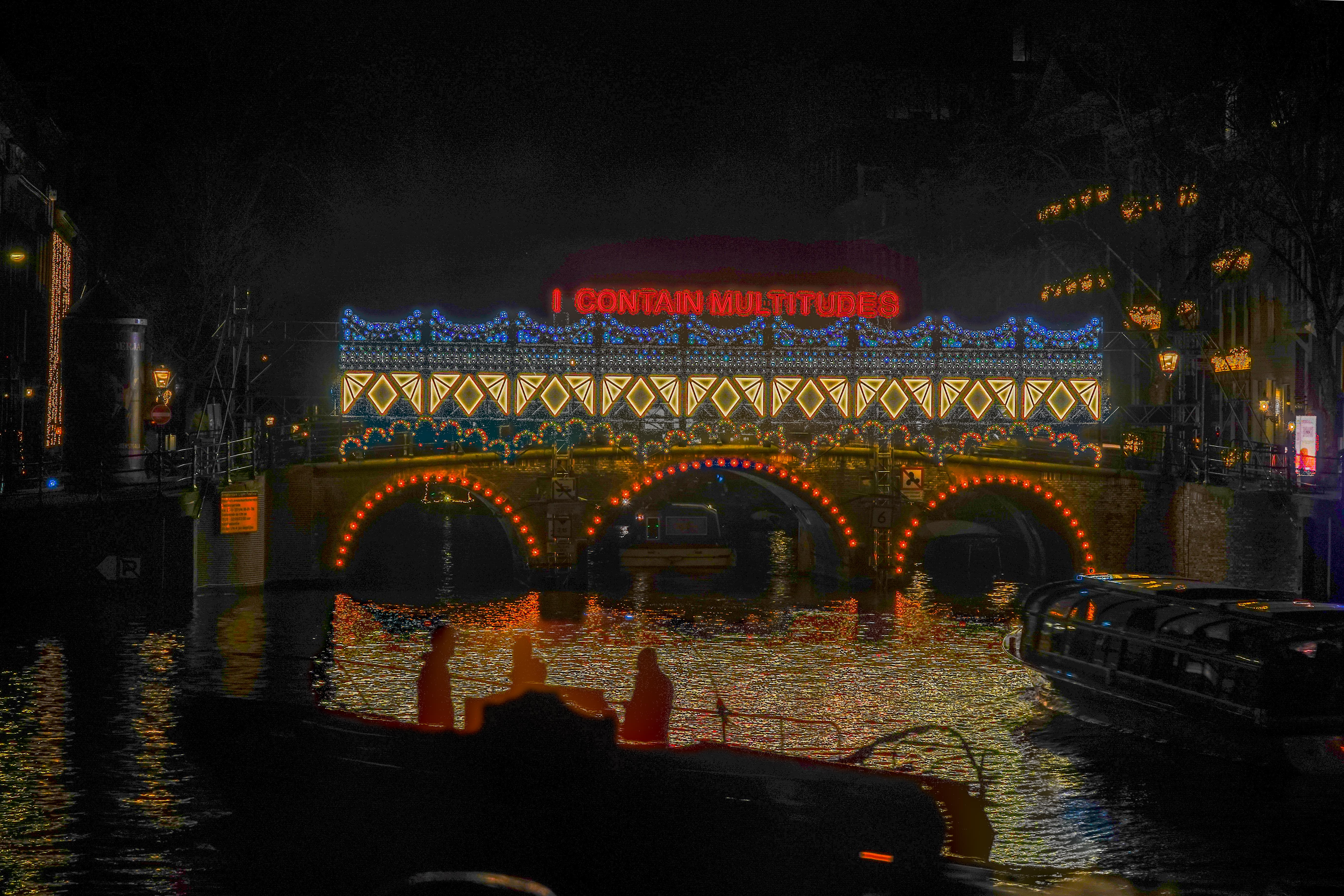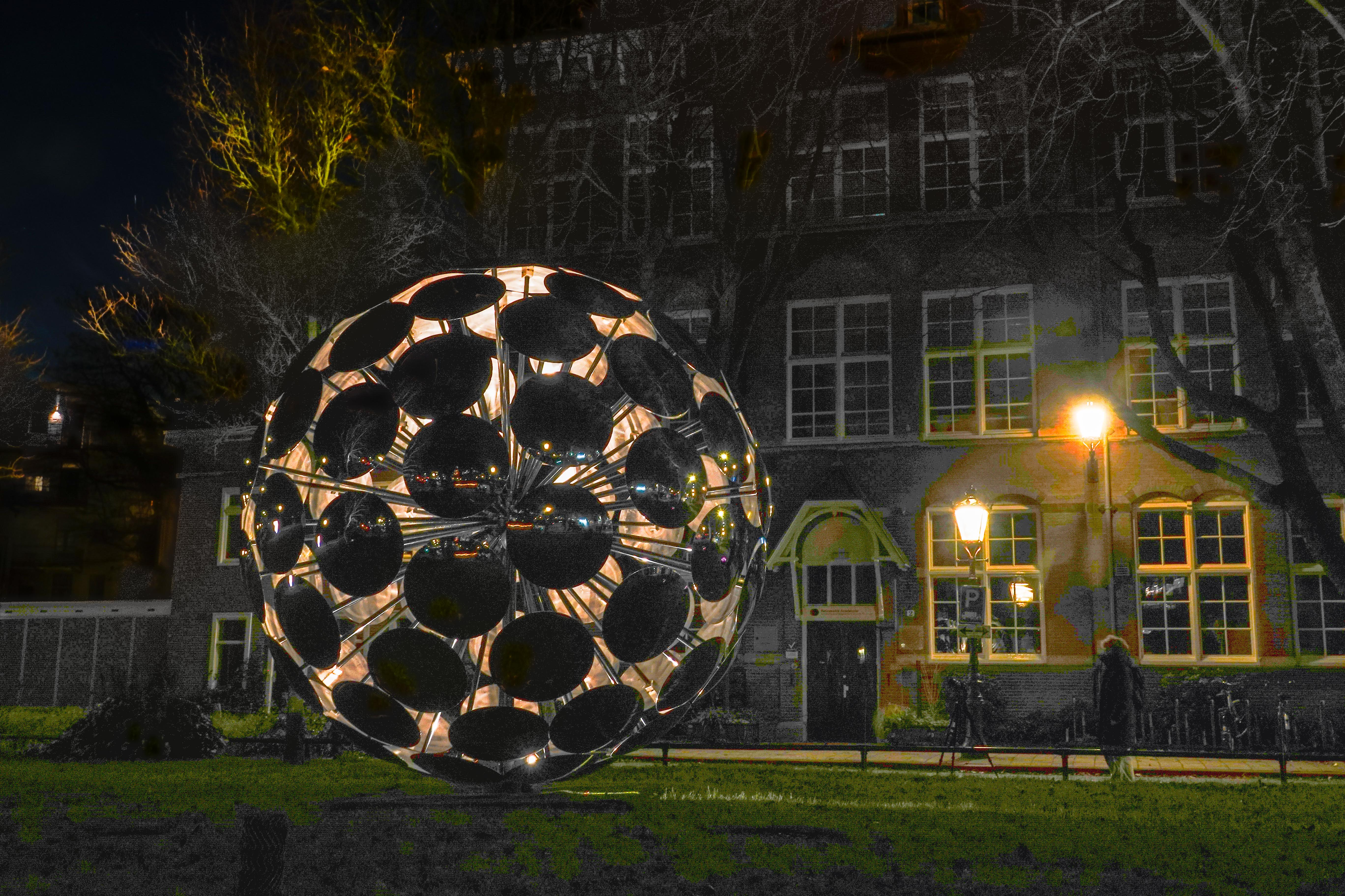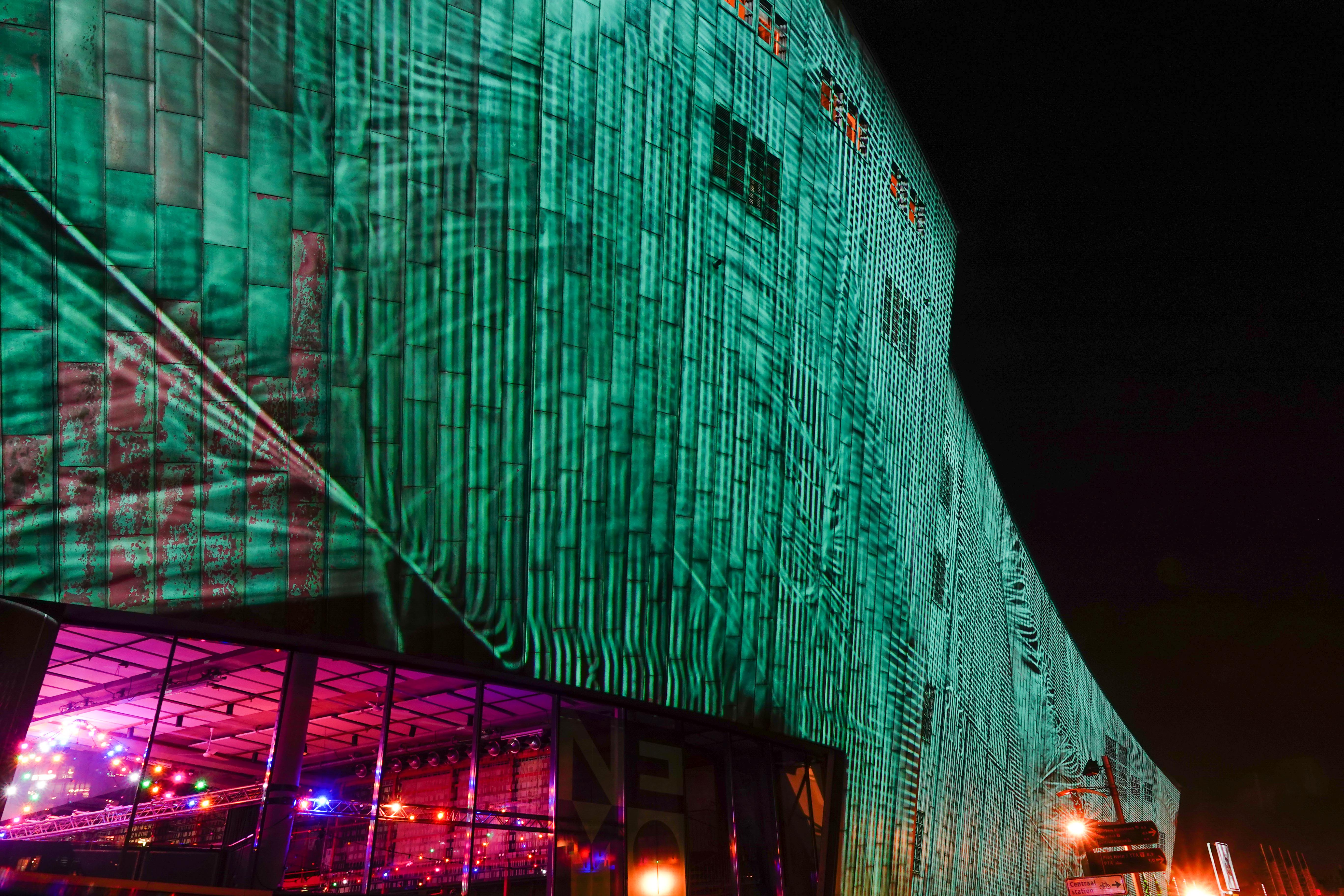 Samen met fotomaten trokken we de stad in om lichtkunstwerken van het Lightfestival te gaan fotograferen. Avondfotografie vraagt weer een heel andere techniek, die ik best moeilijk vind om te doen. De foto’s moeten op statief genomen worden, vanwege de lange sluitertijden die nodig zijn, want je wilt niet alles bewogen in beeld hebben. We startten bij NEMO. Dat gebouw had als lichtobject een indrukwekkende wisselende beeldprojectie op zijn buitenkant. Een uitdaging om dat scherp te krijgen.