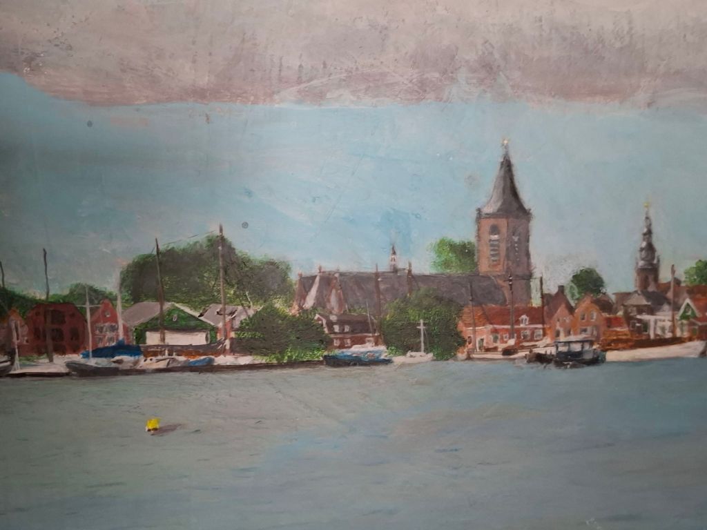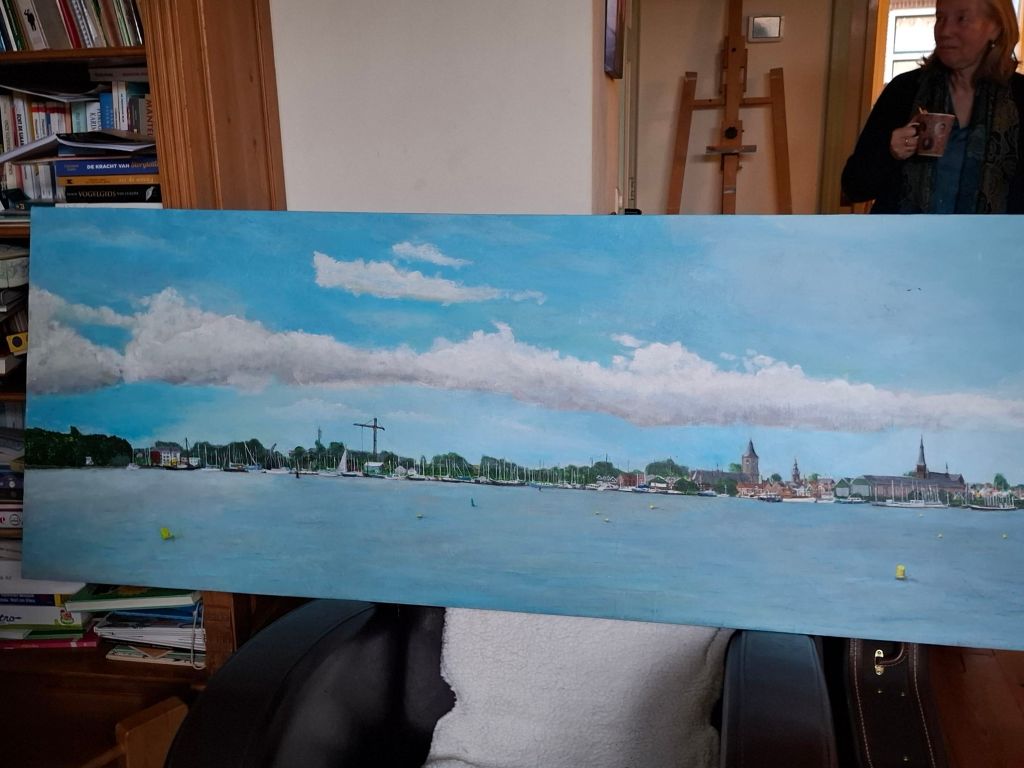 We dronken koffie en M liet ons wat van zijn schilderskunsten zien. Zo is hij bezig met een landschapsschilderij met de skyline van Monnickendam erop naar voorbeeld van een foto van mij. Het ziet er veelbelovend uit.