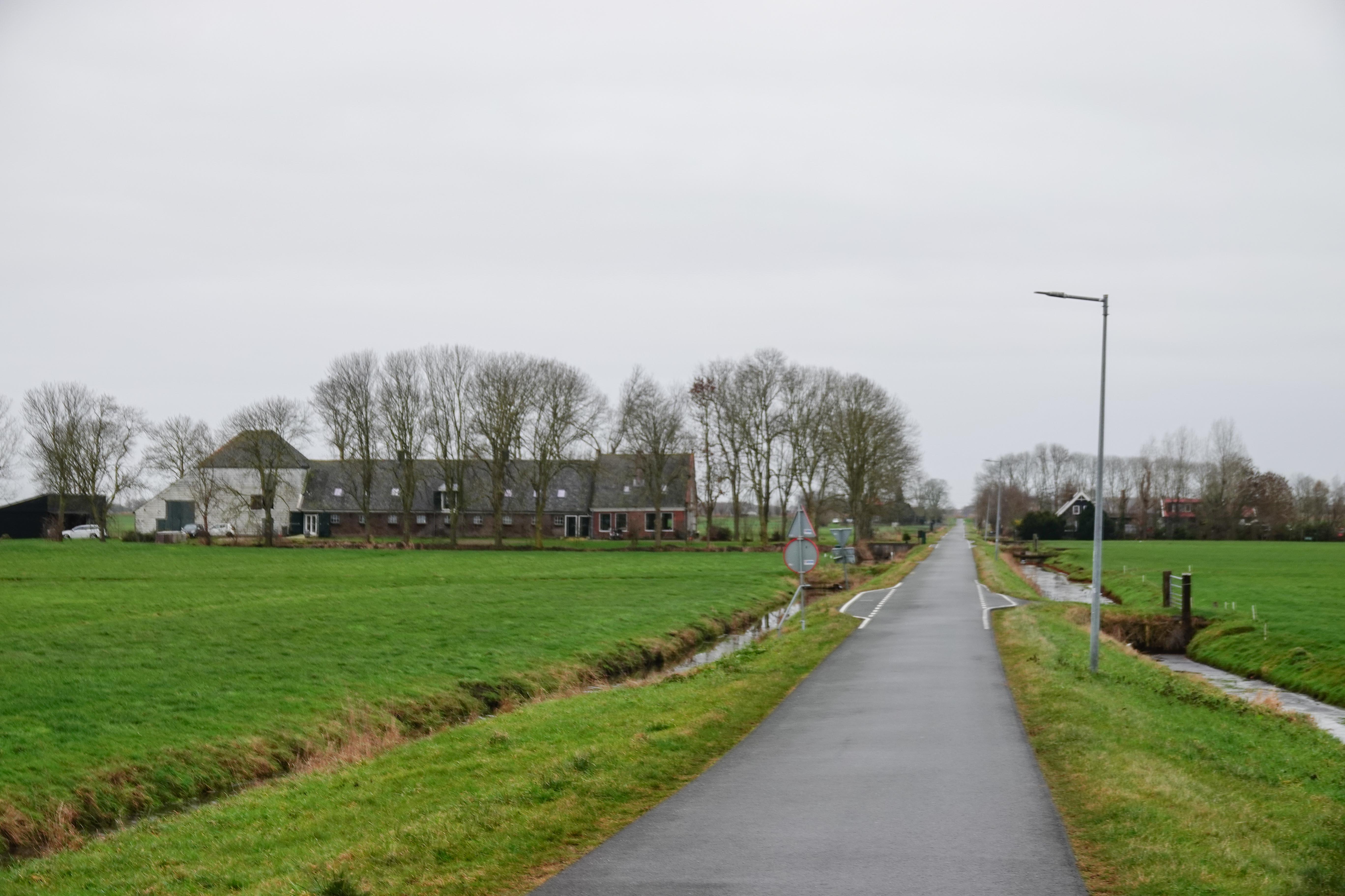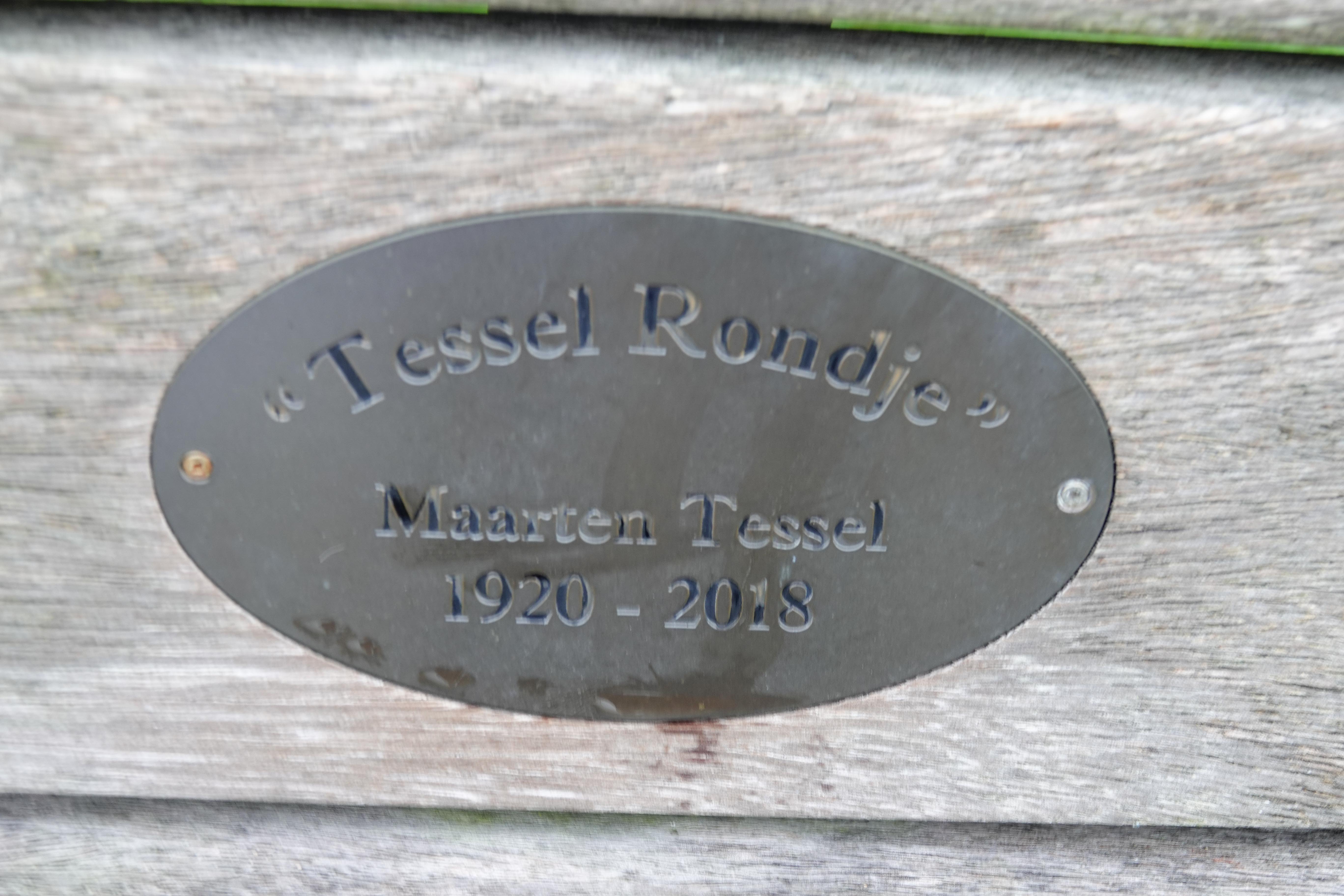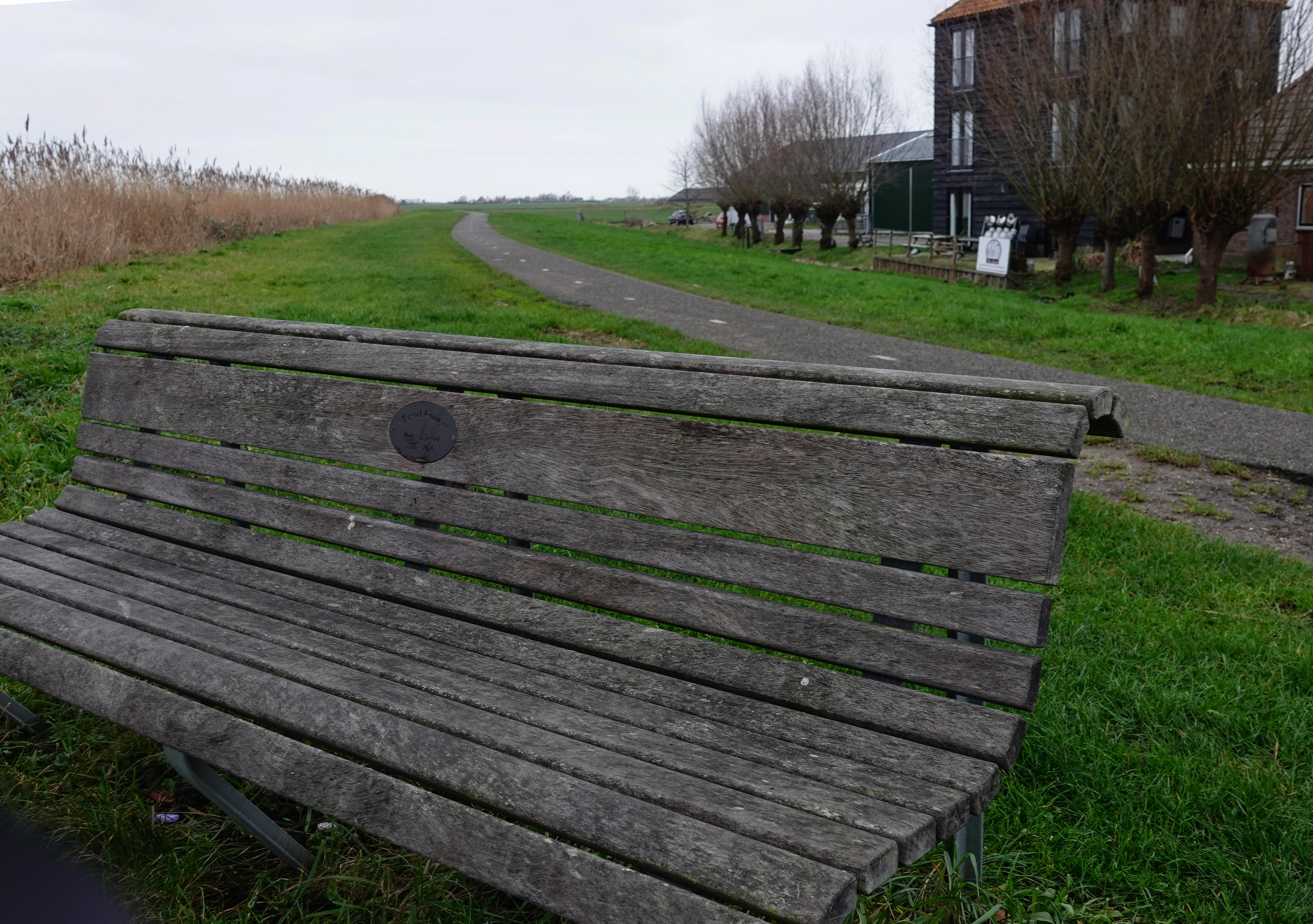 Daar waar de weg weer iets omhoog gaat kom je weer op een dijk, die rondom de polder loopt. Daar staat de bank van Maarten Tessel, een oom van mijn man, van waaruit je een mooi uitzicht hebt op De Leek. Hij is daar geplaatst door zijn 16 kinderen ter nagedachtenis. Deze Maarten liep tot op hoge leeftijd trouw zijn rondje Monnickmeer.