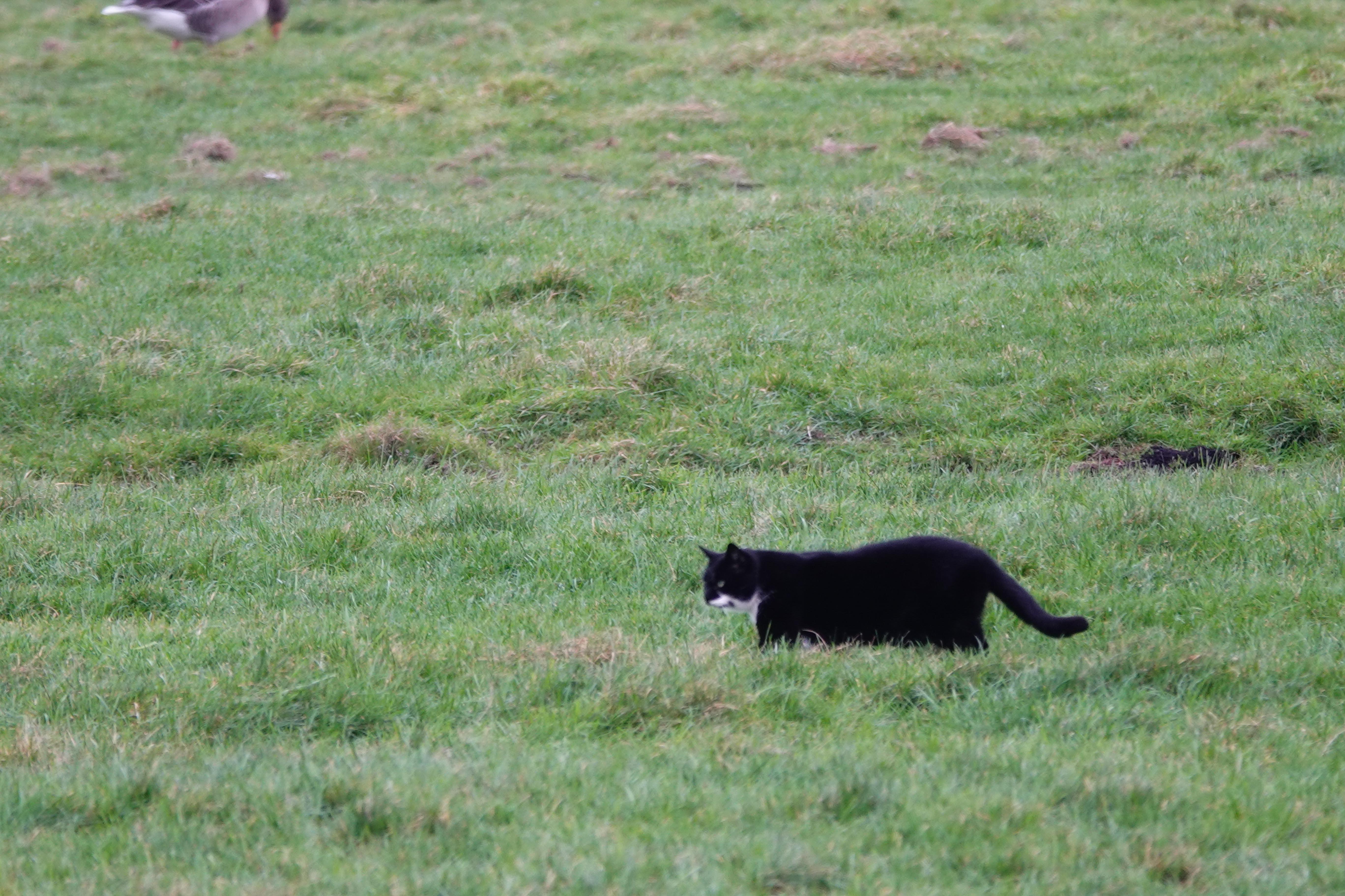 Er werd druk gejaagd. We hoorden schoten in de lucht, de ganzen die overvlogen zijn hun leven niet zeker. Maar ook in het weiland werd een prooi  gezocht.
