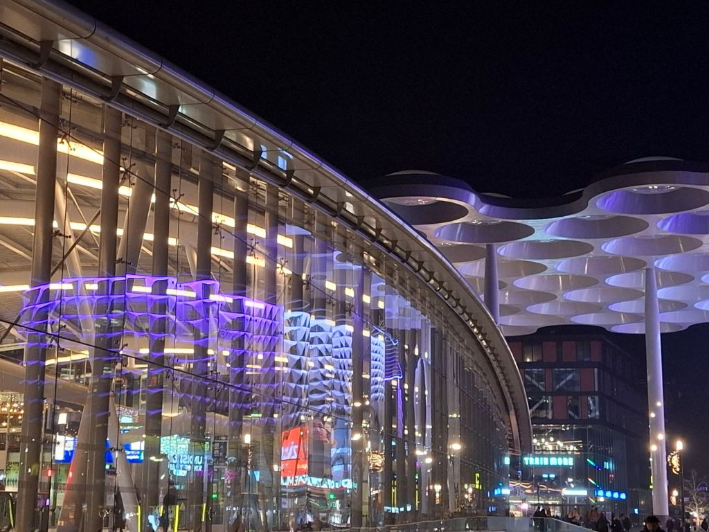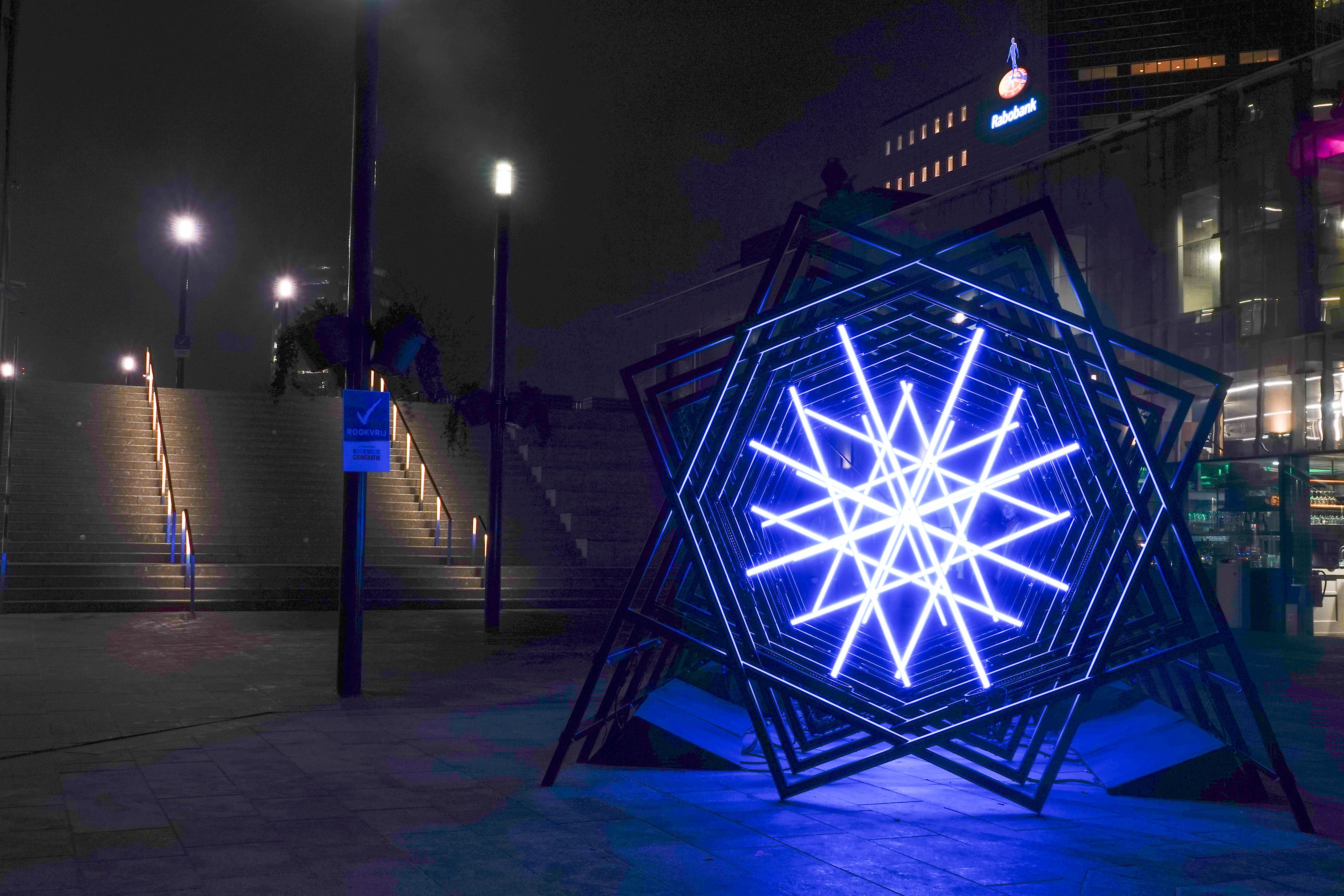 Net voor we de brug over de ns-sporen willen nemen zien we daar een soort van bewegende ster. Spica van Juanfuentestudio brengt de ster tot leven in licht, beweging en geluid. Je blijft kijken.