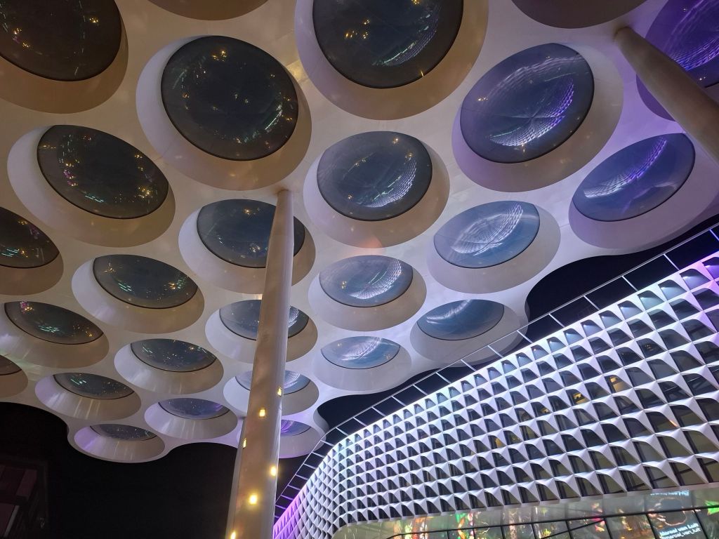 Buiten naast de grote trap, roltrap en lift naar het Jaarbeursterrein was een lichtprojectie op de gevel: Brilliance van Aleksandra Stratimirovic. Je bleef kijken, bijna hypnotiserend. De lichtjes kabbelden rustig en ritmisch, maar voor de foto bijna niet te vangen.