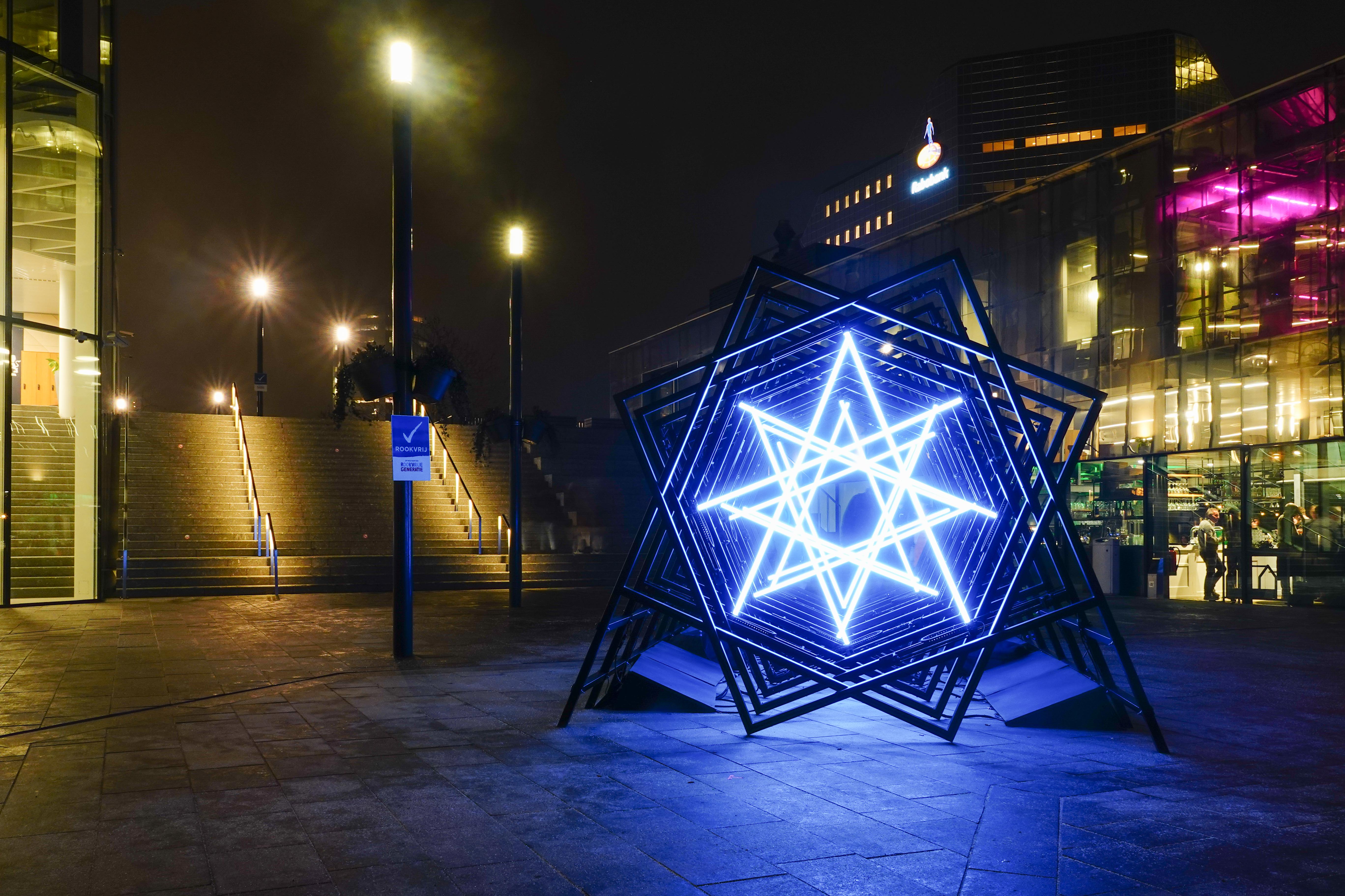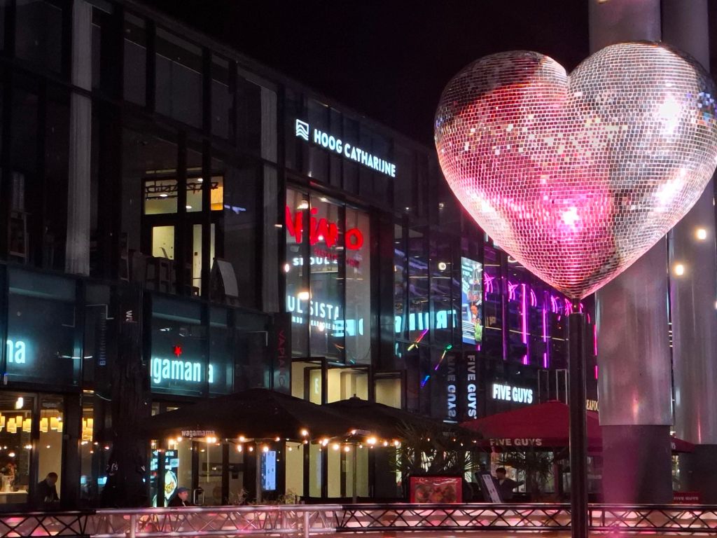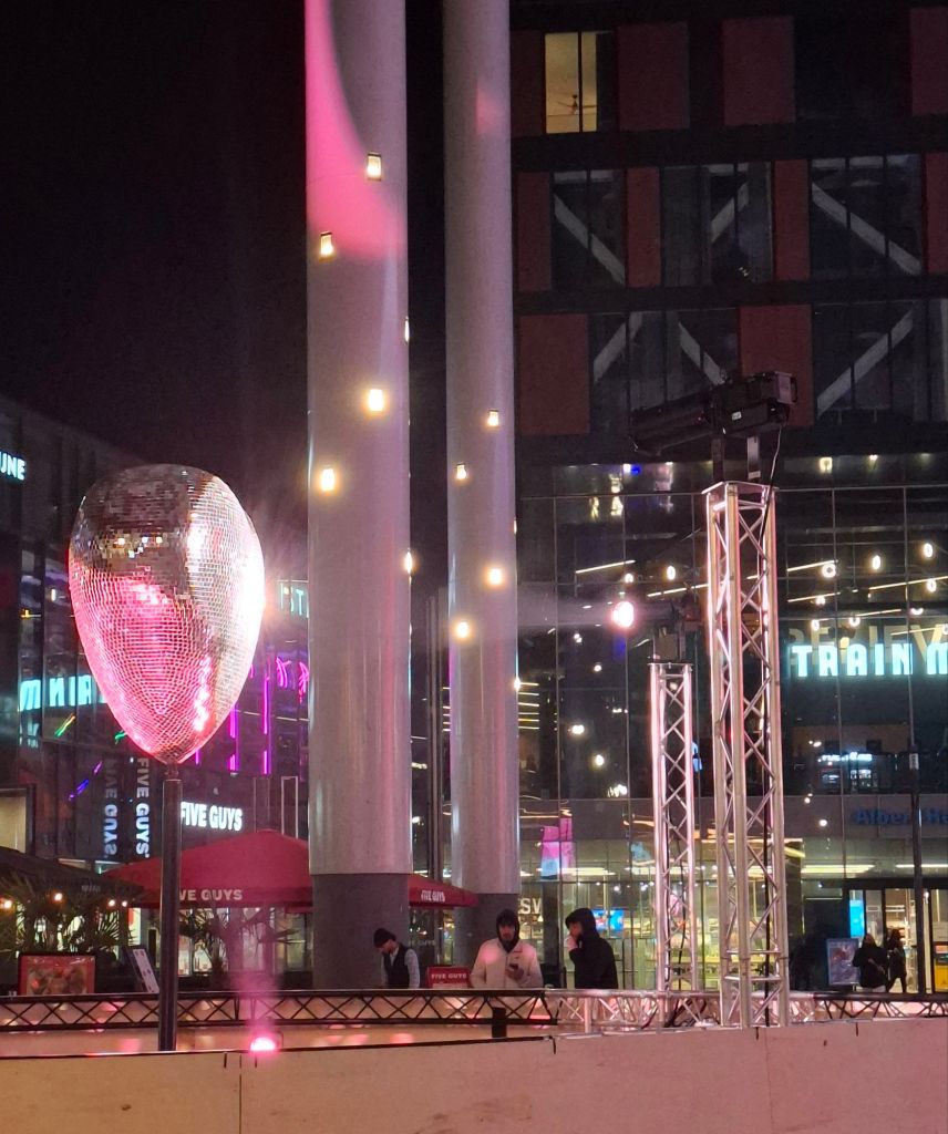 Daar bewonderden we nog twee kunstwerken. Our beating Heart van Studio Vertigo is een gigantisch hart, dat door het langzame draaien duizenden spiegelende lichtvlekken projecteert op gevels, het plein en de voorbijgangers.