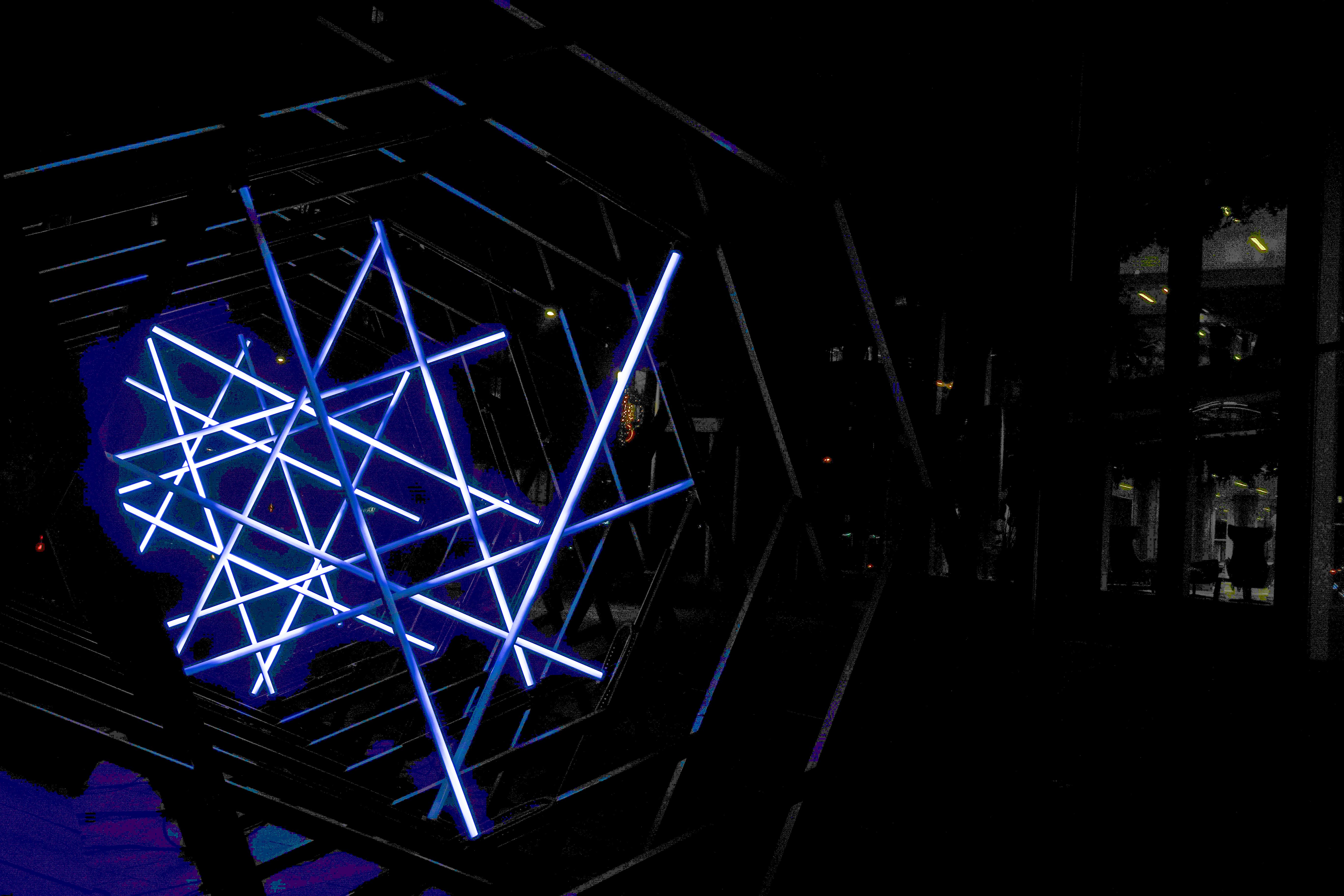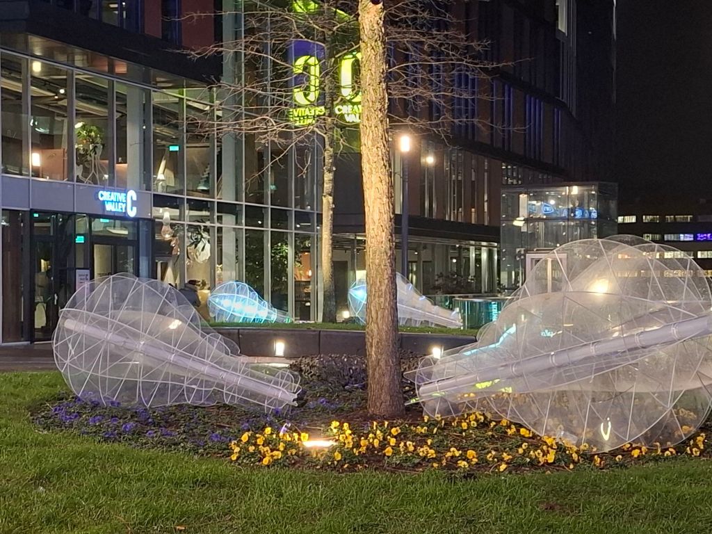 Als laatste zagen we Dwaallicht, van Ignis Faatus. Vier reuzegrote ouderwetse gloeilampen verspreiden een flakkeren licht, dat uiteindelijk leidt tot een warme gloed. Het verbeeldt een speelse ode aan verdwalen zonder gevaar. Als tweede titel heet het werk ook Happy Tunnel.