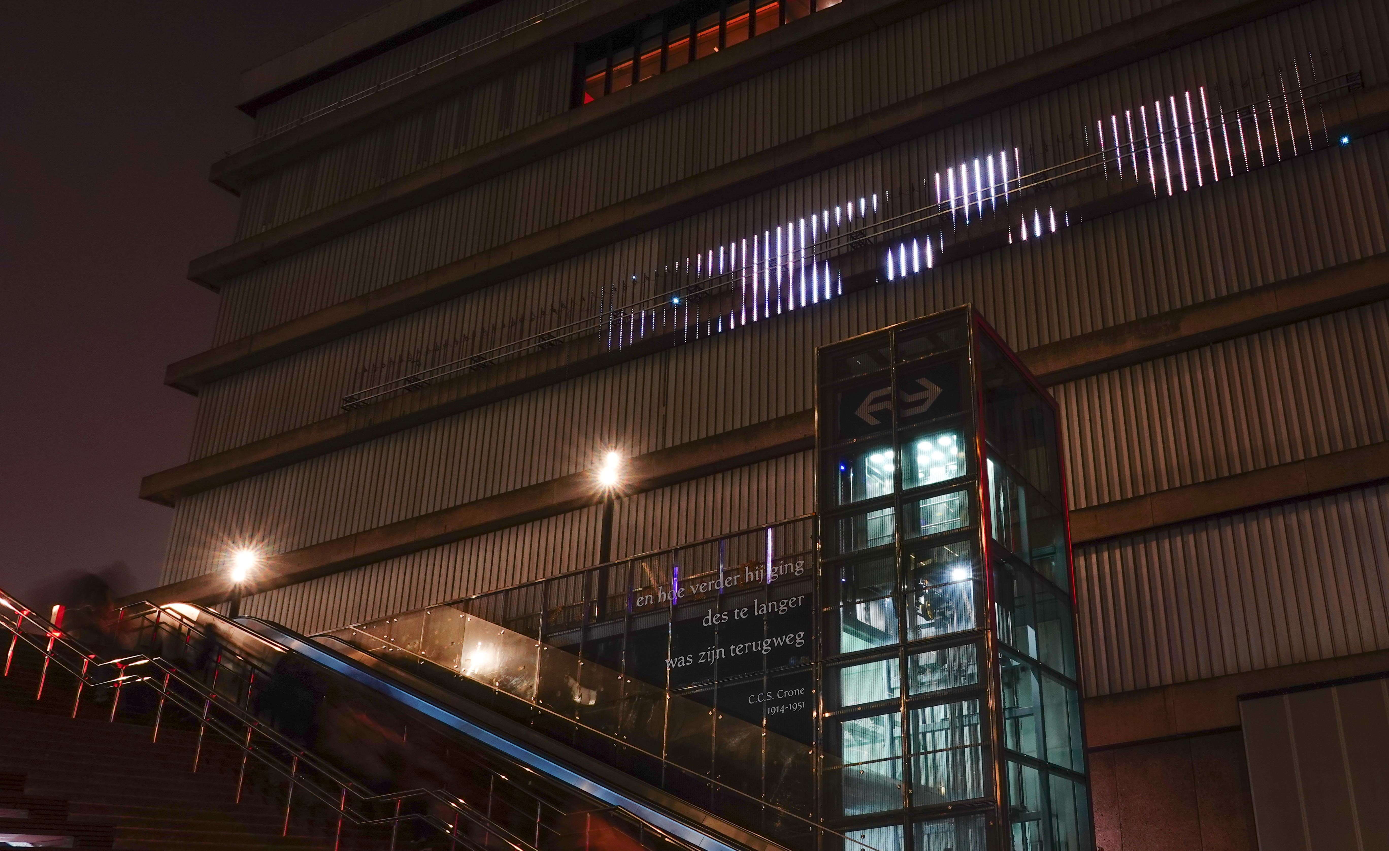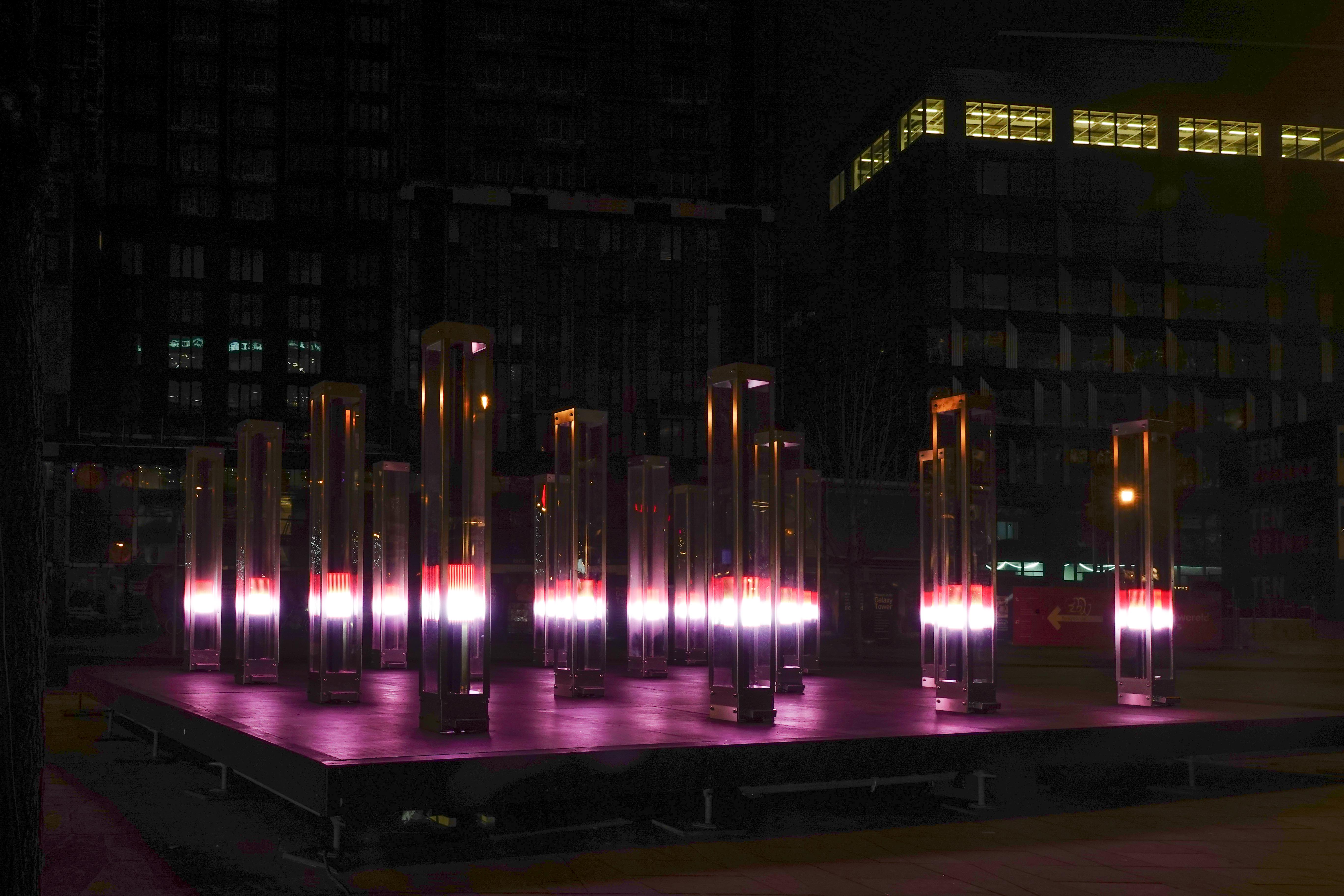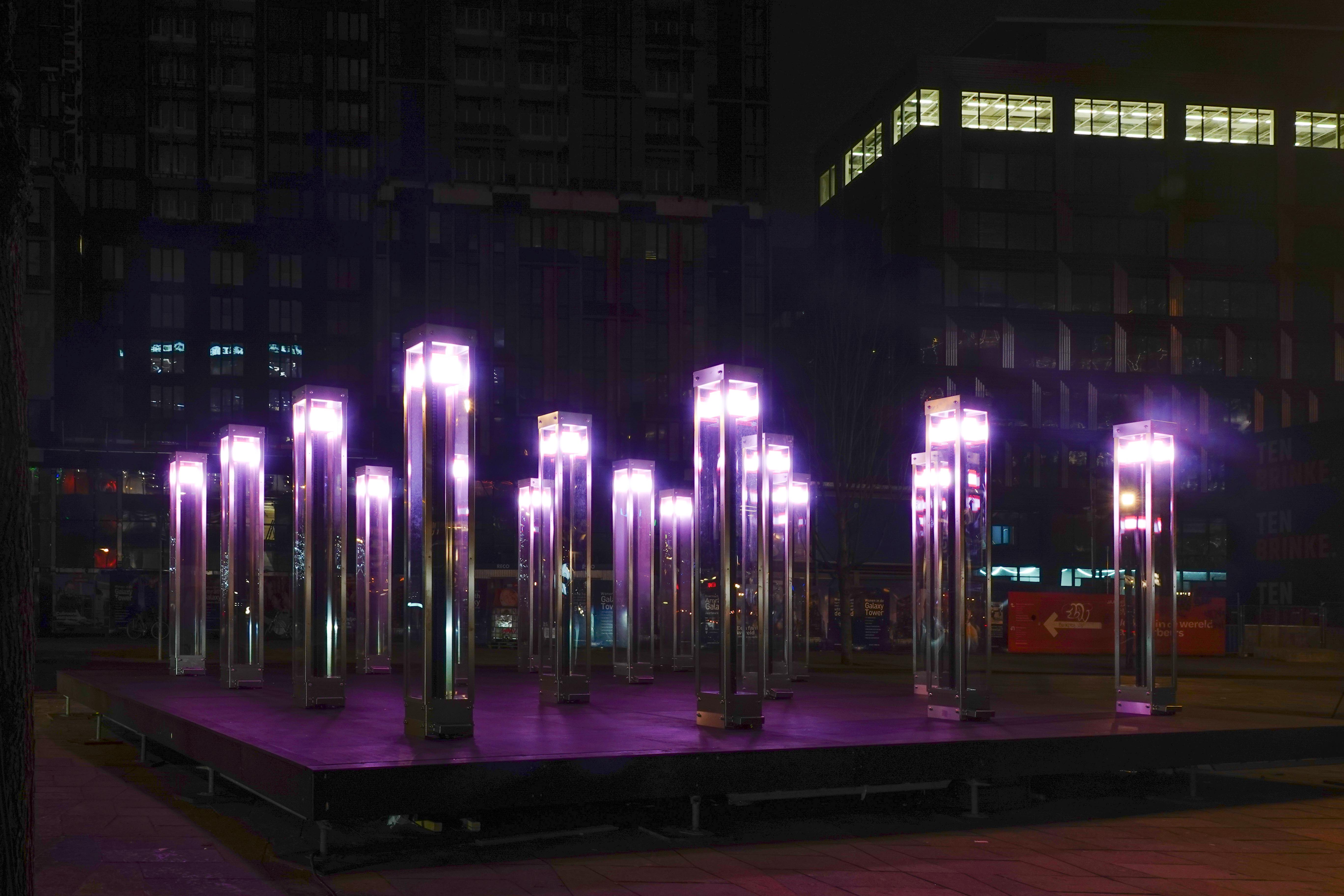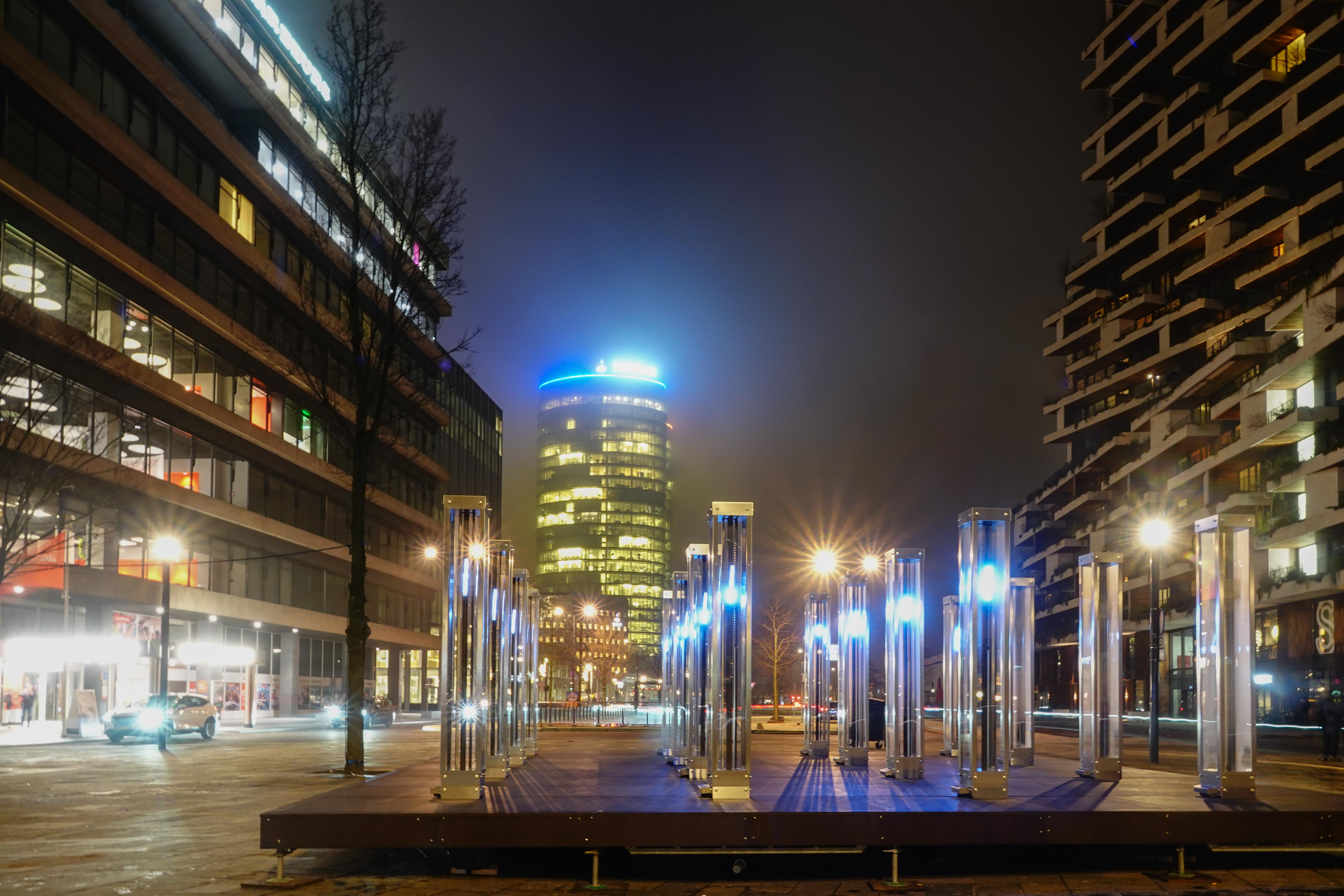 The Grid, op de hoek van het Jaarbeursplein, zorgt daar voor een oase aan licht. Zestien rechtopstaande kolommen, ogenschijnlijk een vaste structuur, een strak beeld. Maar dat verandert volkomen, als de installatie tot leven komt. de makers zijn studio Ravenhorst, Victor Dissel & Stan Bekker.