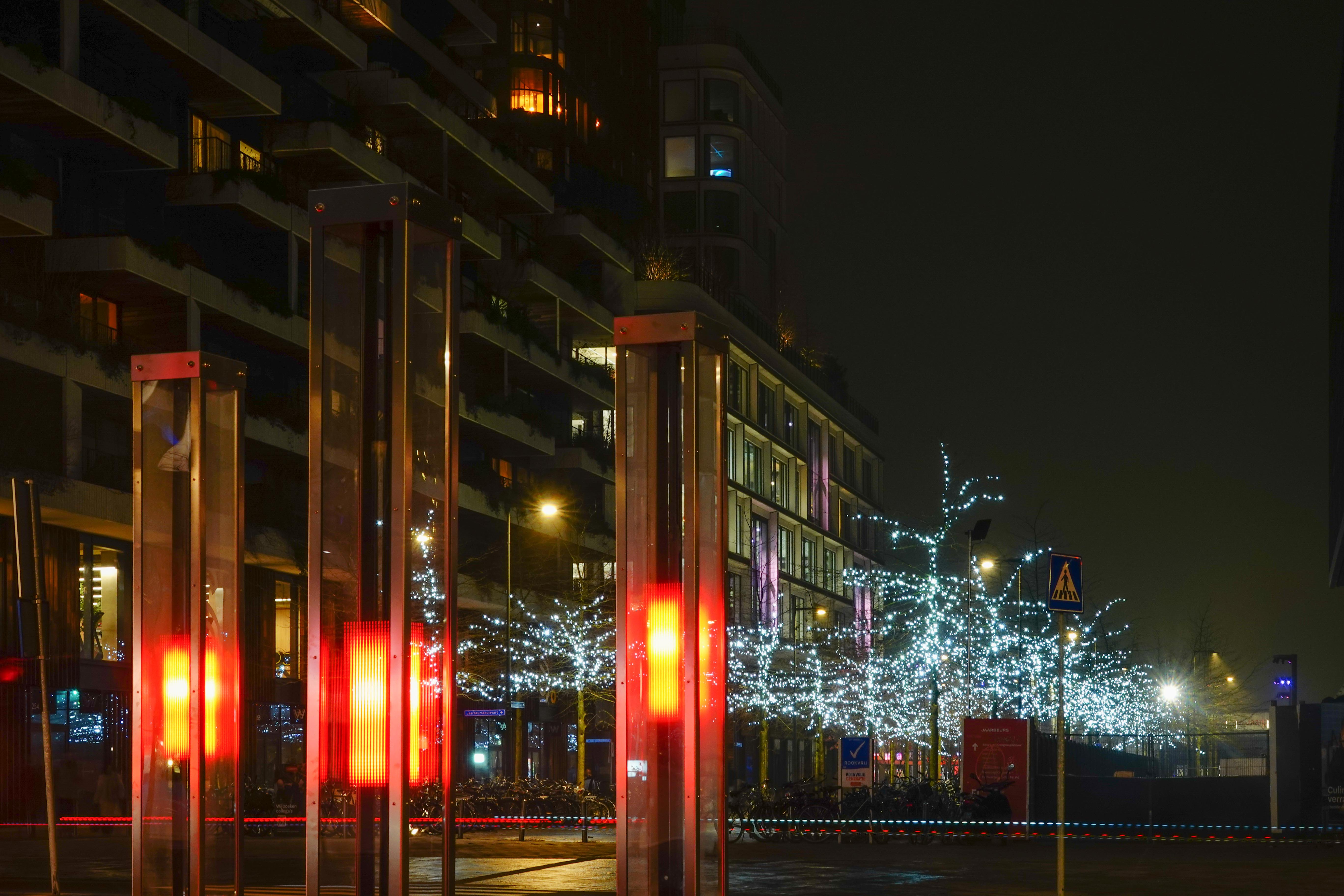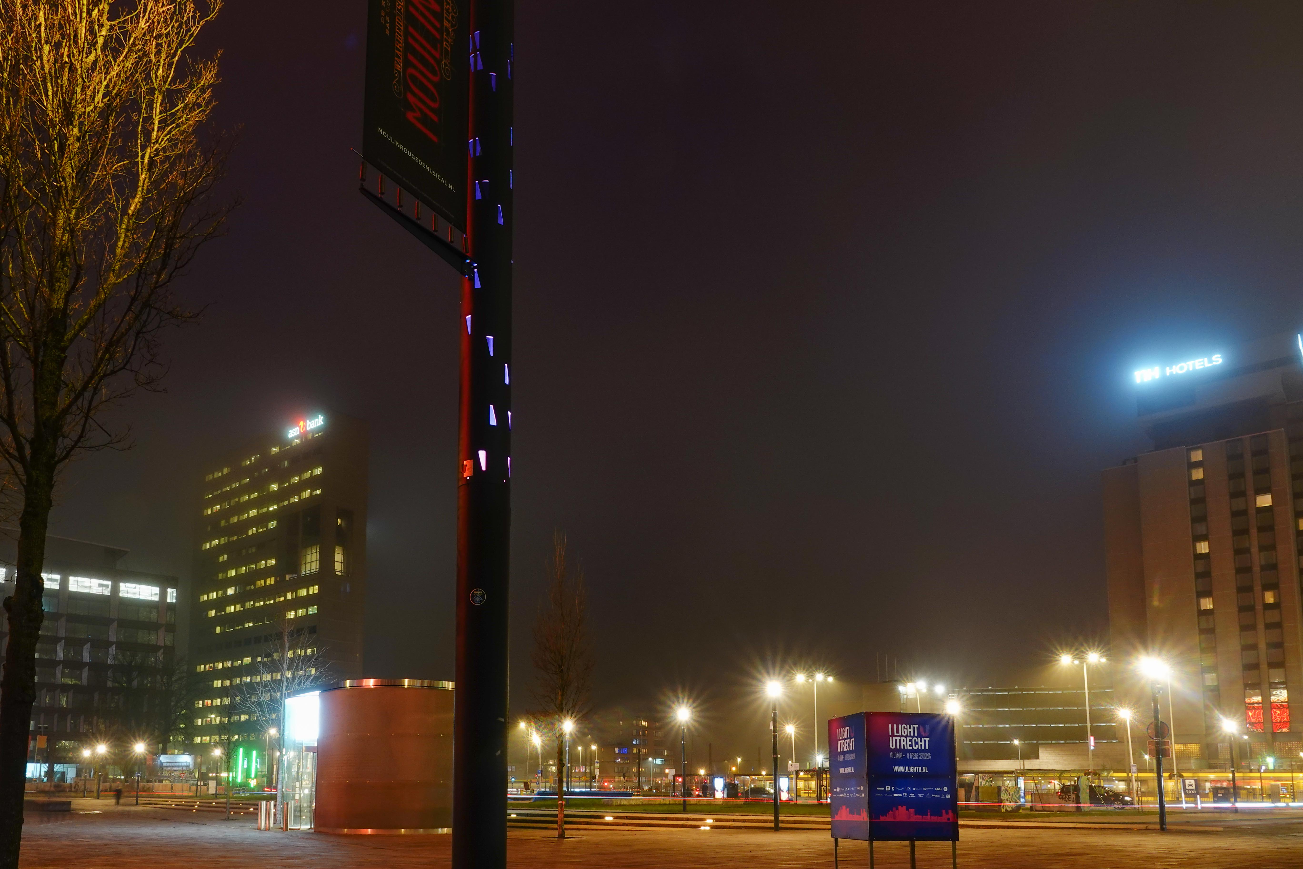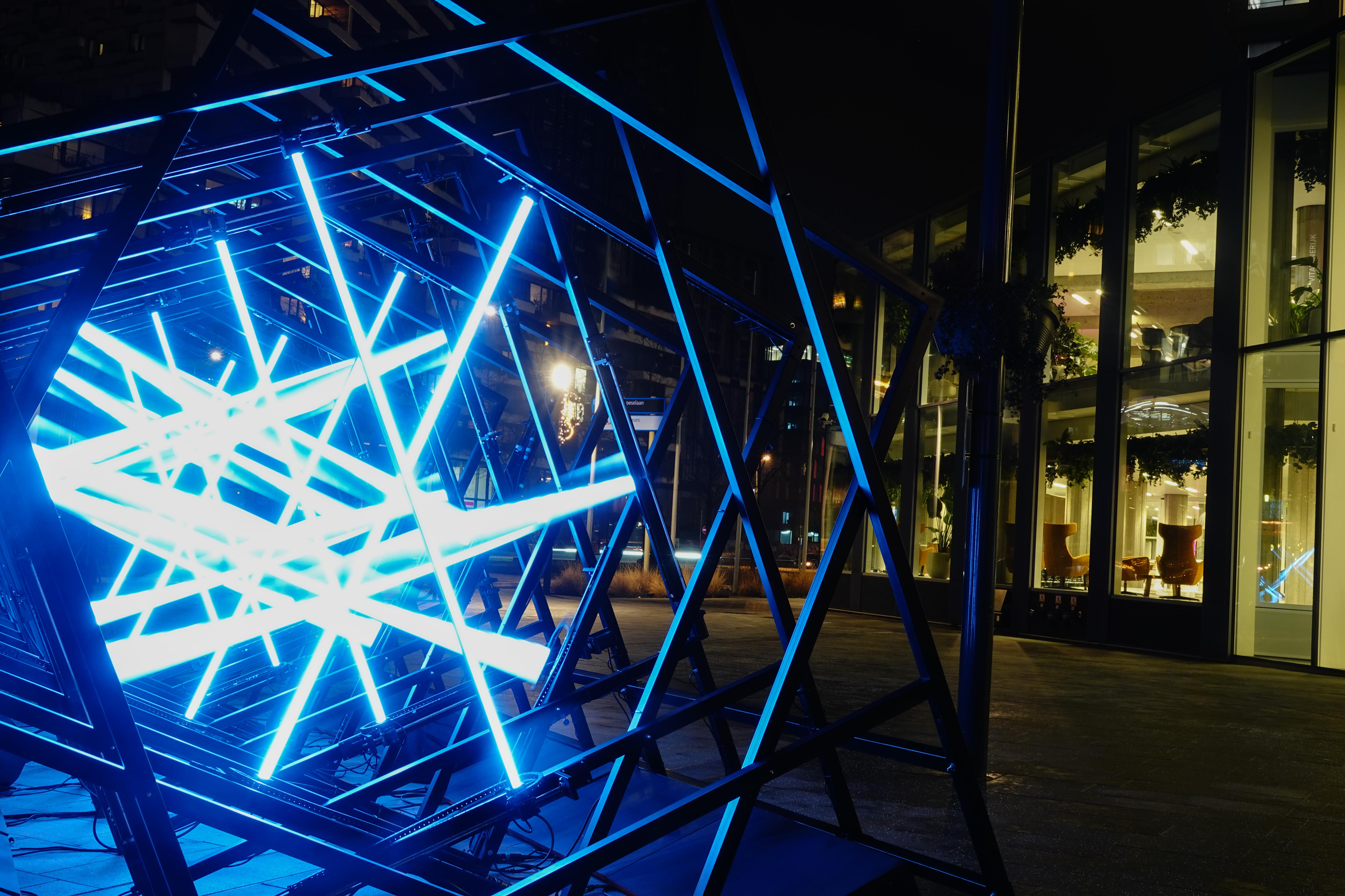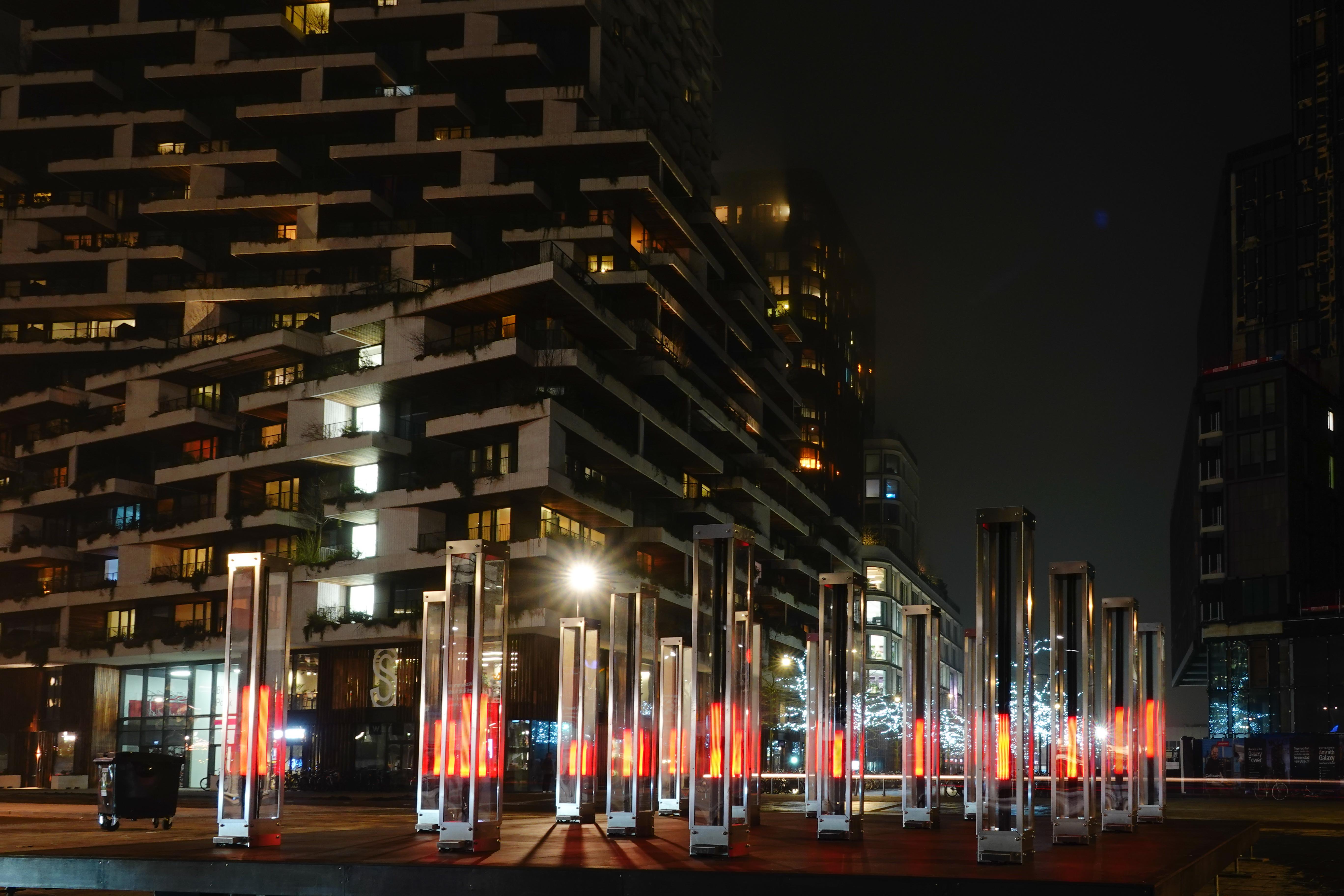 The Grid, op de hoek van het Jaarbeursplein, zorgt daar voor een oase aan licht. Zestien rechtopstaande kolommen, ogenschijnlijk een vaste structuur, een strak beeld. Maar dat verandert volkomen, als de installatie tot leven komt. de makers zijn studio Ravenhorst, Victor Dissel & Stan Bekker.