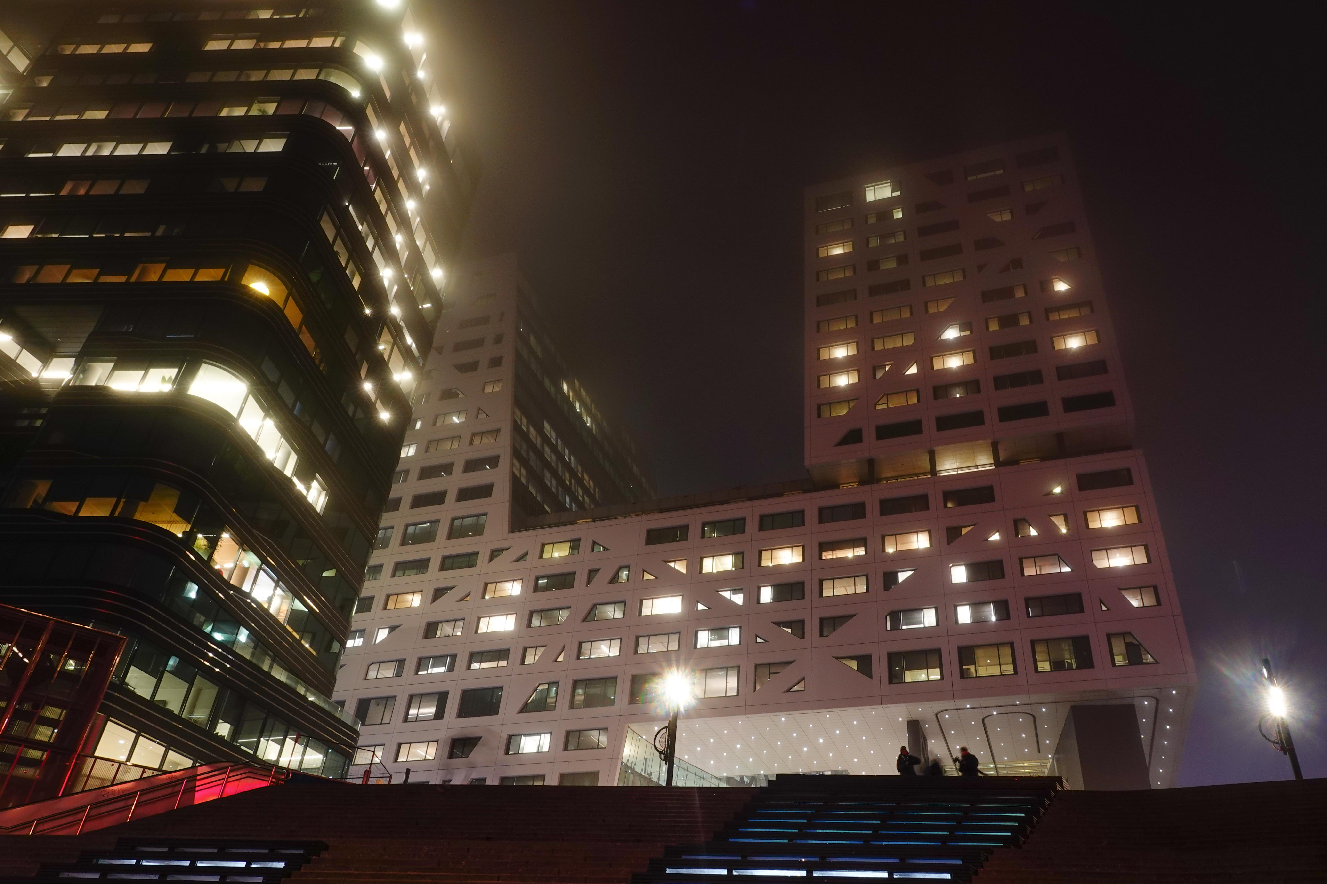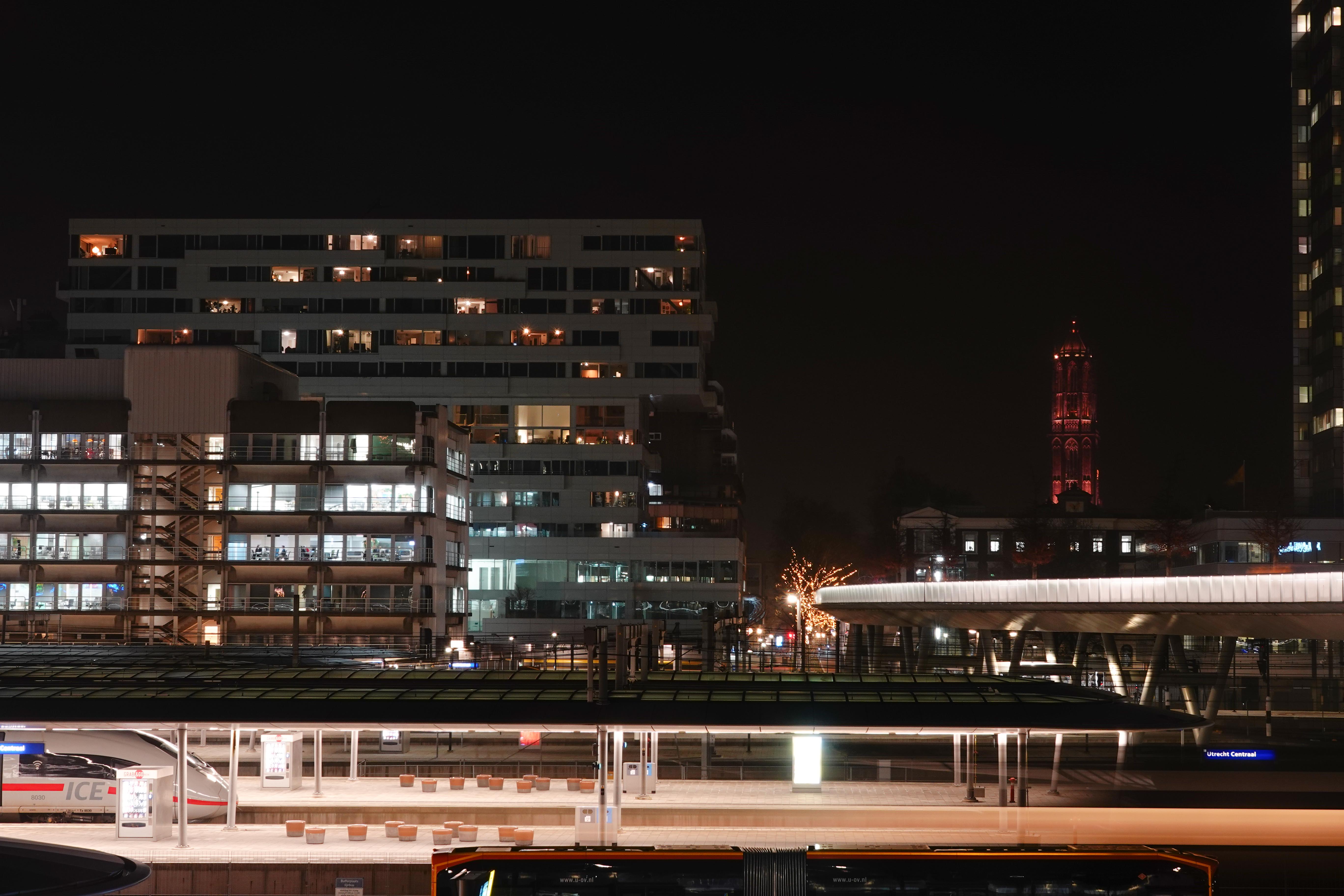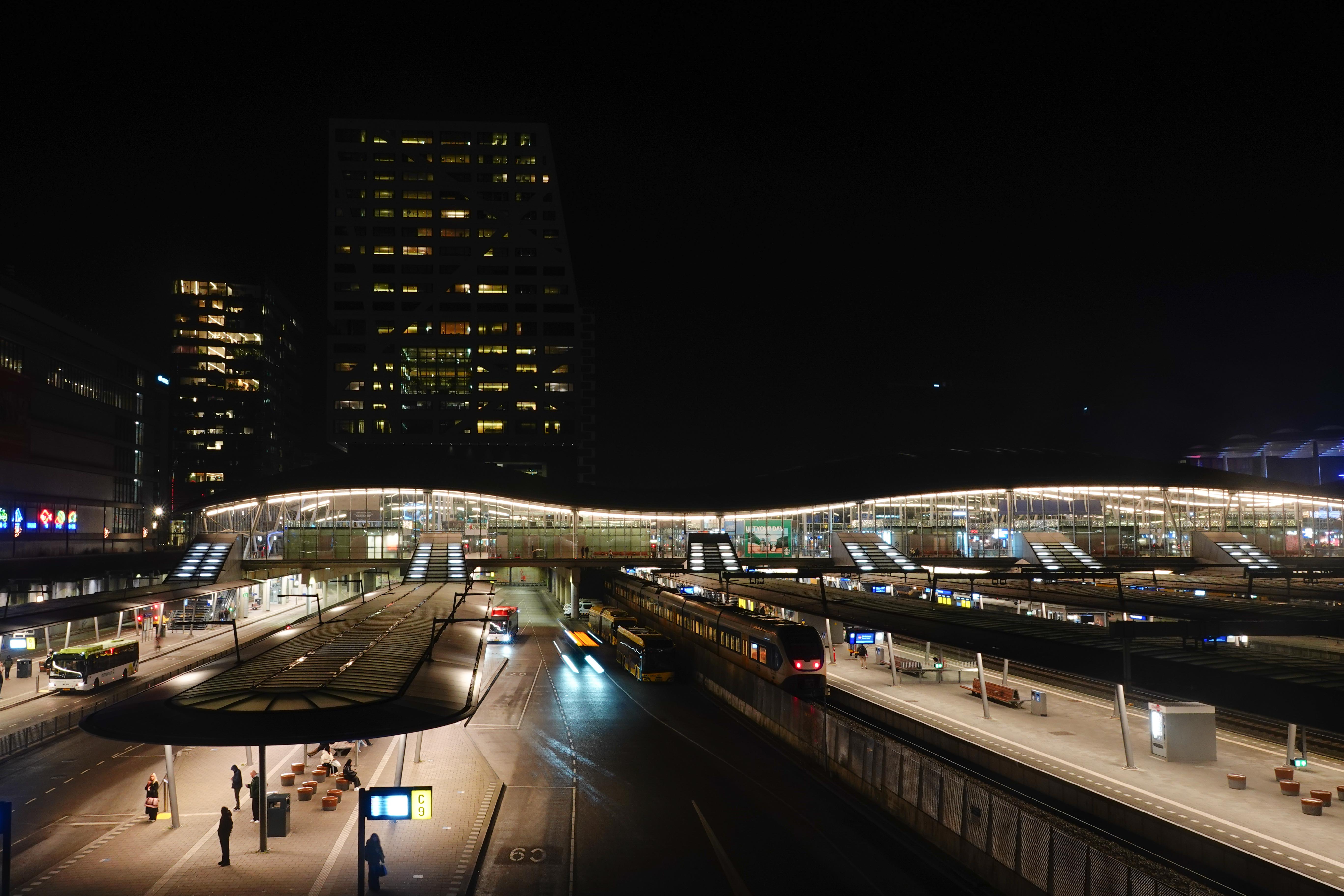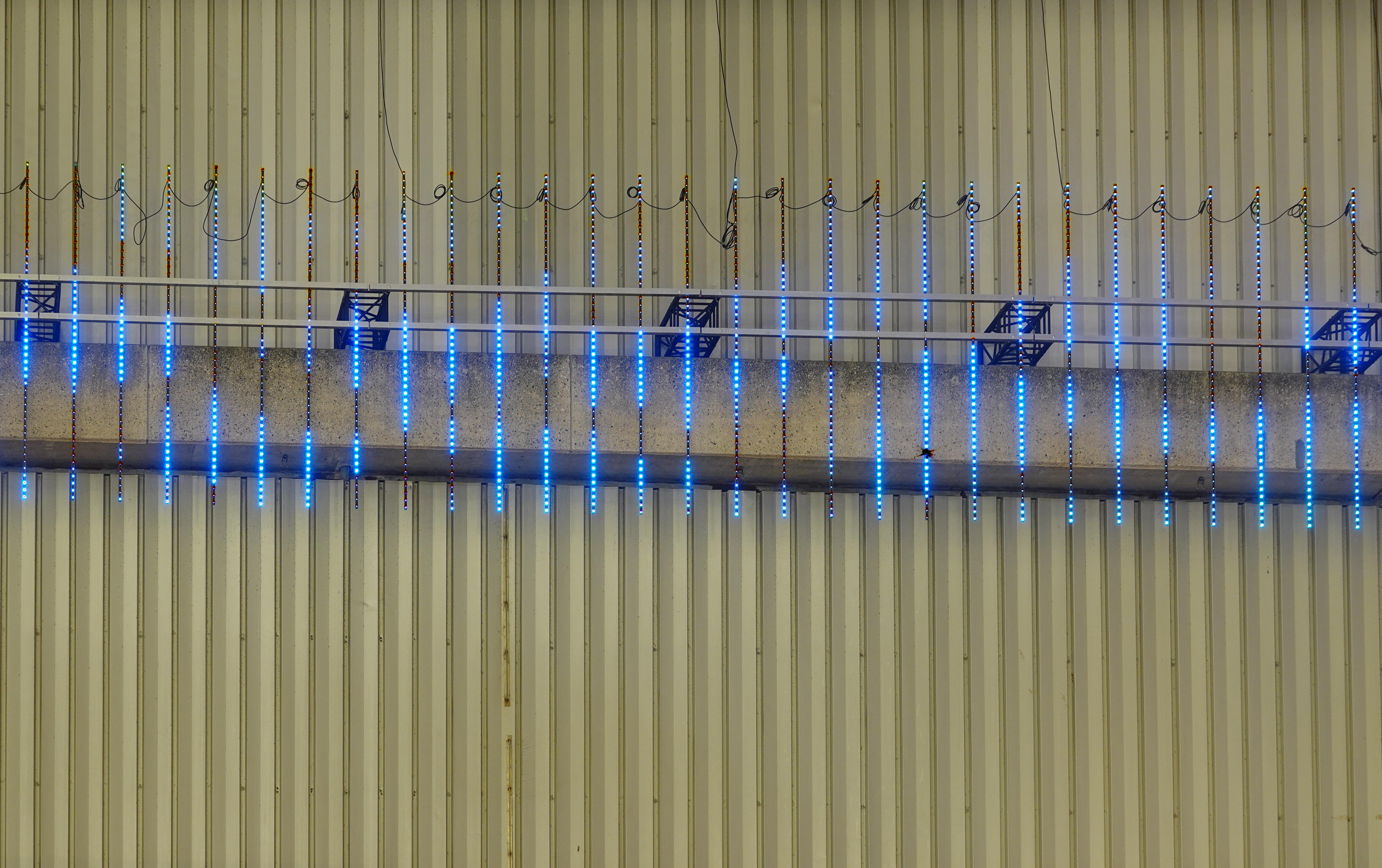 The Grid, op de hoek van het Jaarbeursplein, zorgt daar voor een oase aan licht. Zestien rechtopstaande kolommen, ogenschijnlijk een vaste structuur, een strak beeld. Maar dat verandert volkomen, als de installatie tot leven komt. de makers zijn studio Ravenhorst, Victor Dissel & Stan Bekker.