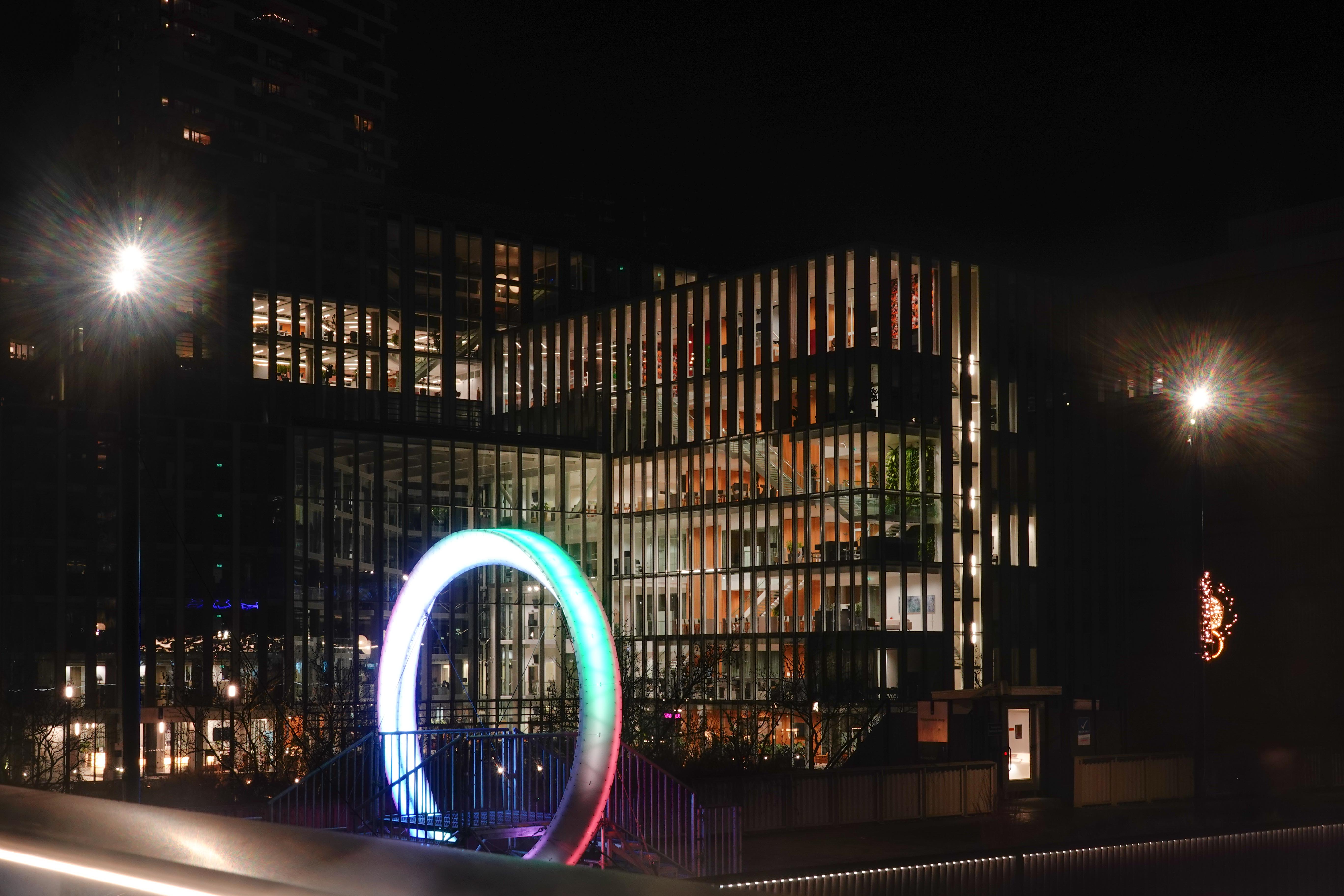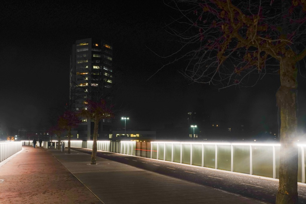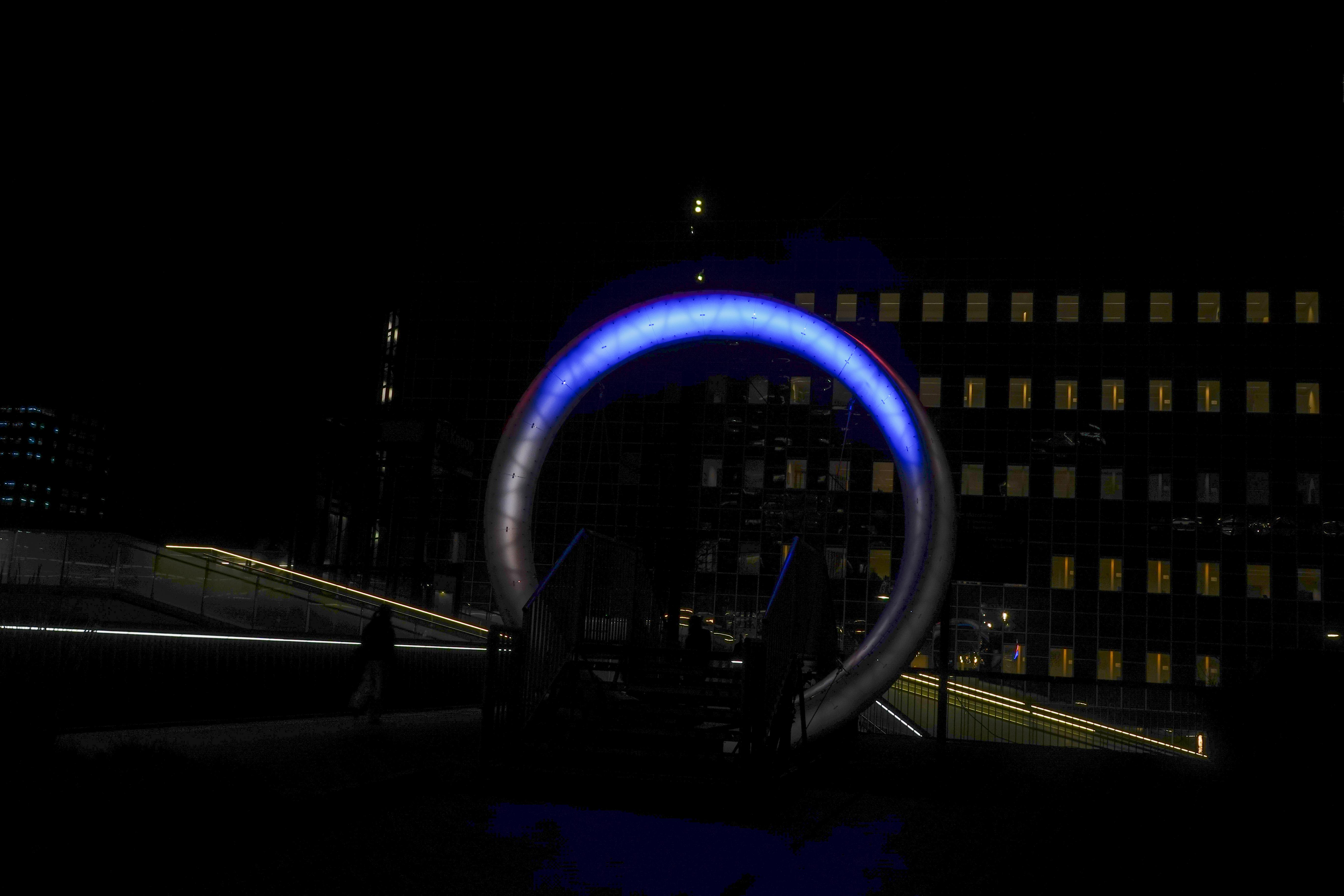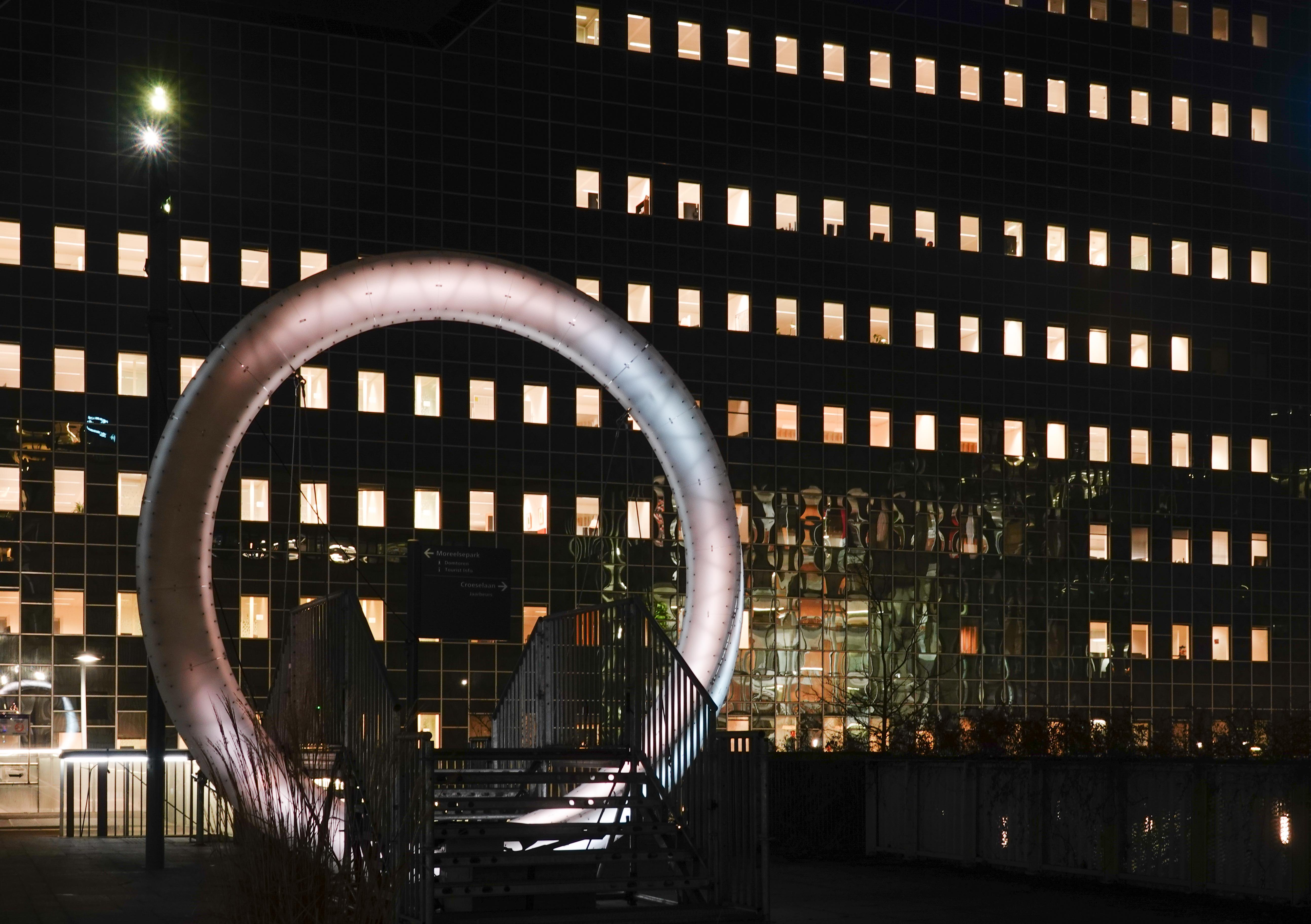 Boven gekomen, bij de trap van de brug, treffen we de Circle of Life van Rob van Houten. De cirkel gloeit zacht en komt langzaam tot leven in kleur met op de achtergrond de spiegelgevel van de Rabobank.