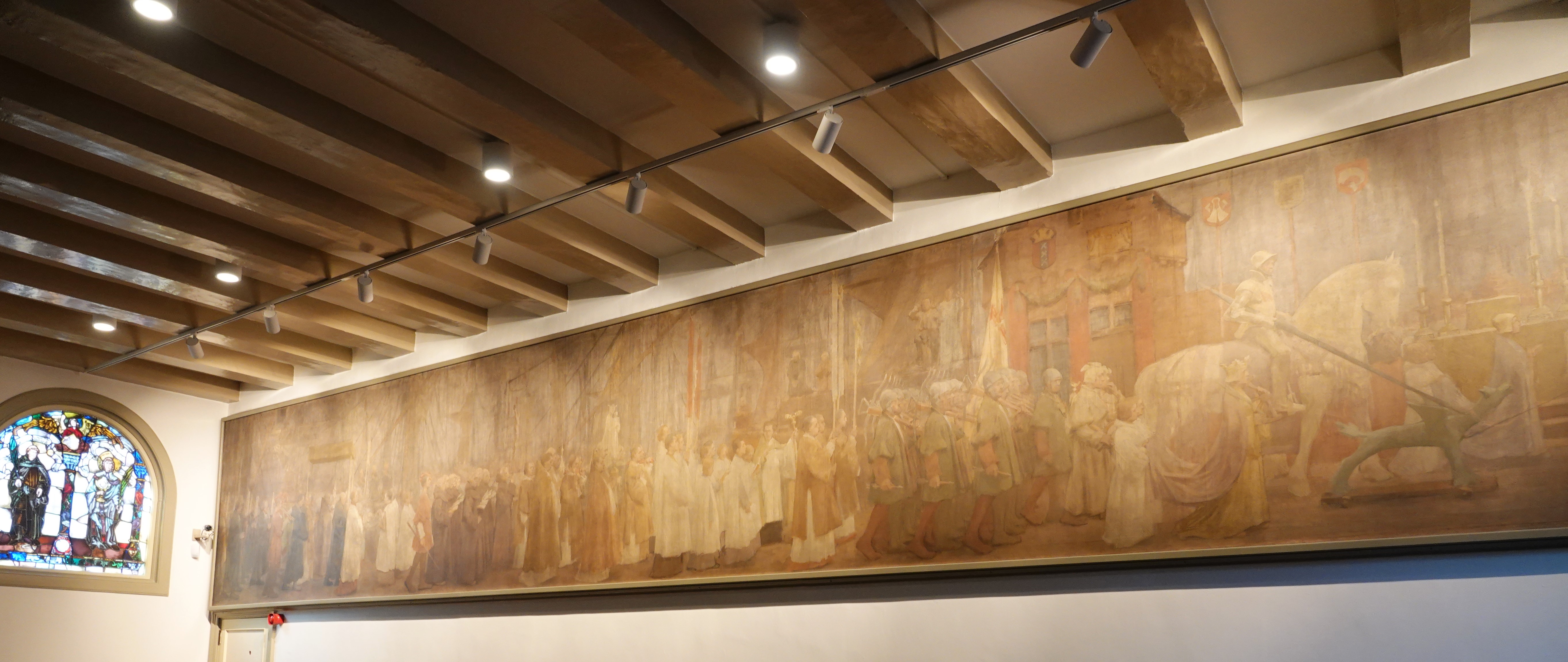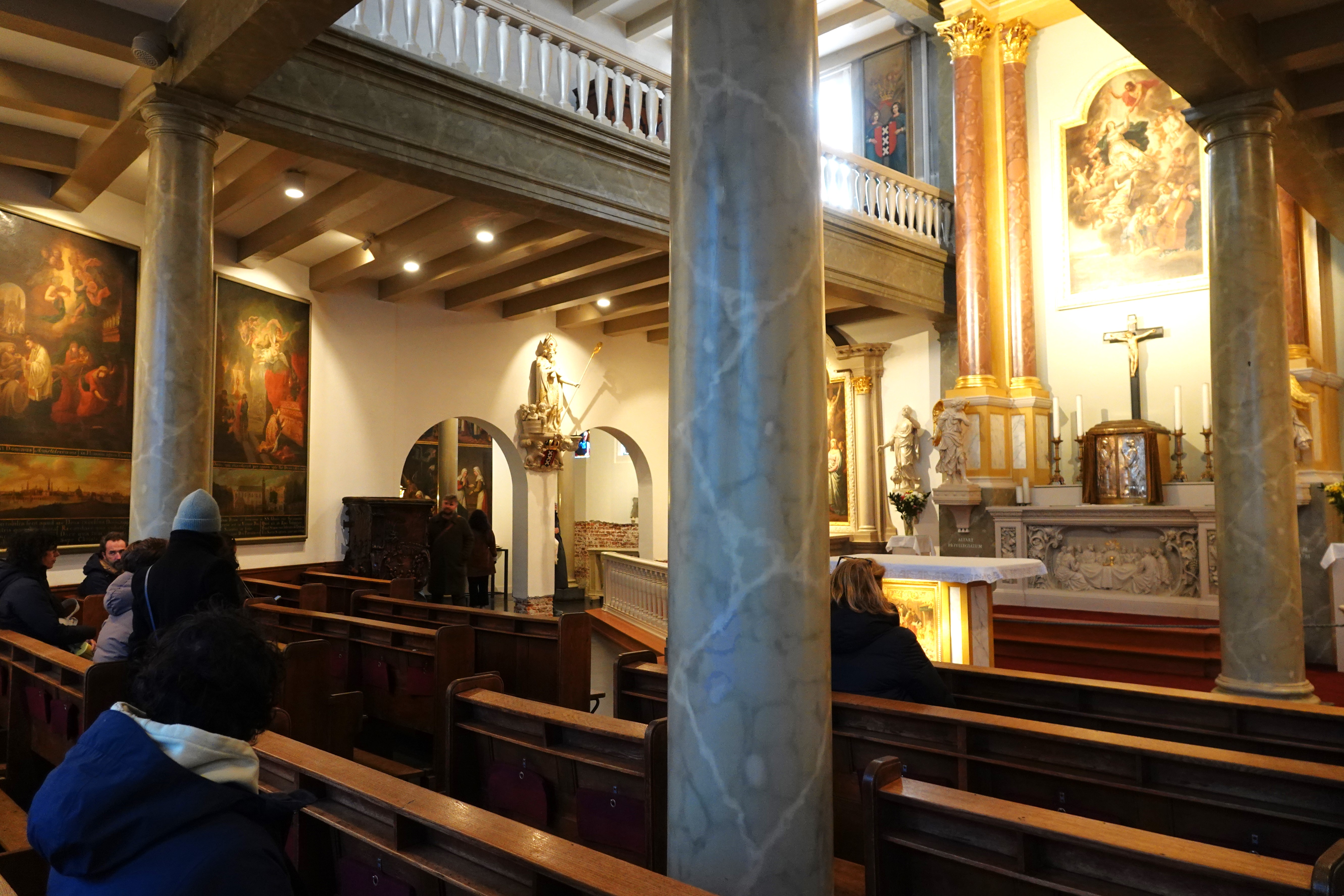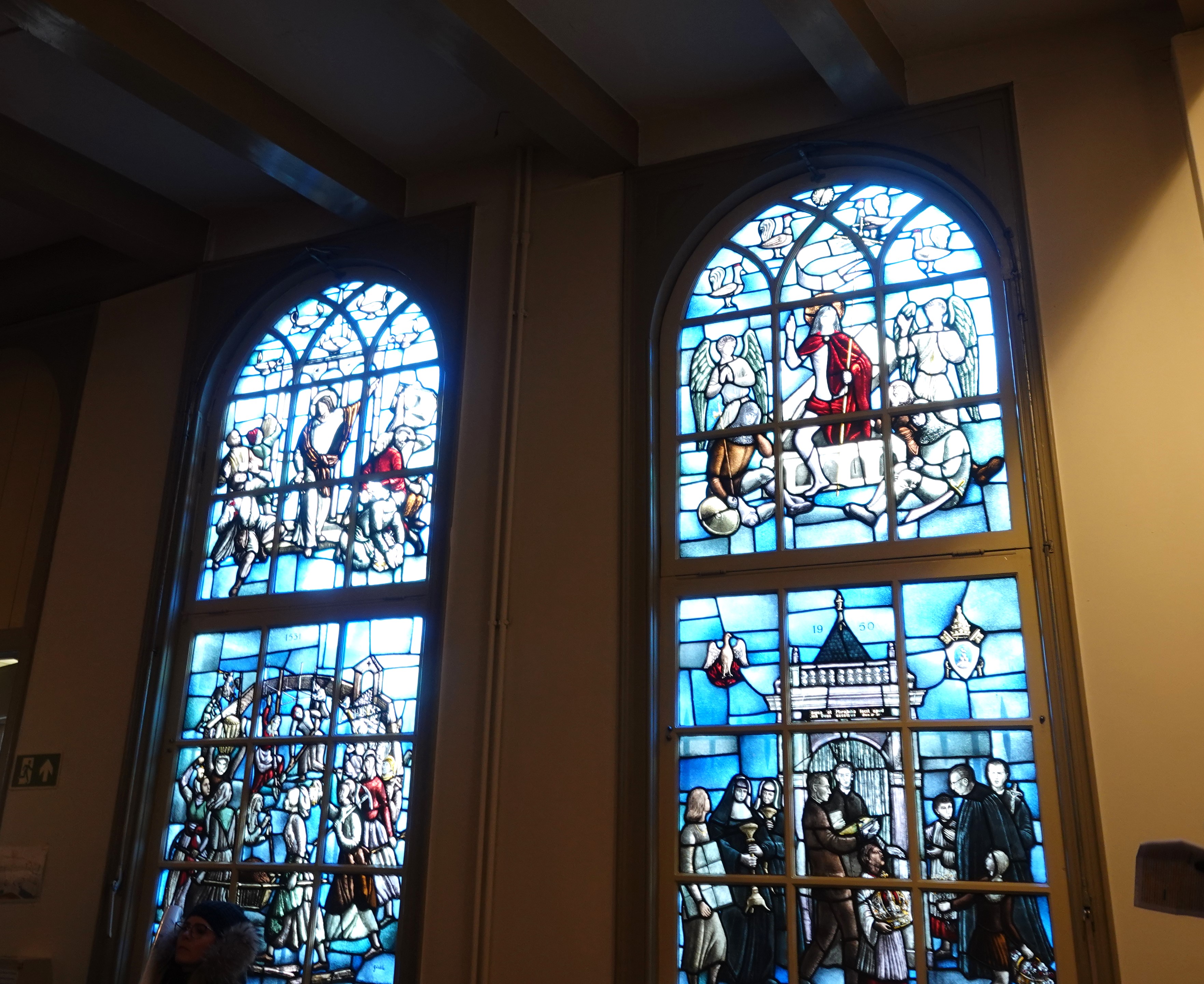 We liepen de prachtige begijnhofkapel in, gebouwd ter herdenking van het Mirakel. Een impressionistische muurschildering van Derkinderen trok mijn aandacht. Hier is veel gedoe over geweest, toen bleek dat het werk niet realistisch geschilderd was, waar men vanuit ging.