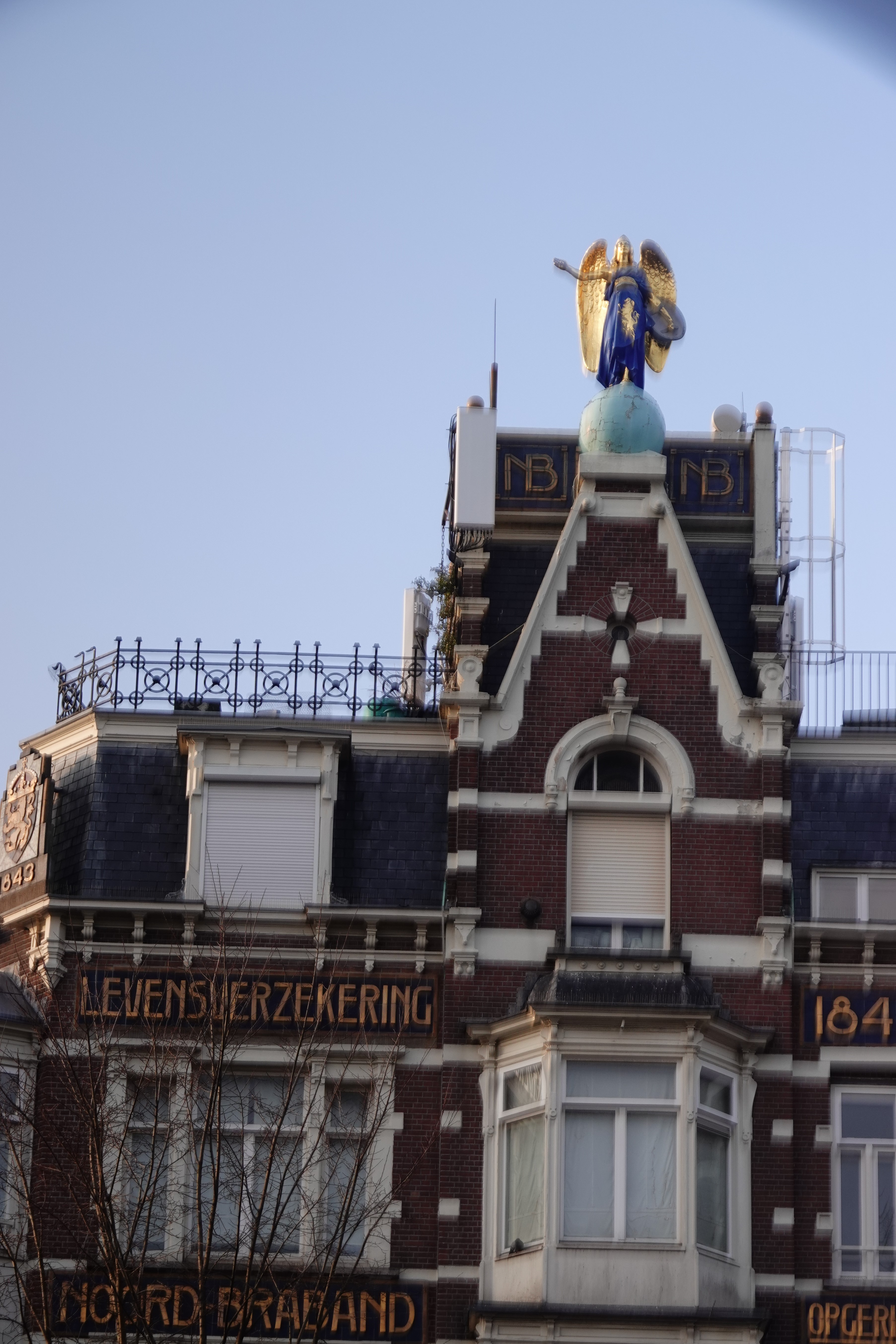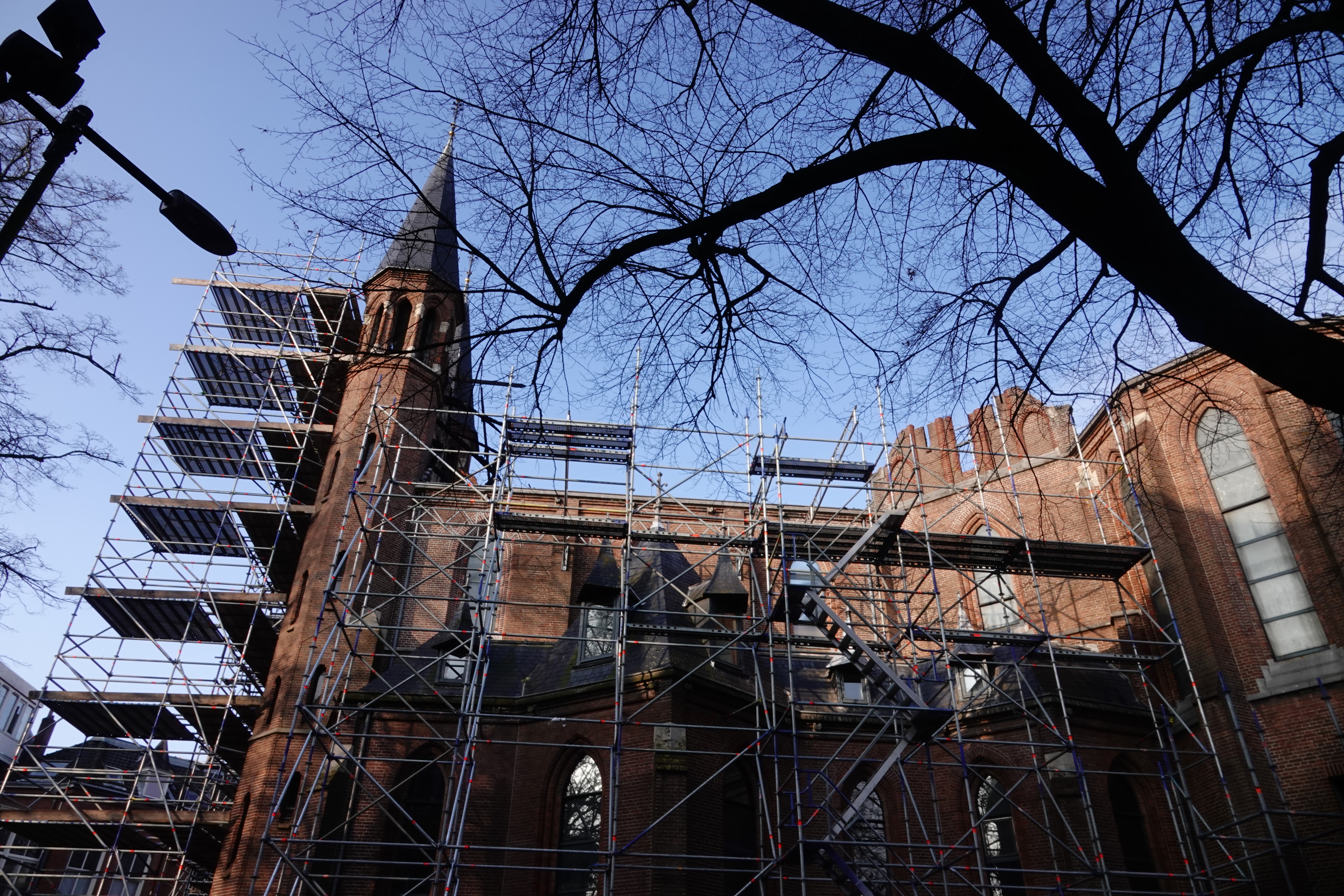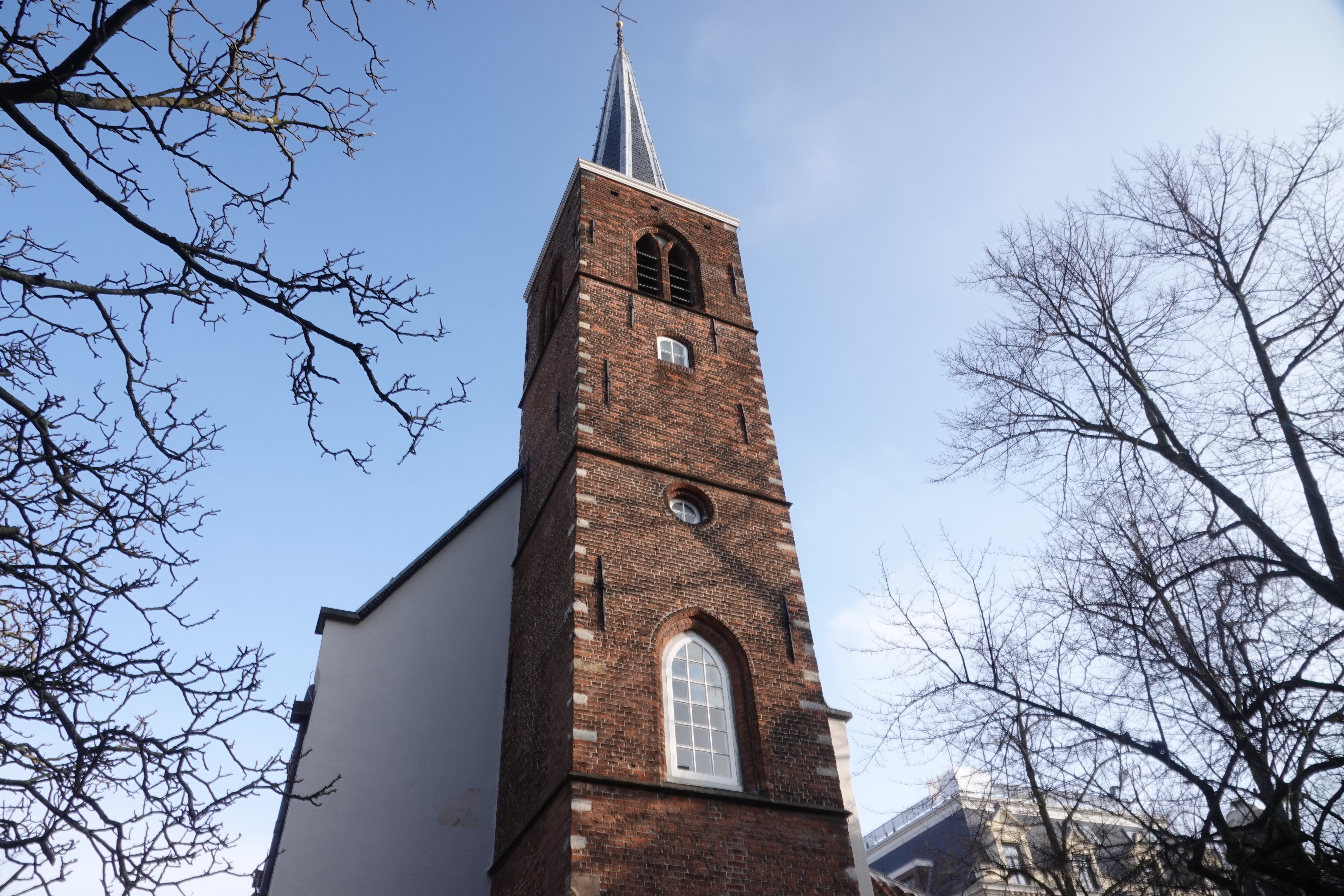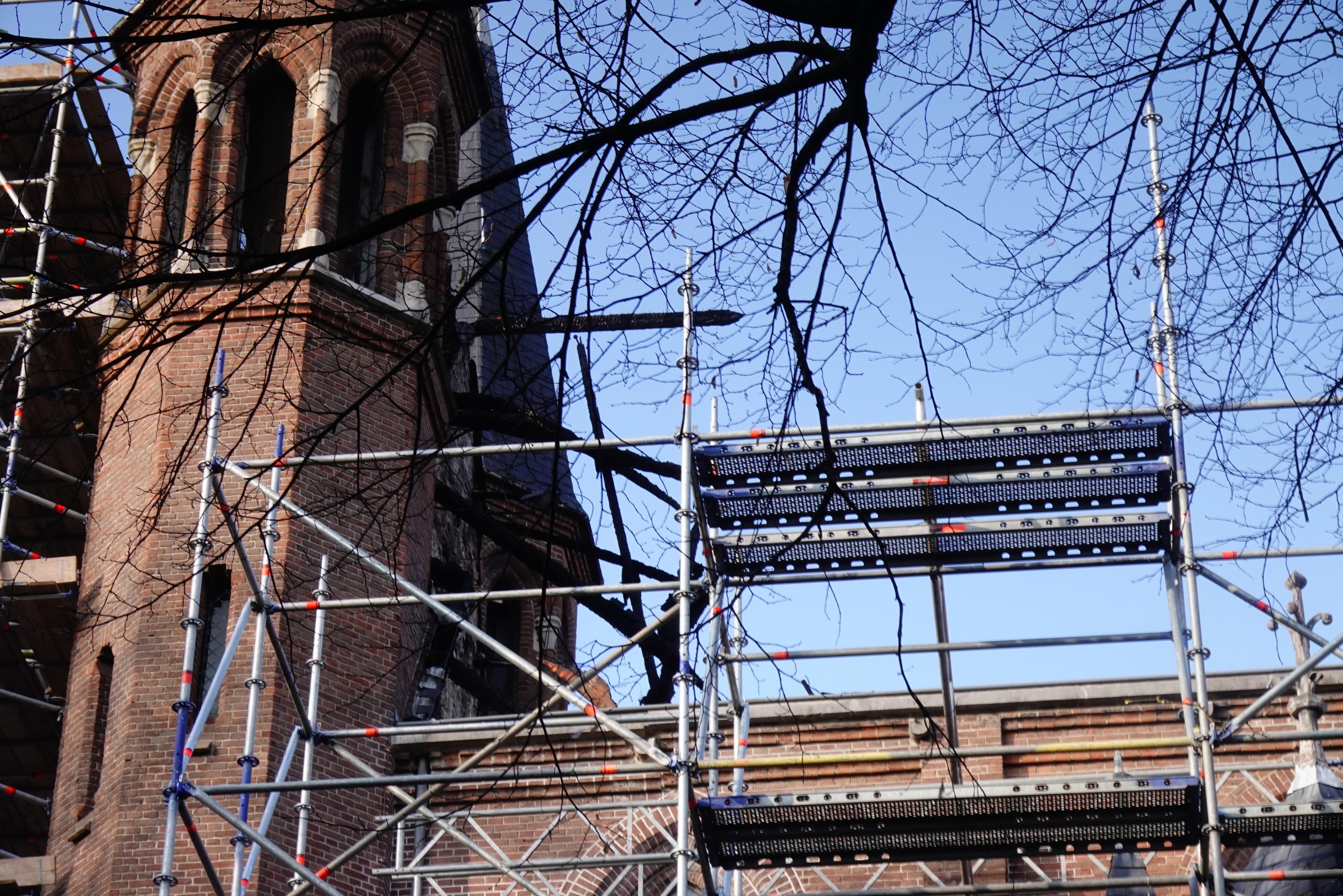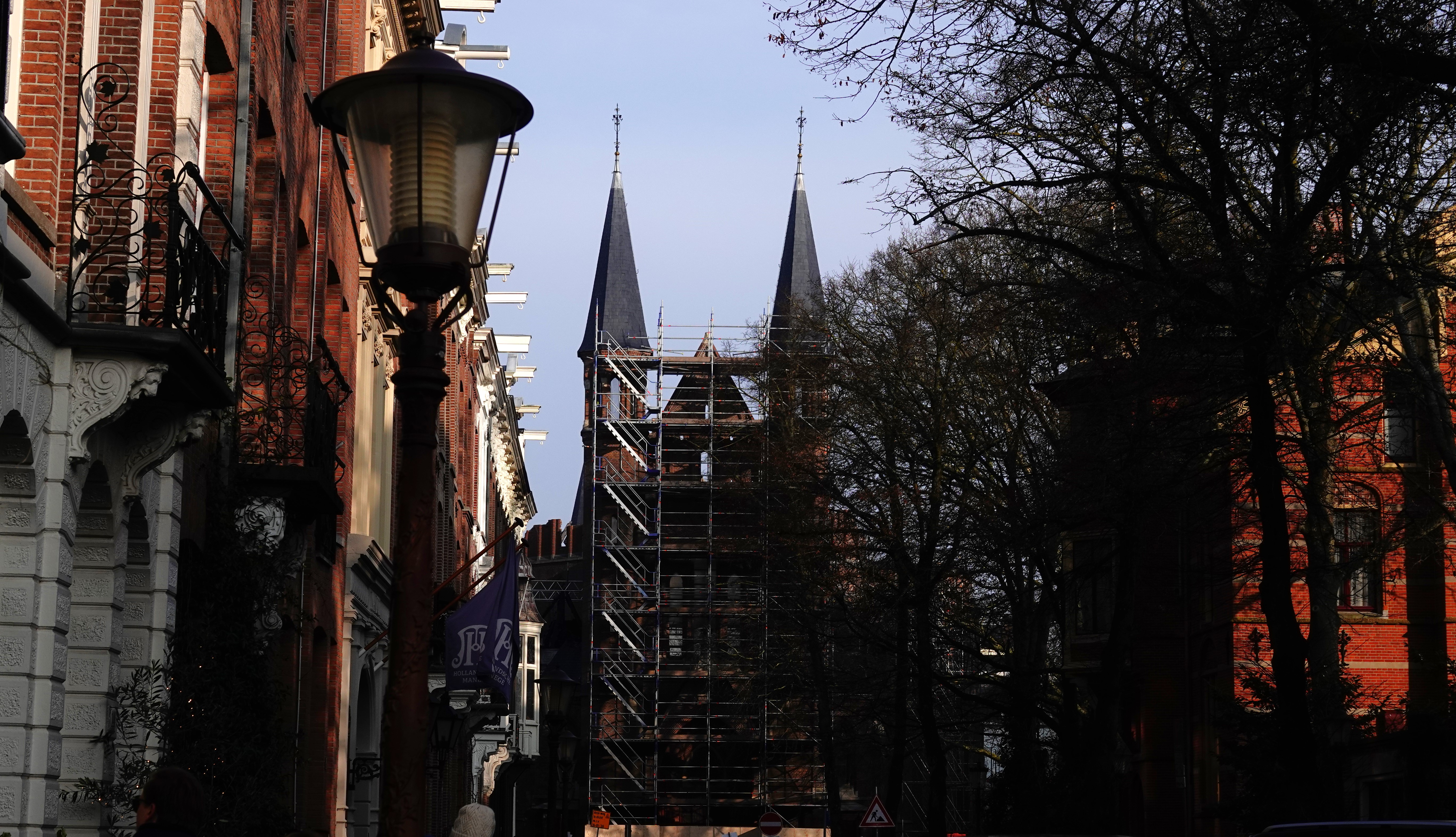 We verlieten het park en staan opeens oog-in-oog met de Vondelkerk, die in de nieuwjaarsnacht door brand, waarschijnlijk vuurwerk, is verwoest. Wat een trieste aanblik.