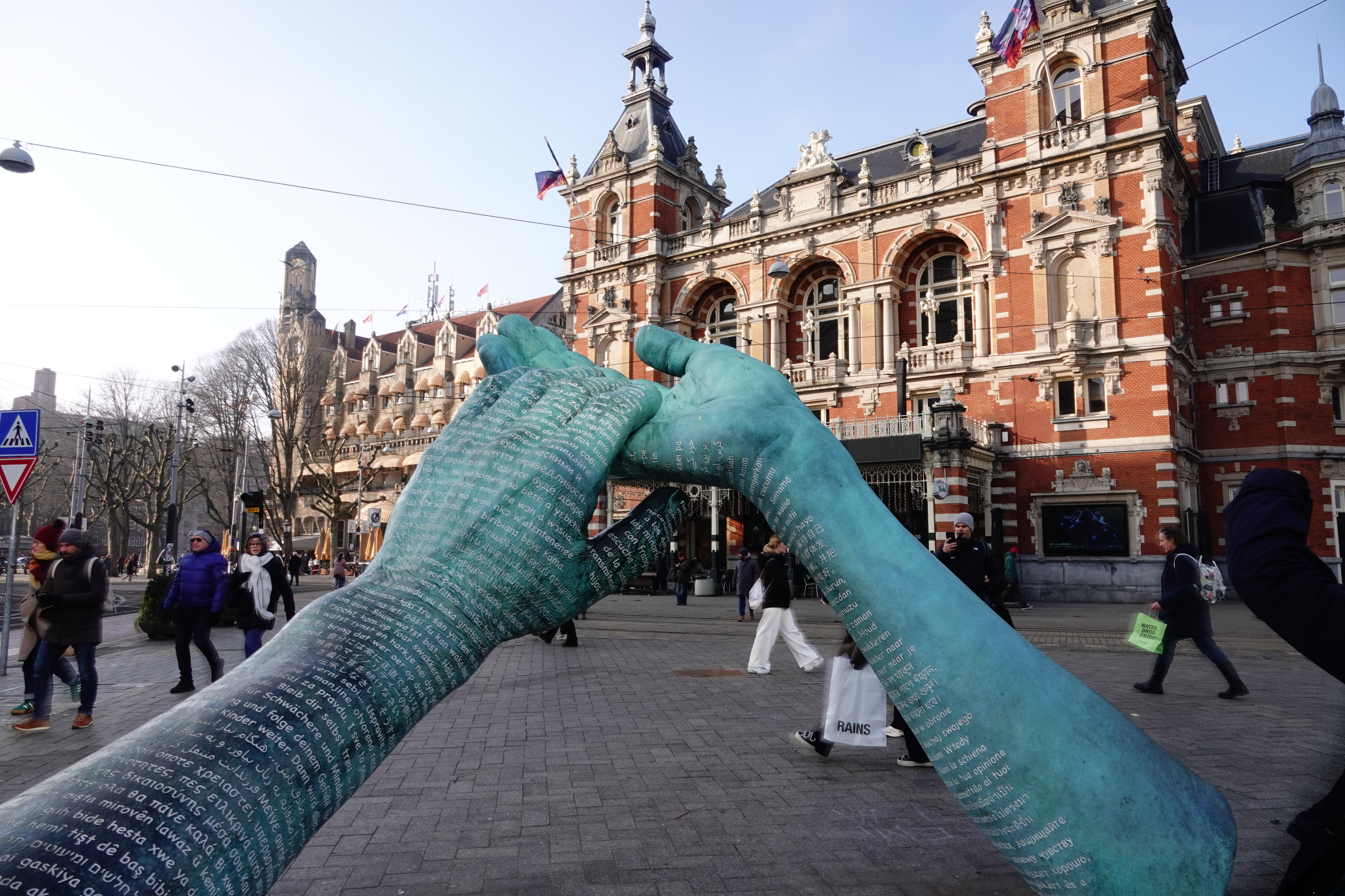 Wij wandelden verder richting het Leidse Plein met het indrukwekkende monument ter nagedachtenis aan de brute moord op misdaadverslaggever Peter R. de Vries. Het bronzen kunstwerk van kunstenares Rini Hurkmans bestaat uit twee in elkaar grijpende handen die de ‘helpende hand’ en verbondenheid symboliseren.