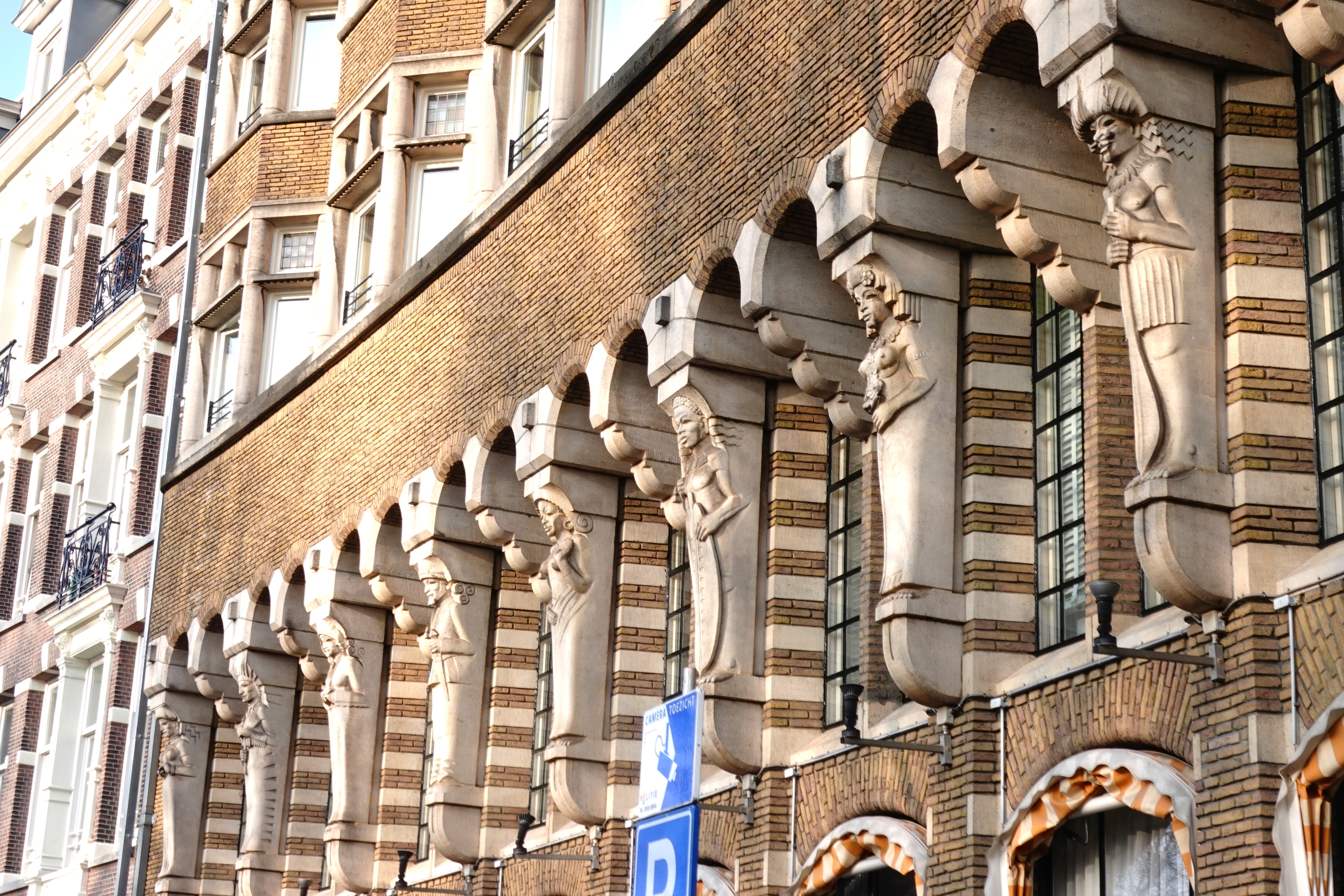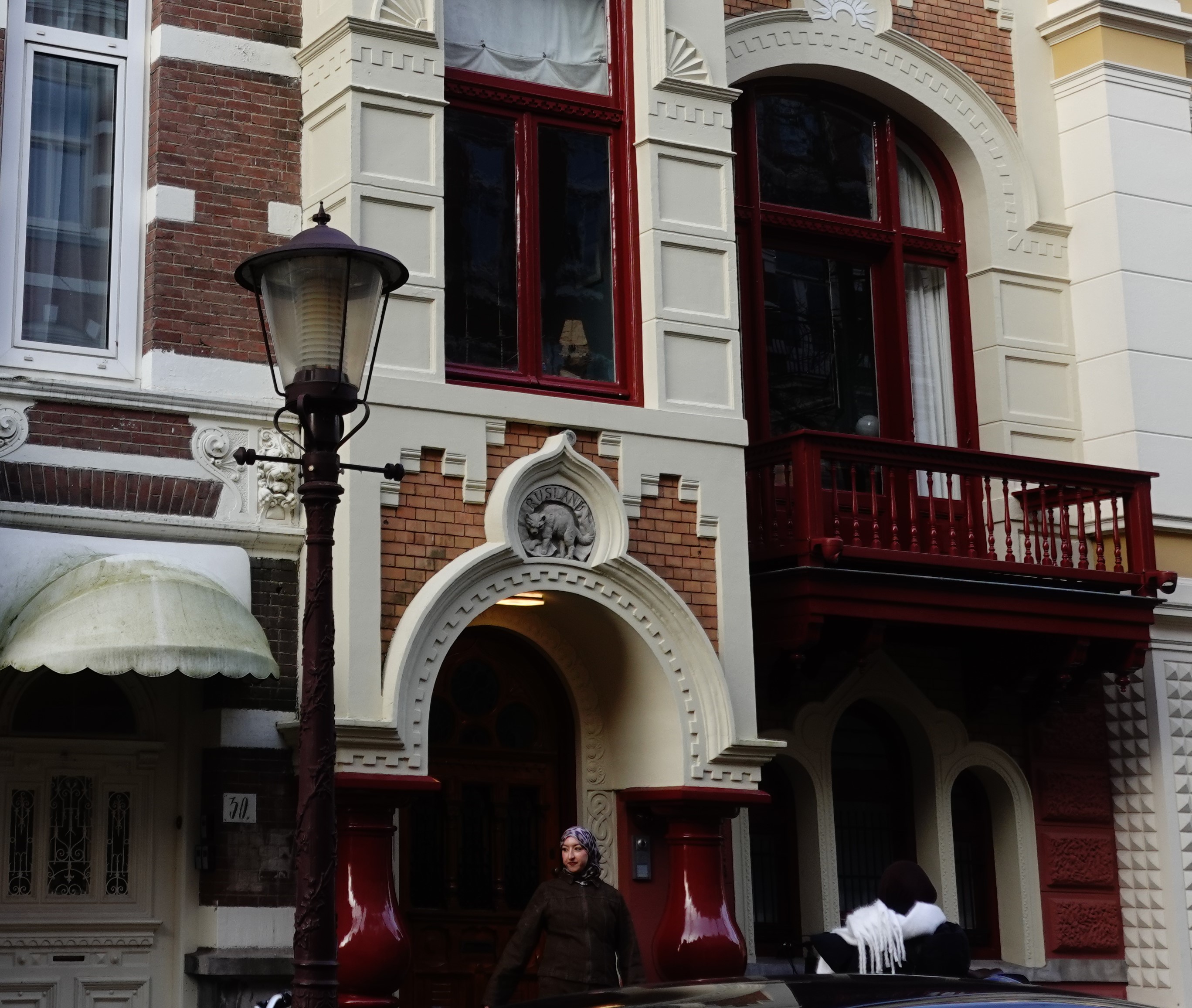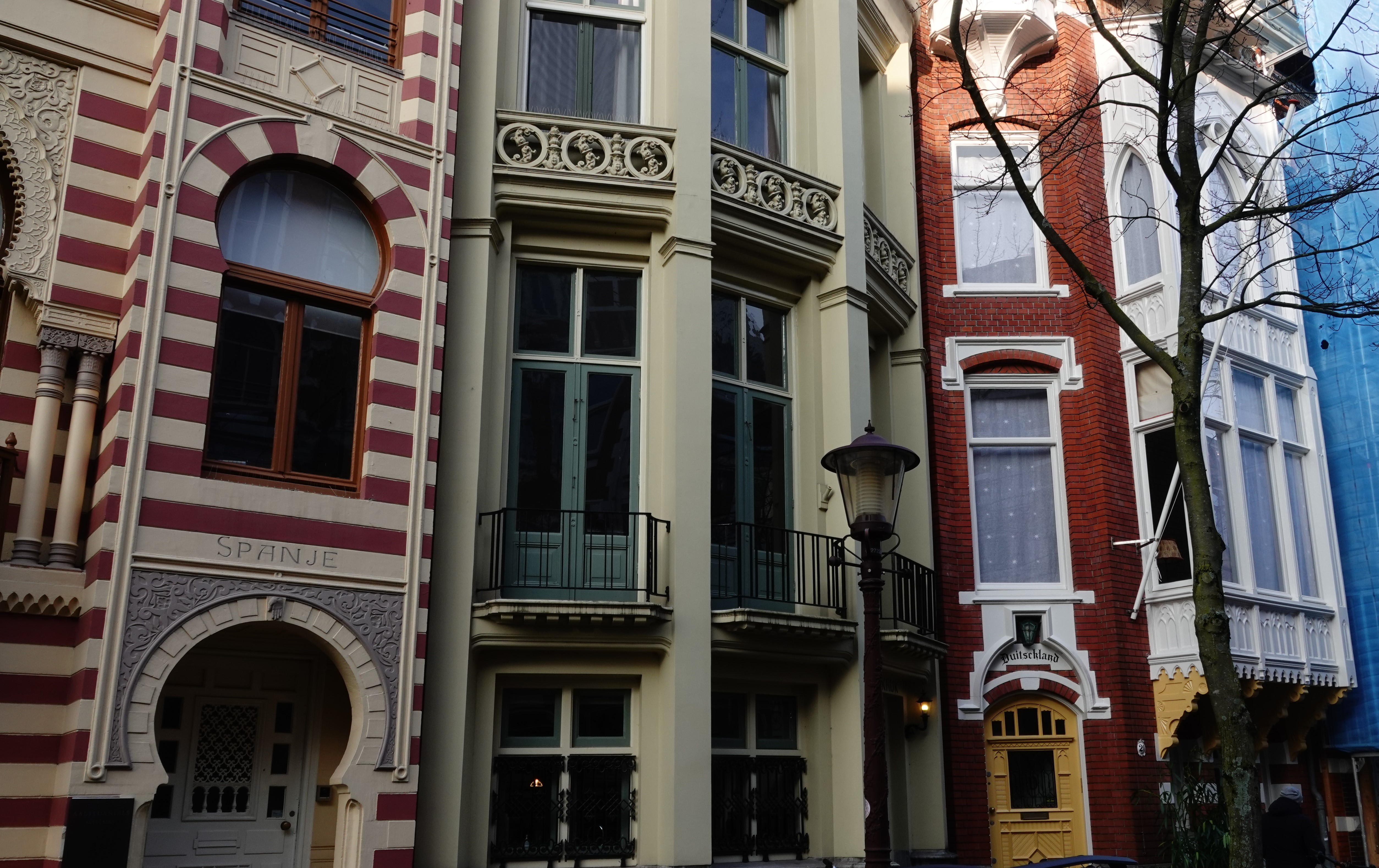 Een vrolijker buurt was de Roemer Visscherstraat waar we de Zevenlandenhuizen konden bewonderen. Ze zijn in opdracht van Sam van Eeghen gebouwd, waarschijnlijk omdat de Internationale Wereldtentoonstelling toen werd gehouden. De betreffende landen op rij zijn, Engeland-Nederland-Rusland-Spanje-Itelië-Frankrijk en Duitsland. Daar is zoveel prachtigs in bouwstijlen te bewonderen, daar hadden wij nu geen tijd voor. Ander keertje maar.