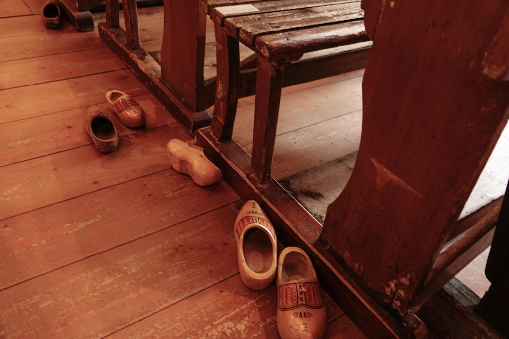 Er lagen nu hier en daar klompjes naast de banken, maar die kwamen vroeger het lokaal niet in. Dat geklos zou oorverdovend zijn geweest, dus klompen bleven op de gang.