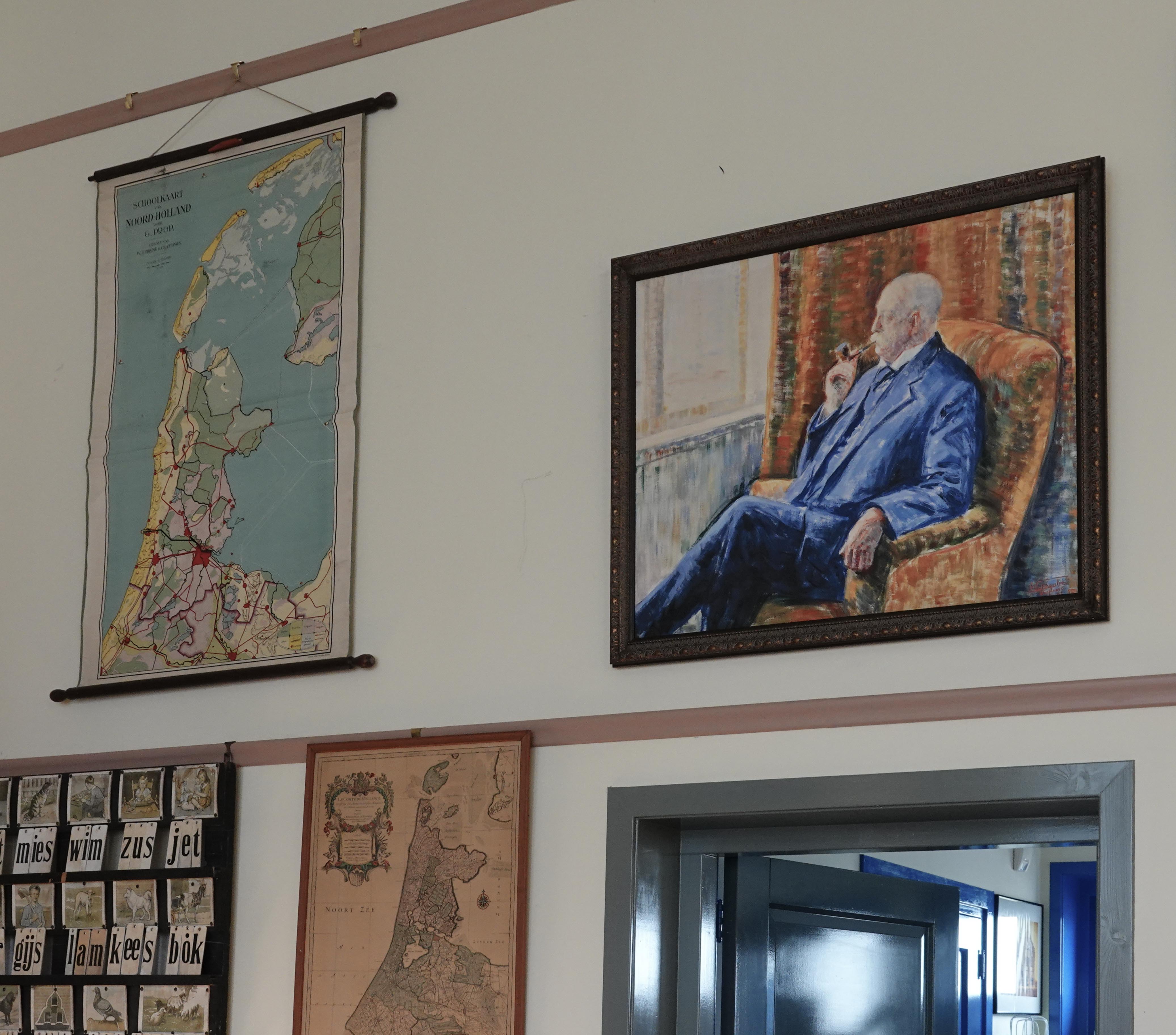 Meester Kievit is zelf vereeuwigd op een schilderij. Er hangen trouwens ook nog een paar foto’s van hem met zijn klasjes van wel 30 leerlingen.