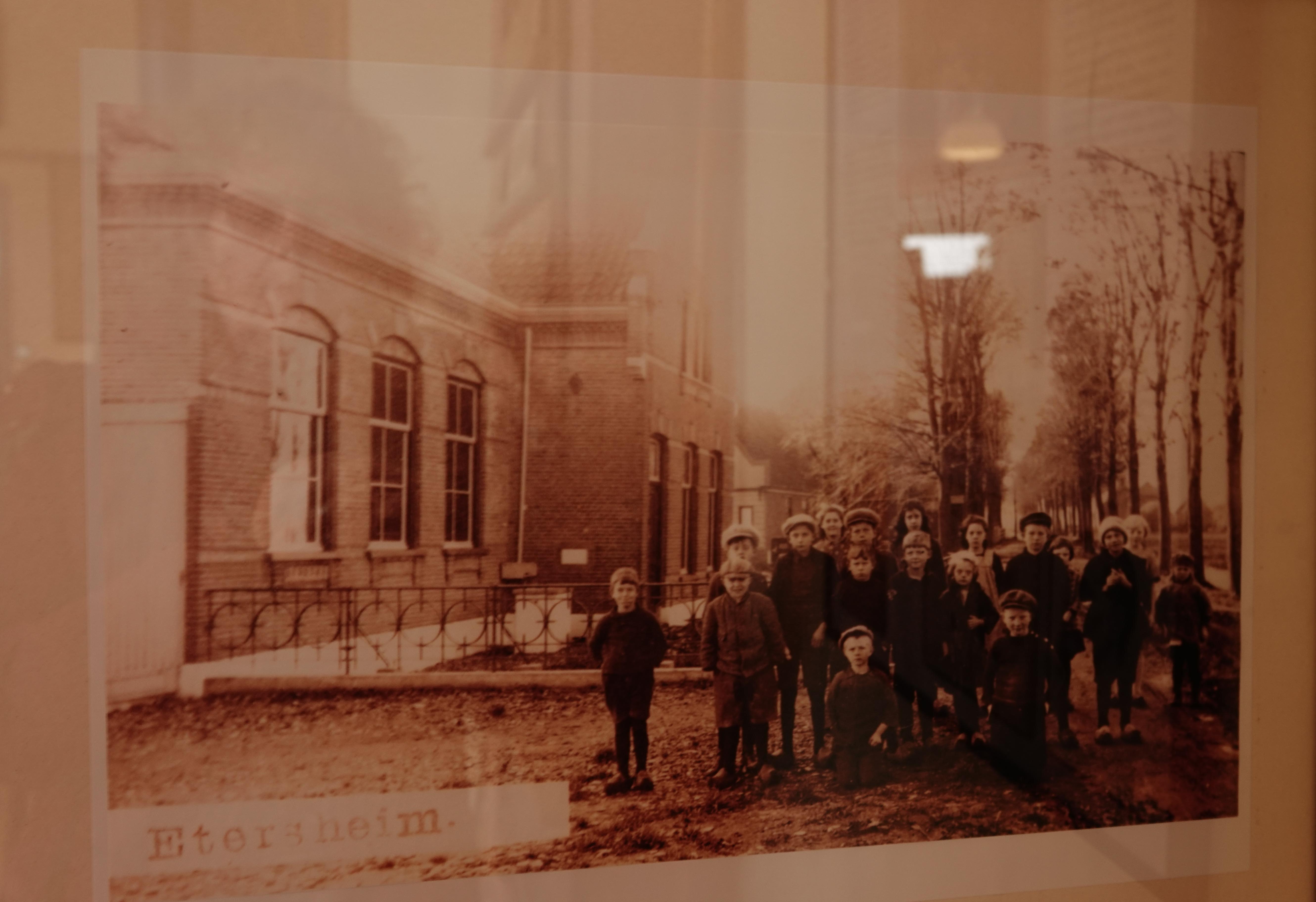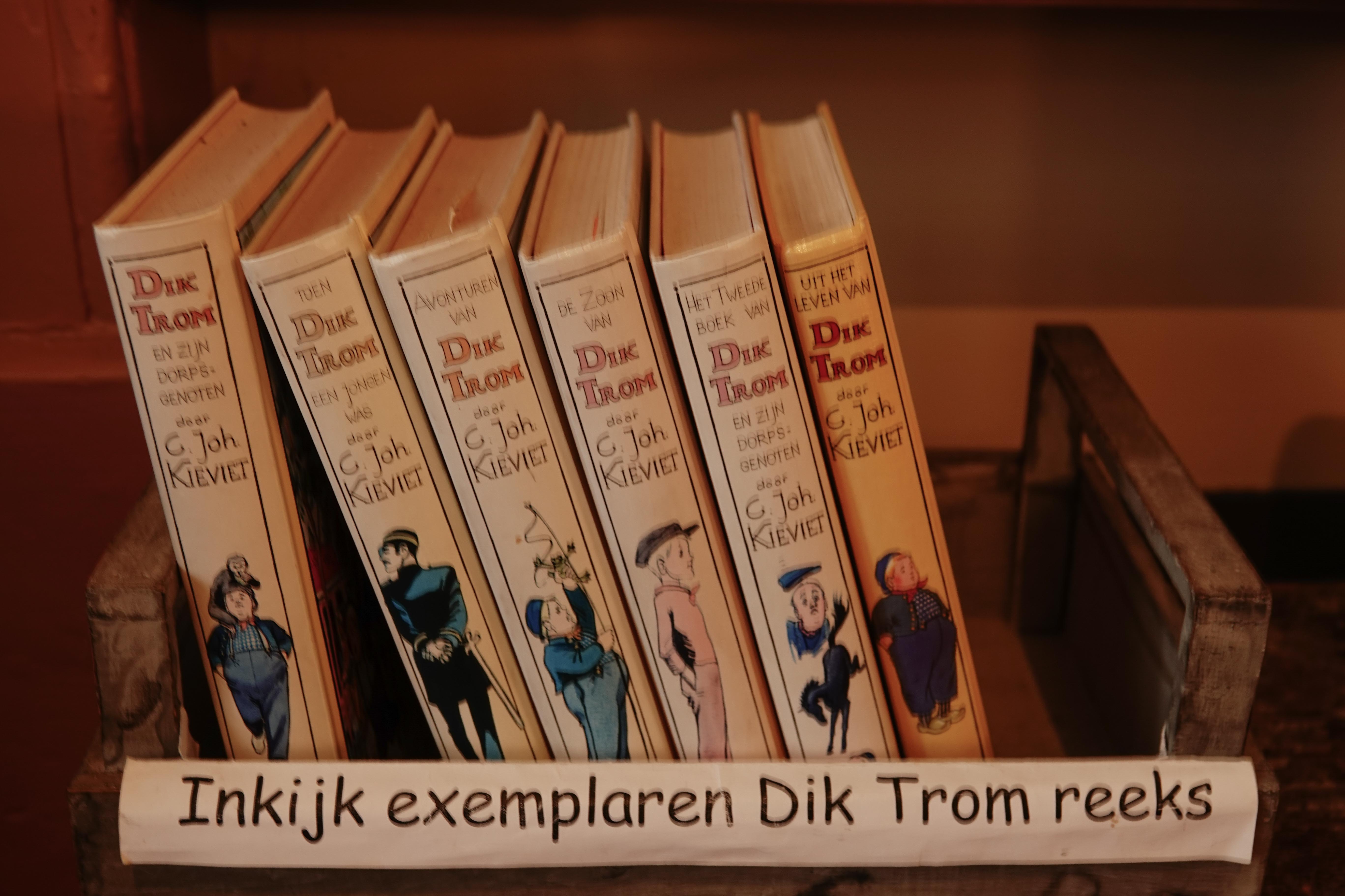 Dit was rond 1891 de lagere school van Etersheim. Die school bestond uit één klas met alle leeftijden door elkaar. De ene onderwijzer, dus vanzelf het hoofd der school, woonde naast het klaslokaal onder hetzelfde dak. Van dit soort schooltjes zal je er honderden gehad hebben in de plattelandsgemeentes, maar dat dit schooltje hier, uitgegroeid is tot een klein museum komt door de meester C. Joh. Kievit. Hij kwam op het idee om verhalen te gaan schrijven over alles wat hij meemaakte met zijn leerlingen. Die verhalen liet hij zijn leerlingen aan elkaar voorlezen. Als ze niet aansloegen, gooide hij het verhaal weg. Hij heeft wel meer dan 50 boeken geschreven, maar alleen de serie over Dik Trom is bekend geworden. Het originele handgeschreven boek, opgeschreven in schoolschriftjes kun je zien in een vitrine.