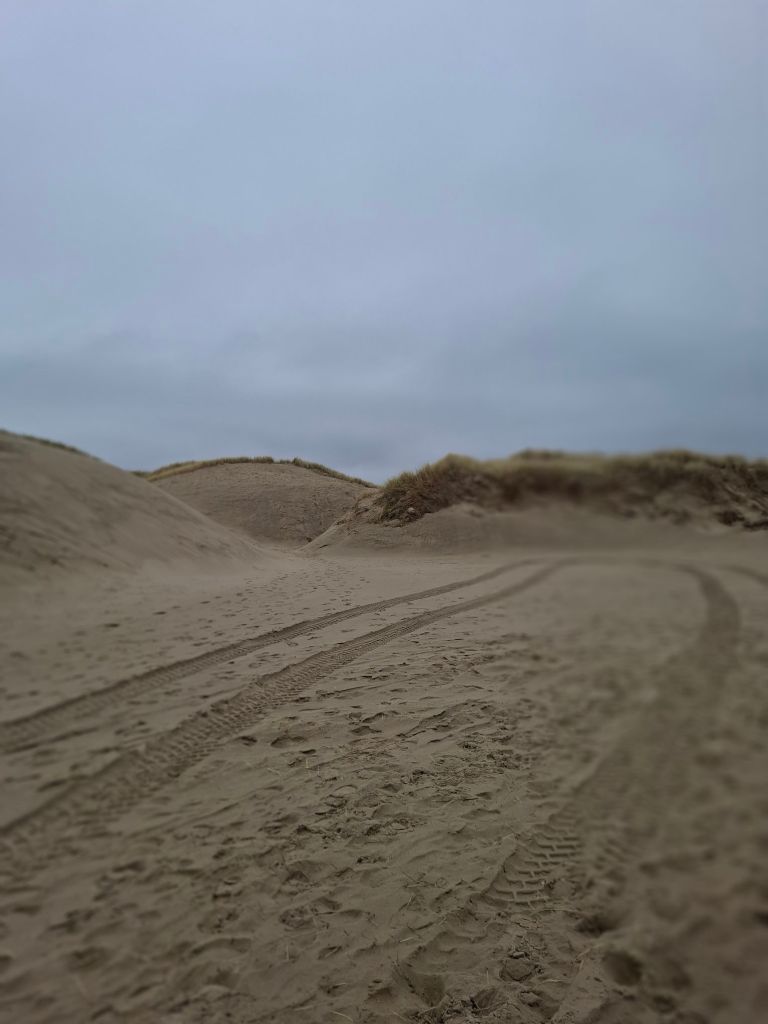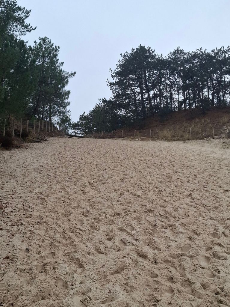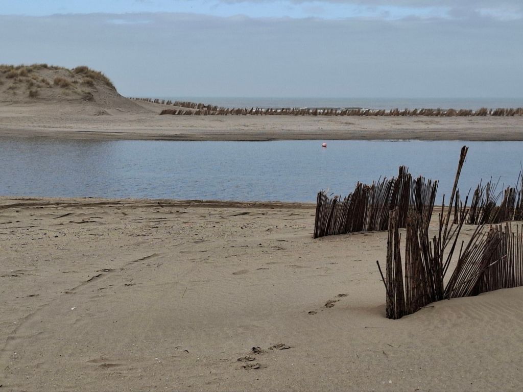 Achter een eerste rij zeeduin lopend, zagen we een opening in die duinenrij. Die is speciaal gemaakt om de zee het land te laten overspoelen bij hoog water of springtij. De kracht van de golven kan dan wat afnemen en de rest van de duinen worden op deze manier hopelijk gespaard.