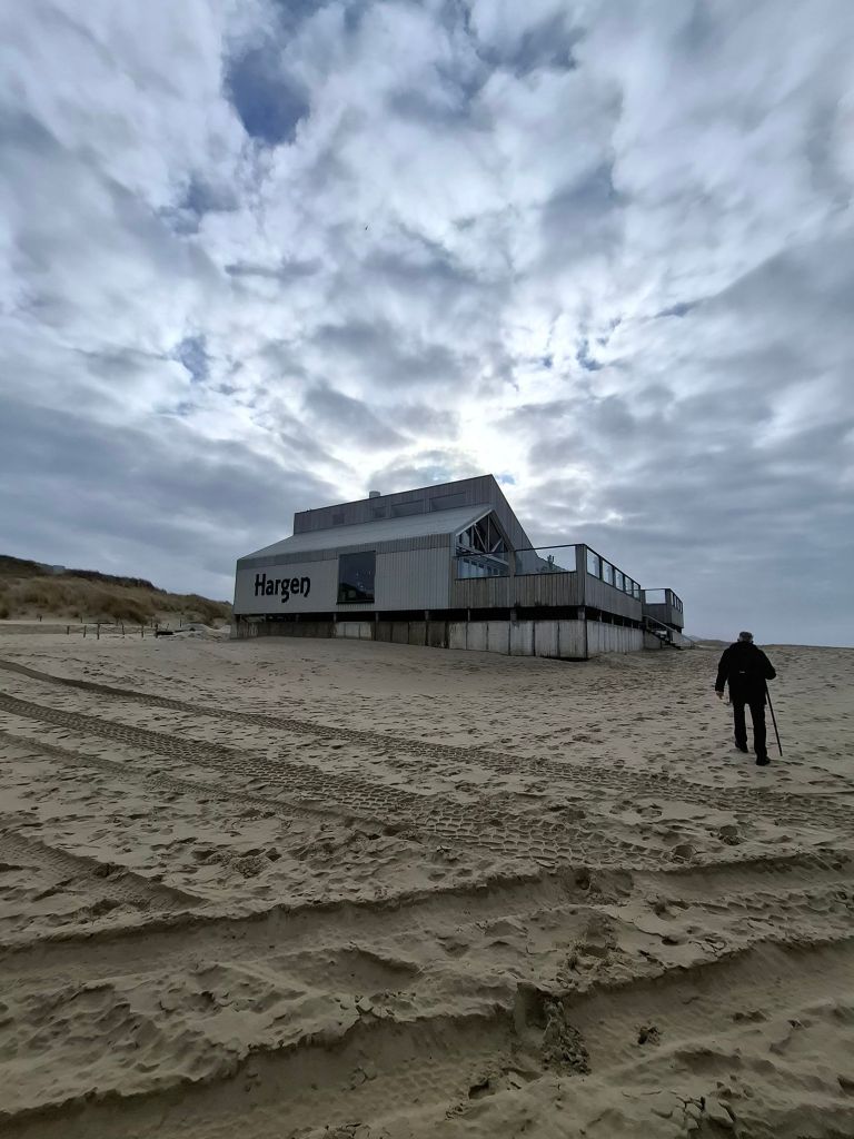 Helaas zette het feestje niet door en bleef het de hele verdere dag grijs. In strandpaviljoen Hargen streken we even neer voor koffie.