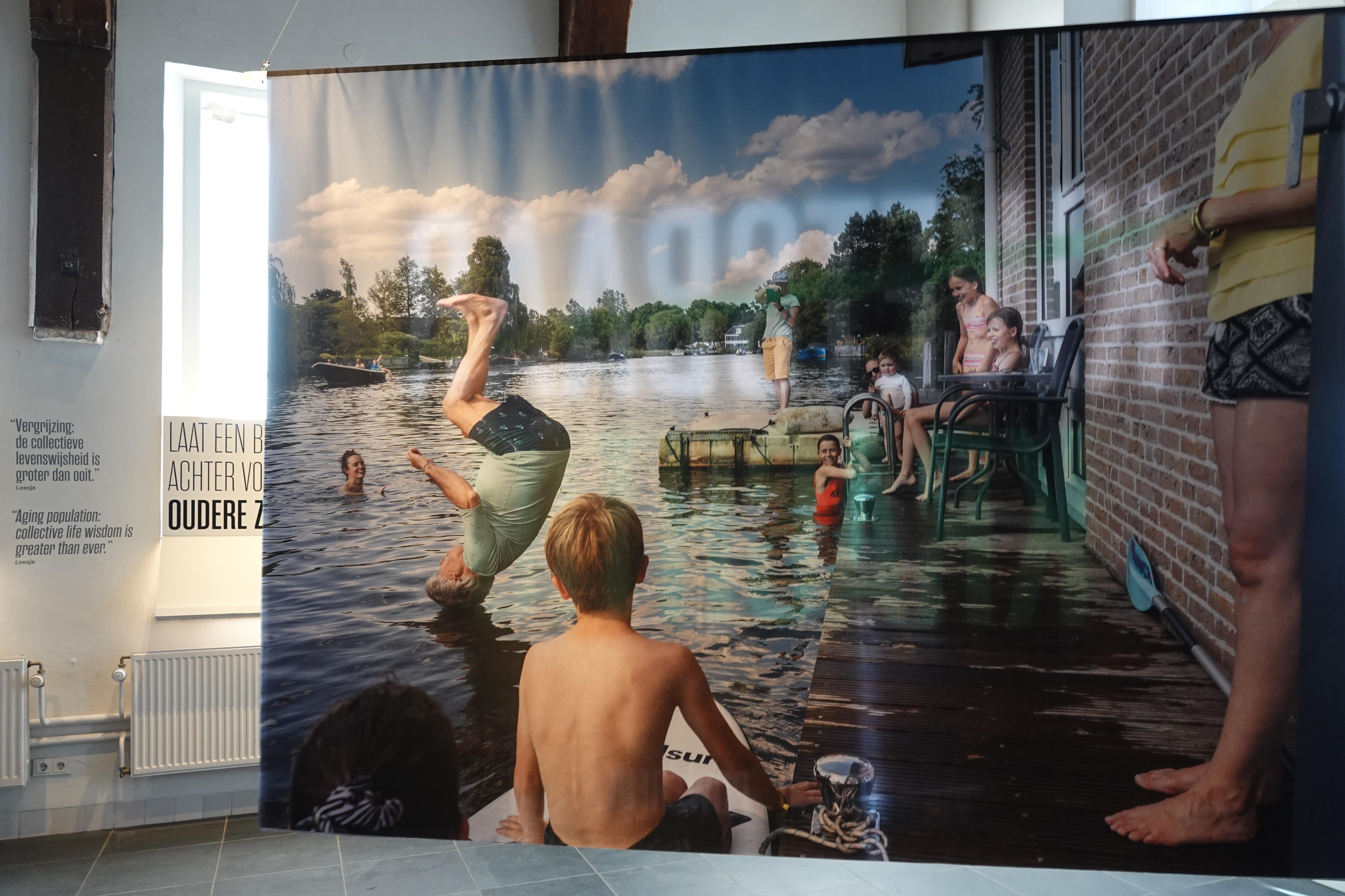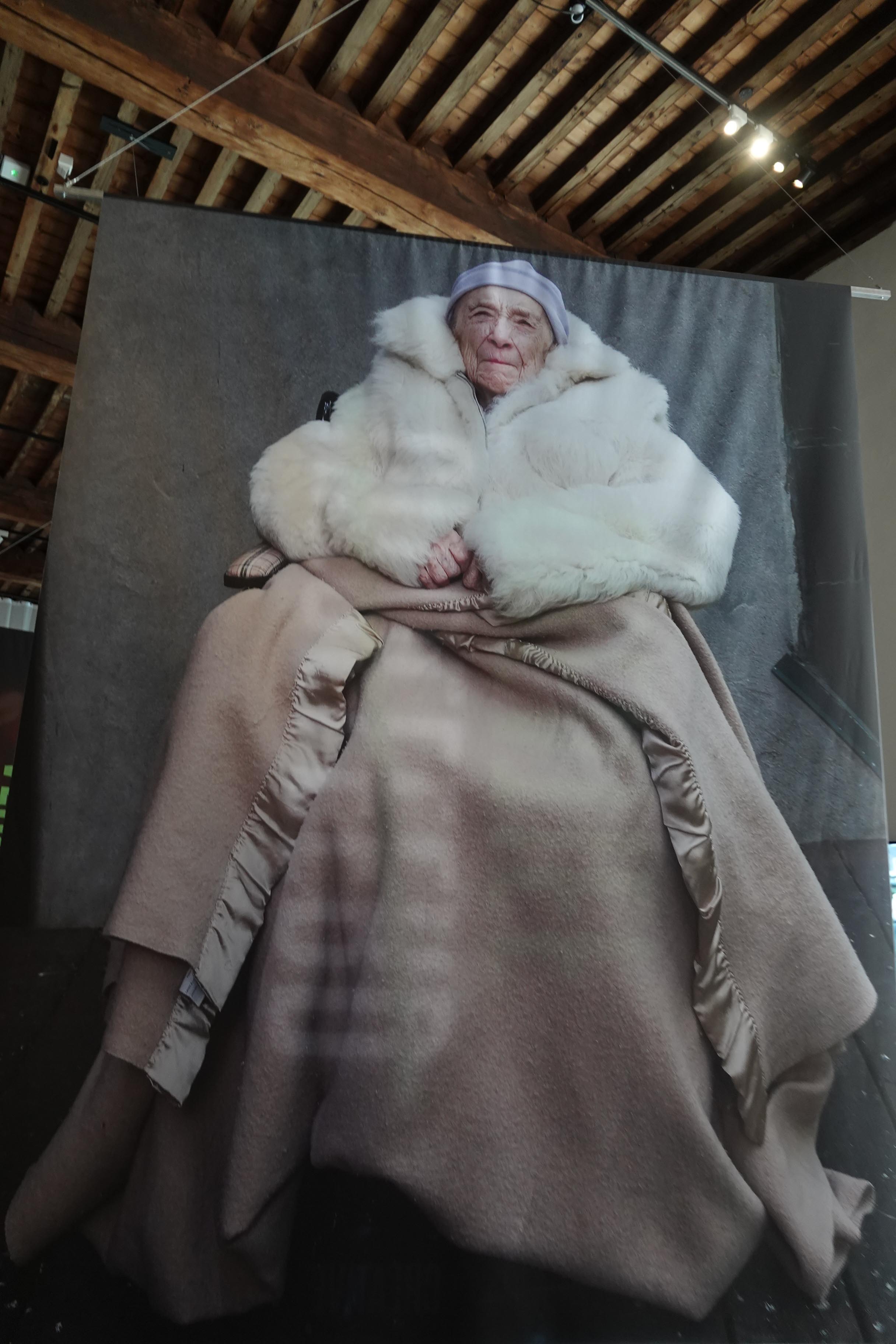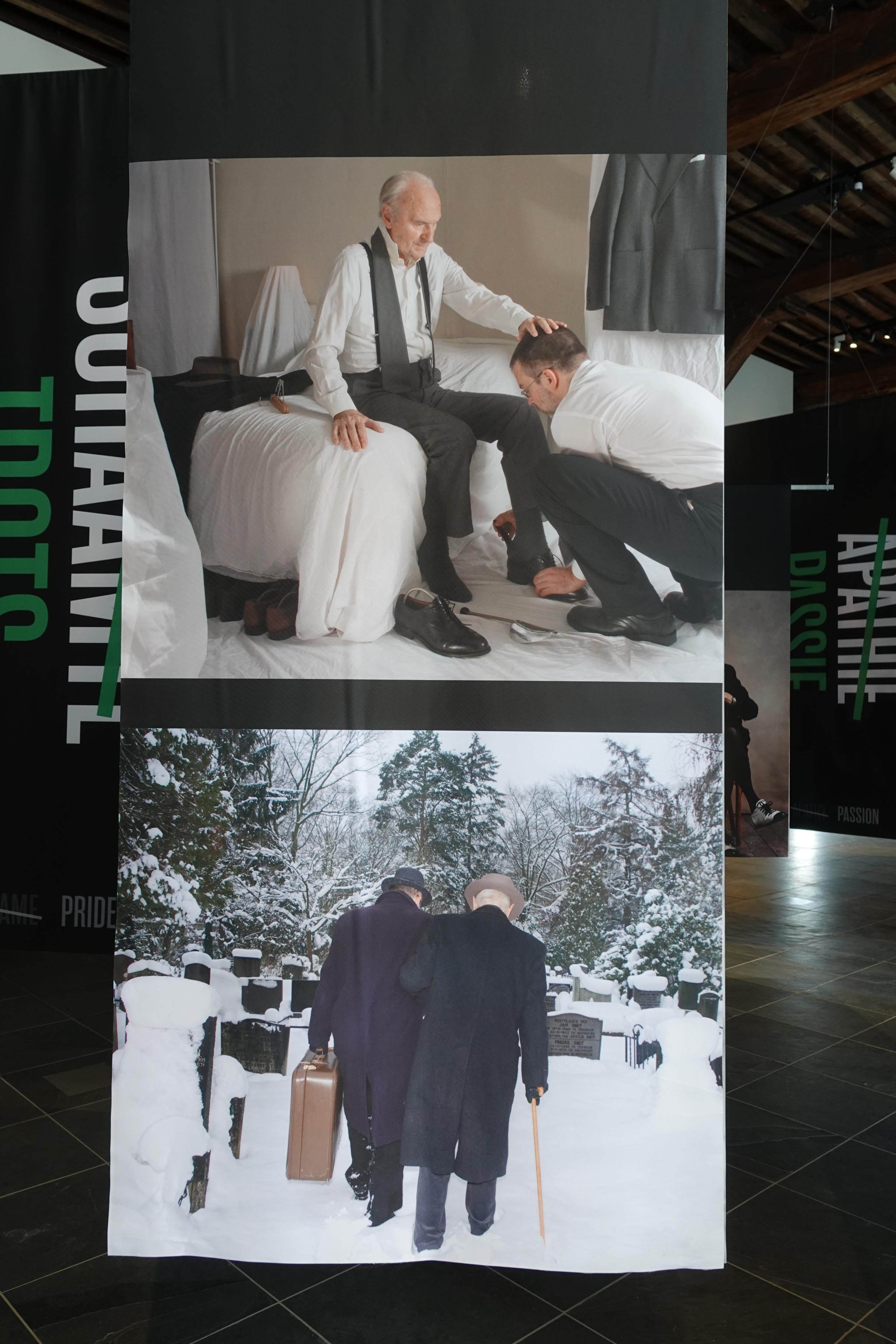 De foto’s waren in de ruimte op doeken opgehangen. Die doeken draaiden soms ook rond. Allemaal voorbeelden van mensen die de kunst van het ouder worden lijken te verstaan.