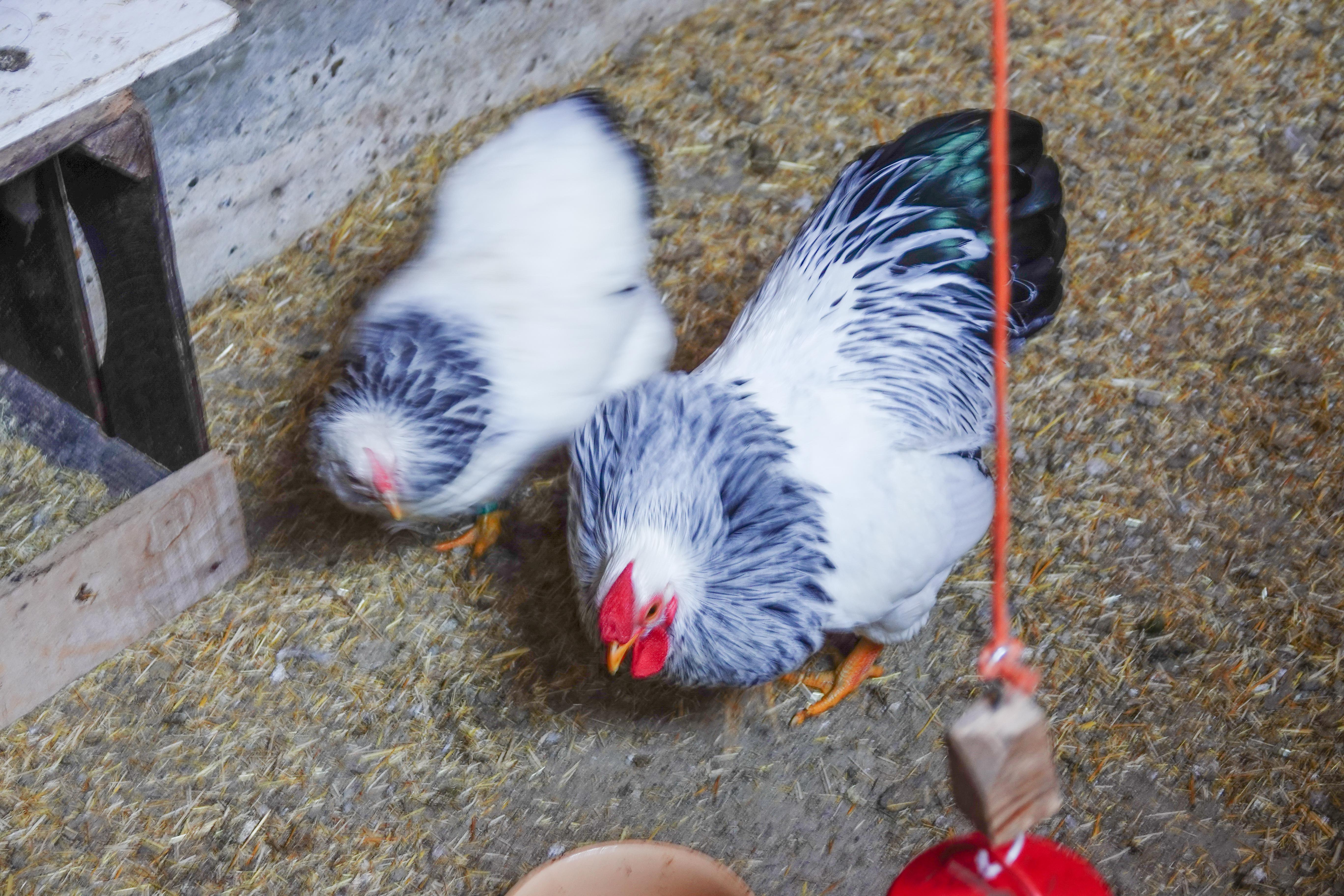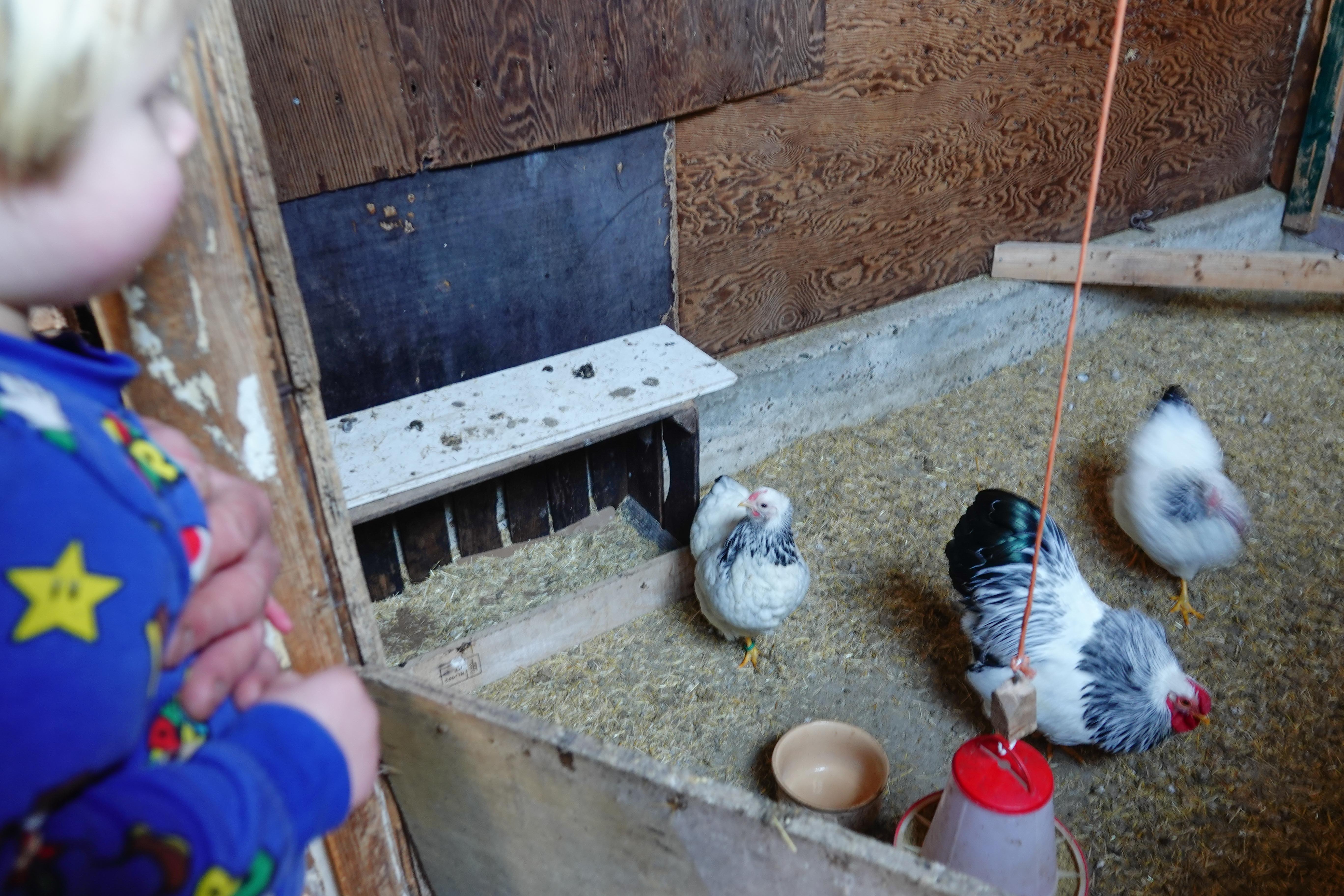 Ik had van mijn schoonzus, die op een boerderij woont begrepen, dat er al lammetjes waren geboren. Mijn programma voor de oppasdag op mijn kleinzoon was klaar. We fietsten in de loop van de ochtend naar de boerderij. En daar is voor zo’n hummel van bijjna drie zoveel te ontdekken en te beleven. Allereerst stond hij oog in oog met een grote hond. Mijn zwager had hem vastgezet, wetende hoe overweldigend zo’n hond kan overkomen op zo’n klein jochie, hoewel er geen greintje kwaad zit in die hond. Ik begon hem te aaien en A wilde ook wel voelen hoe zacht hij was. Even later lag de hond op zijn rug voor ons. Hij wilde nog wel meer gekroeld worden. En langzaam liet A zijn aanvankelijke aarzeling varen. Op de achtergrond hoorden we al steeds het kraaien van een haan. Het bleek dat er een paar kippetjes en een haan van het bijzonder ras Wyandotte binnen in een hok zaten. Als hobbyboer fokt mijn zwager deze soort voor wedstrijden.