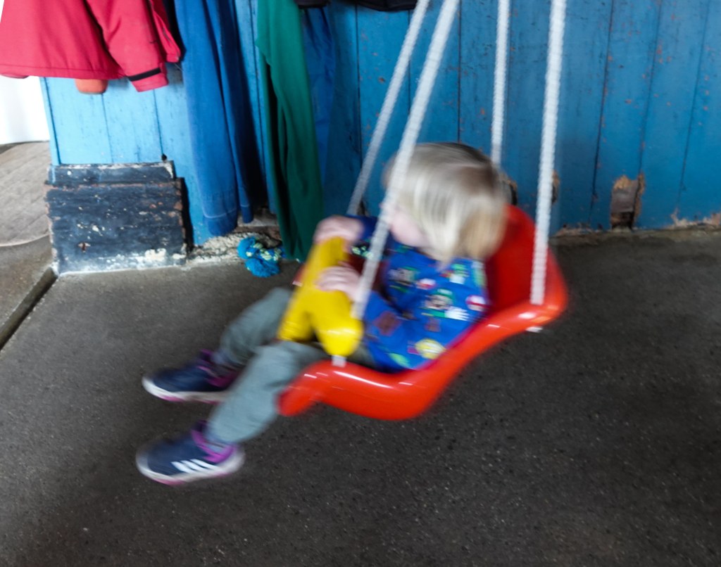 We liepen door de stal en daar hing zomaar een schommel. Die moest ook nog even uitgeprobeerd worden!