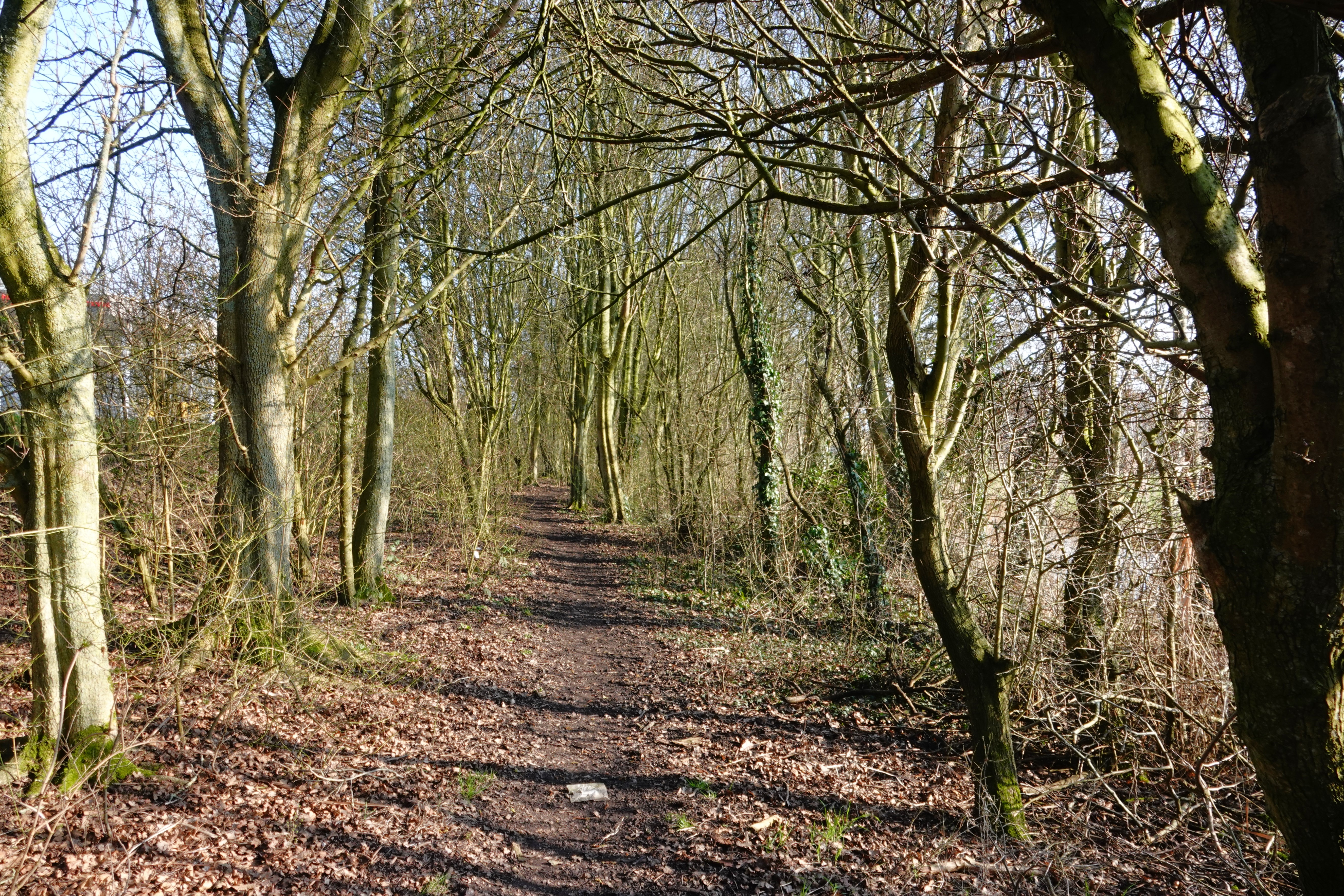 Vlak voor het talud bij Purmerend kon ik afslaan. Het is een graspad dat door bossage’s bij het wandelpad van het bos uitkomt.