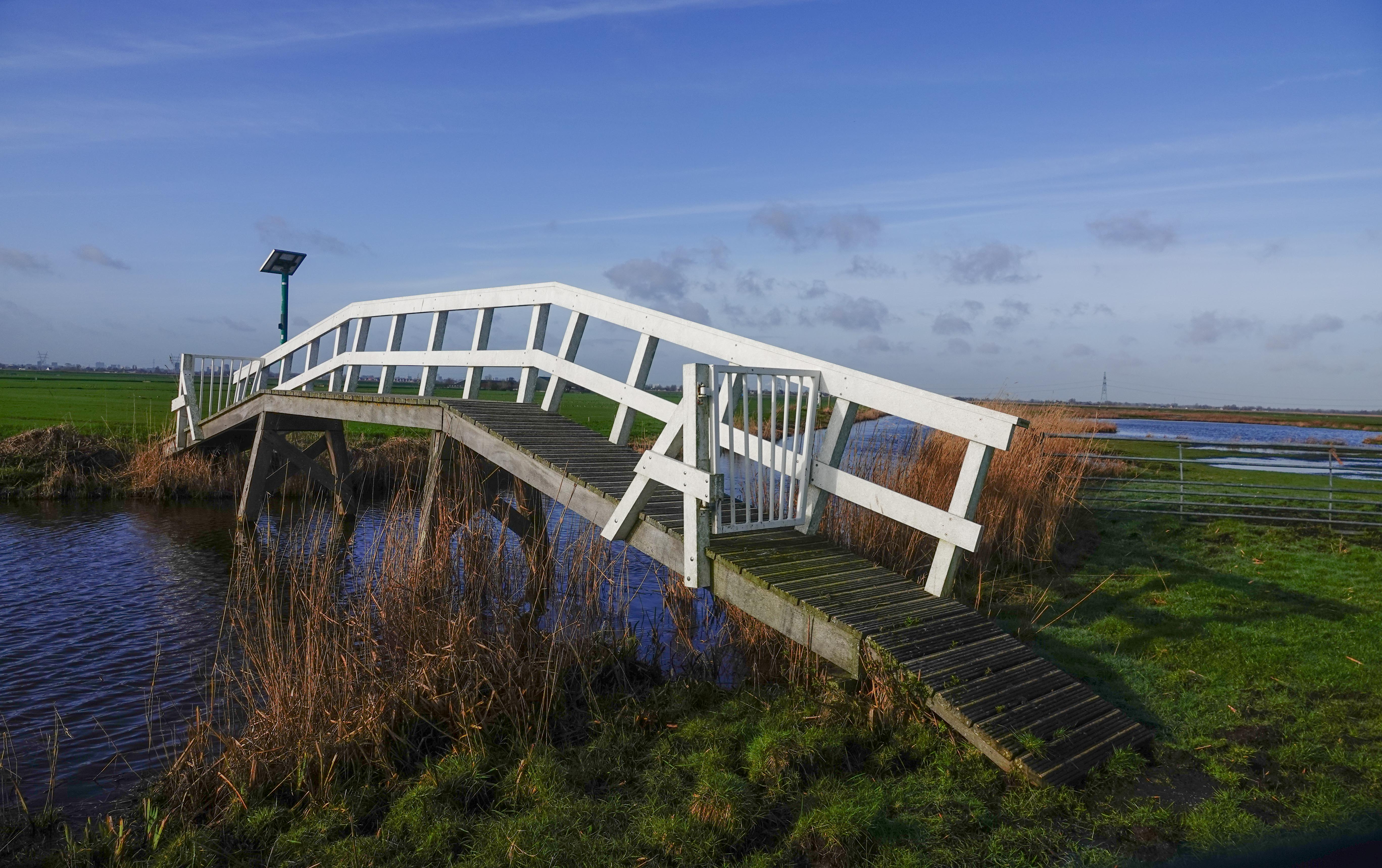 Bij een boerderij, kun je een wit overstaphekje nemen en zo kom je via de een witte brug in het weiland terecht. Daar zoek je dan het volgende witte hekje weer op en zo spreidt de route zich voor je uit.