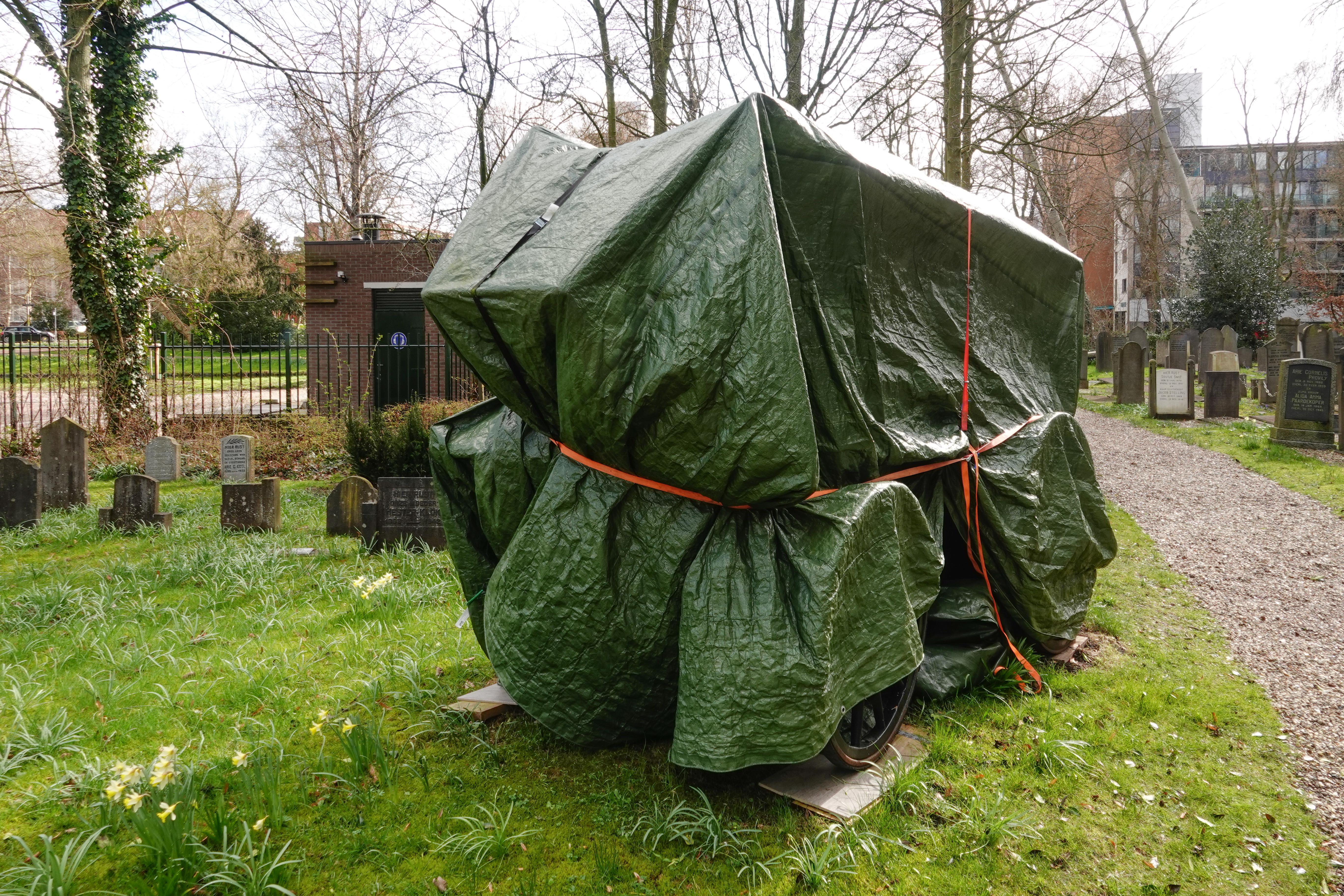 We staken door naar het oude kerkhof, dat nu een monument is. De koets stond ingepakt te wachten op de volgende rit.