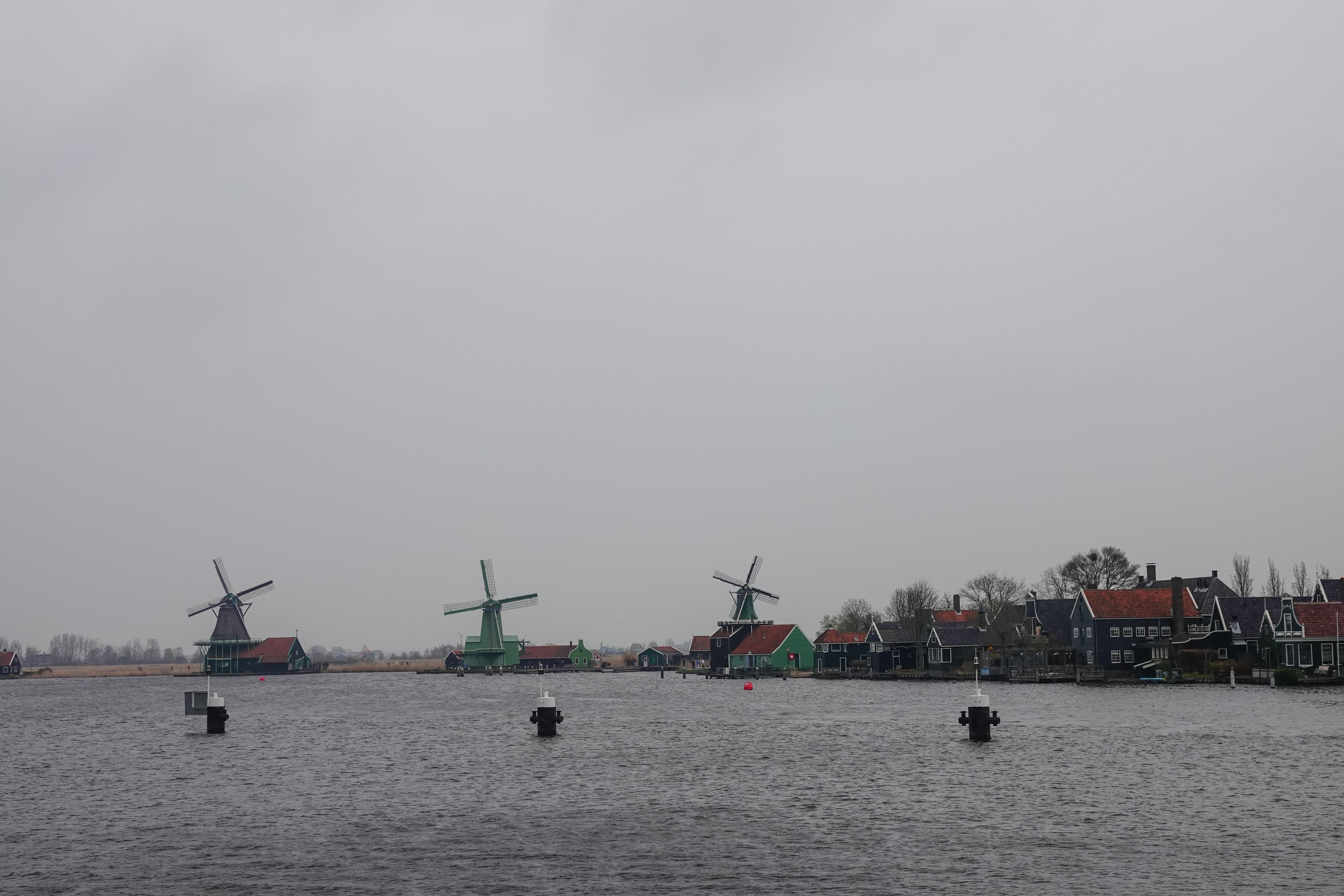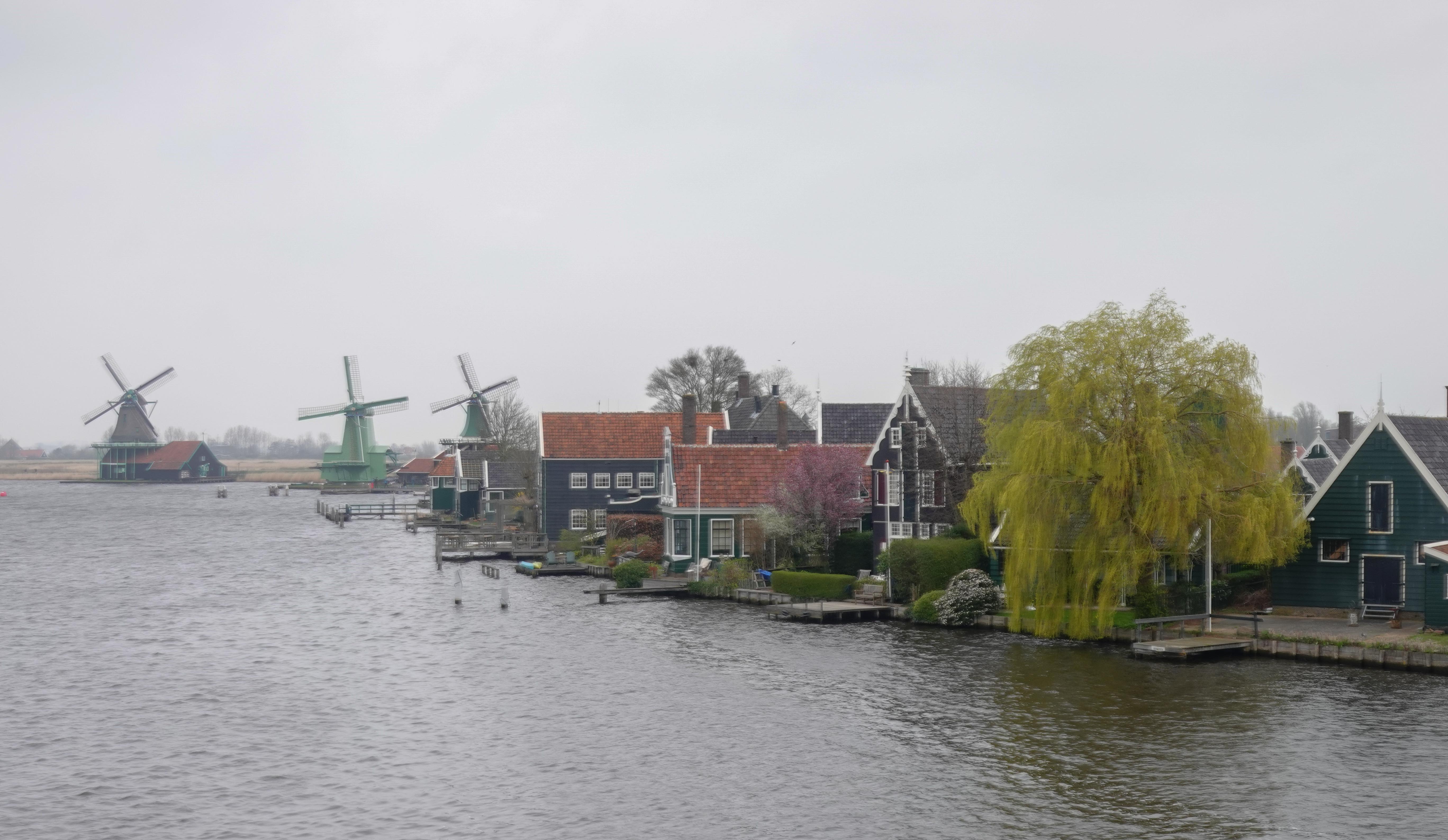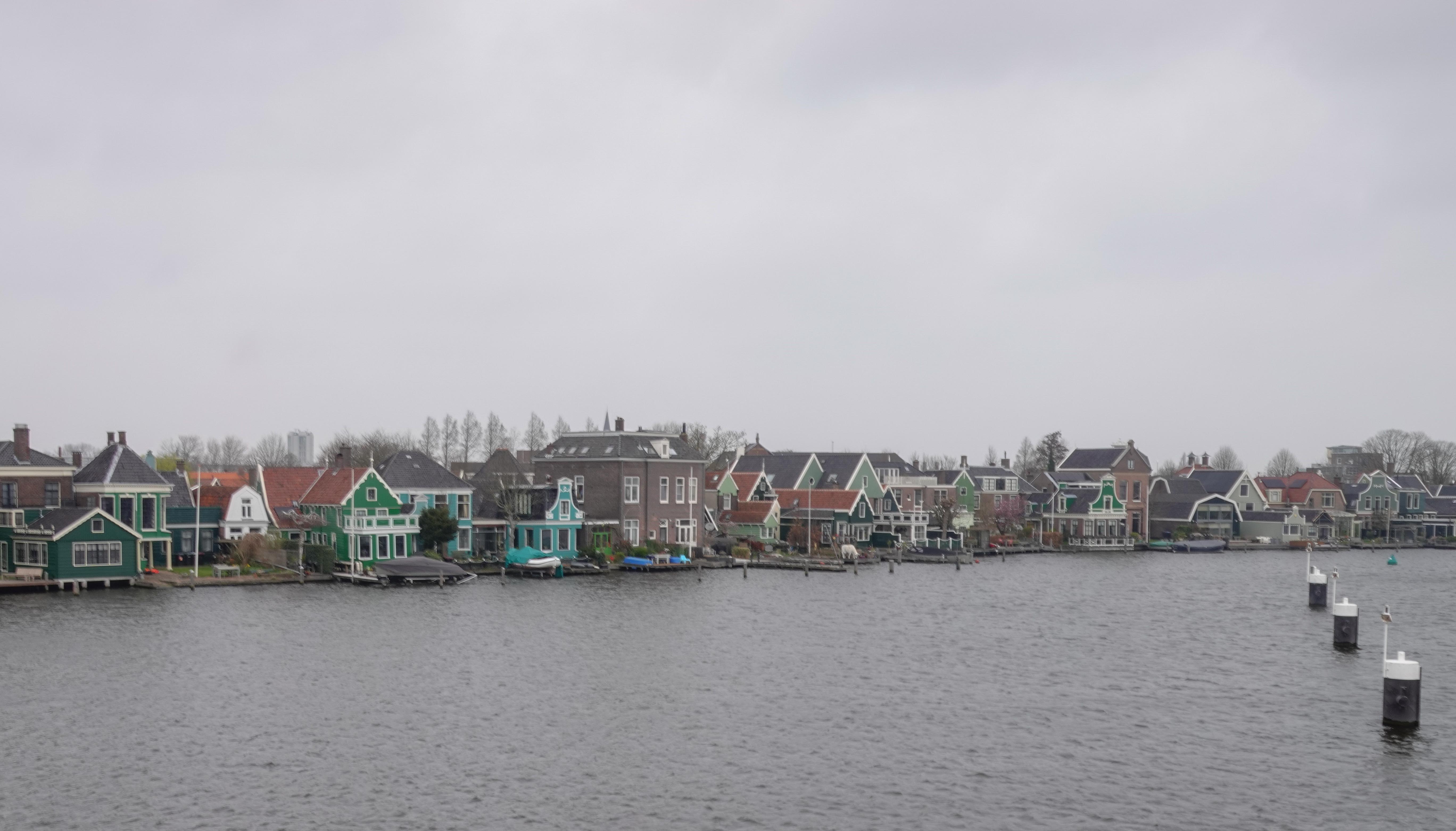 Het was een grijze en koude dag, maar het was gelukkig droog. Bij het oversteken van de Zaan komt het klassieke beeld van de molens en huizen langs de Zaan van de Zaanse Schans in beeld, maar ook aan de andere oever zag je de vele groene huisjes aan de Zaan bij Zaandijk. Een zonnetje erbij zou de beelden wel verlevendigd hebben, maar helaas. De zon, die even door het wolkendek heen probeerde te komen gaf het al snel op.