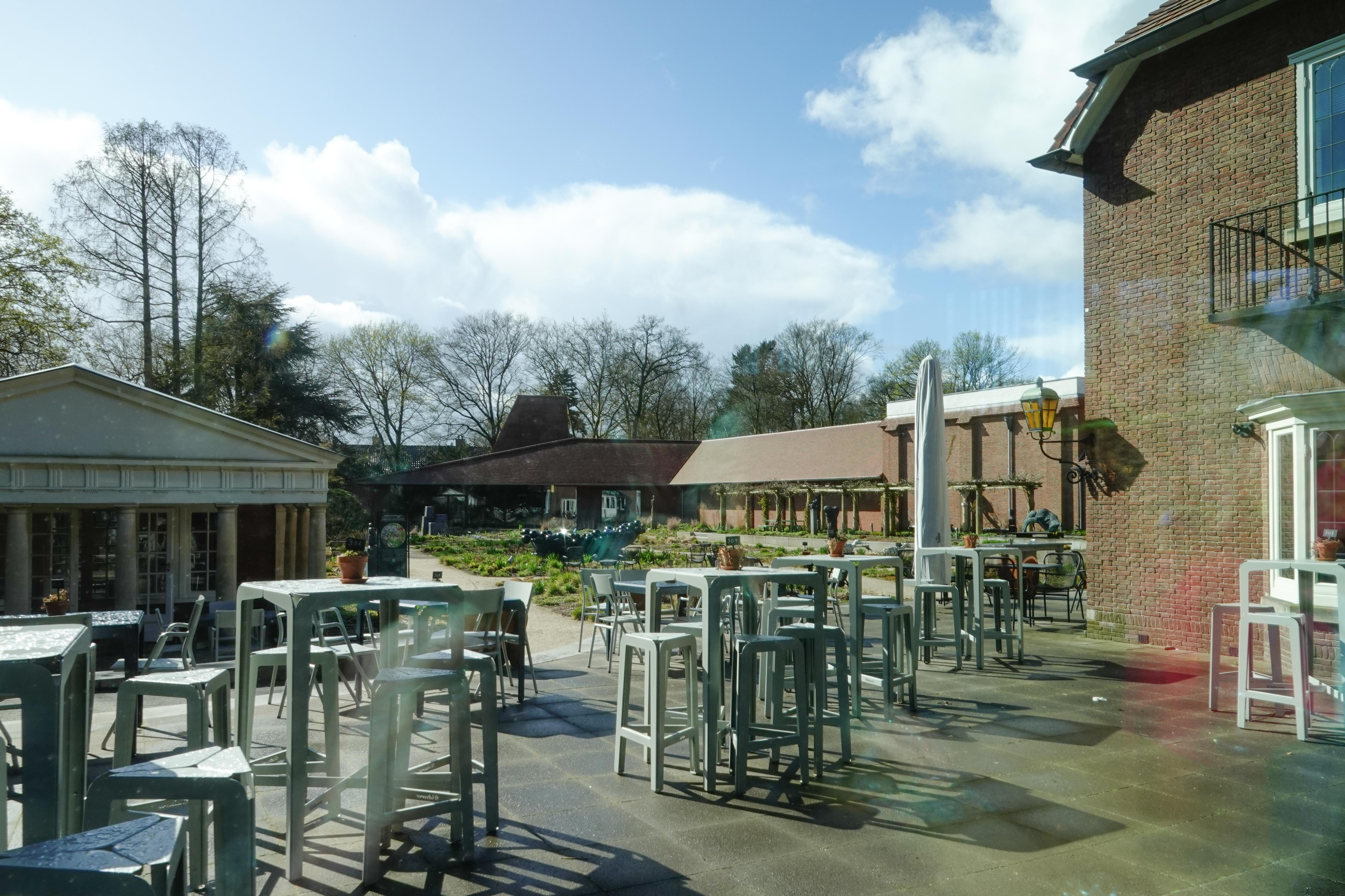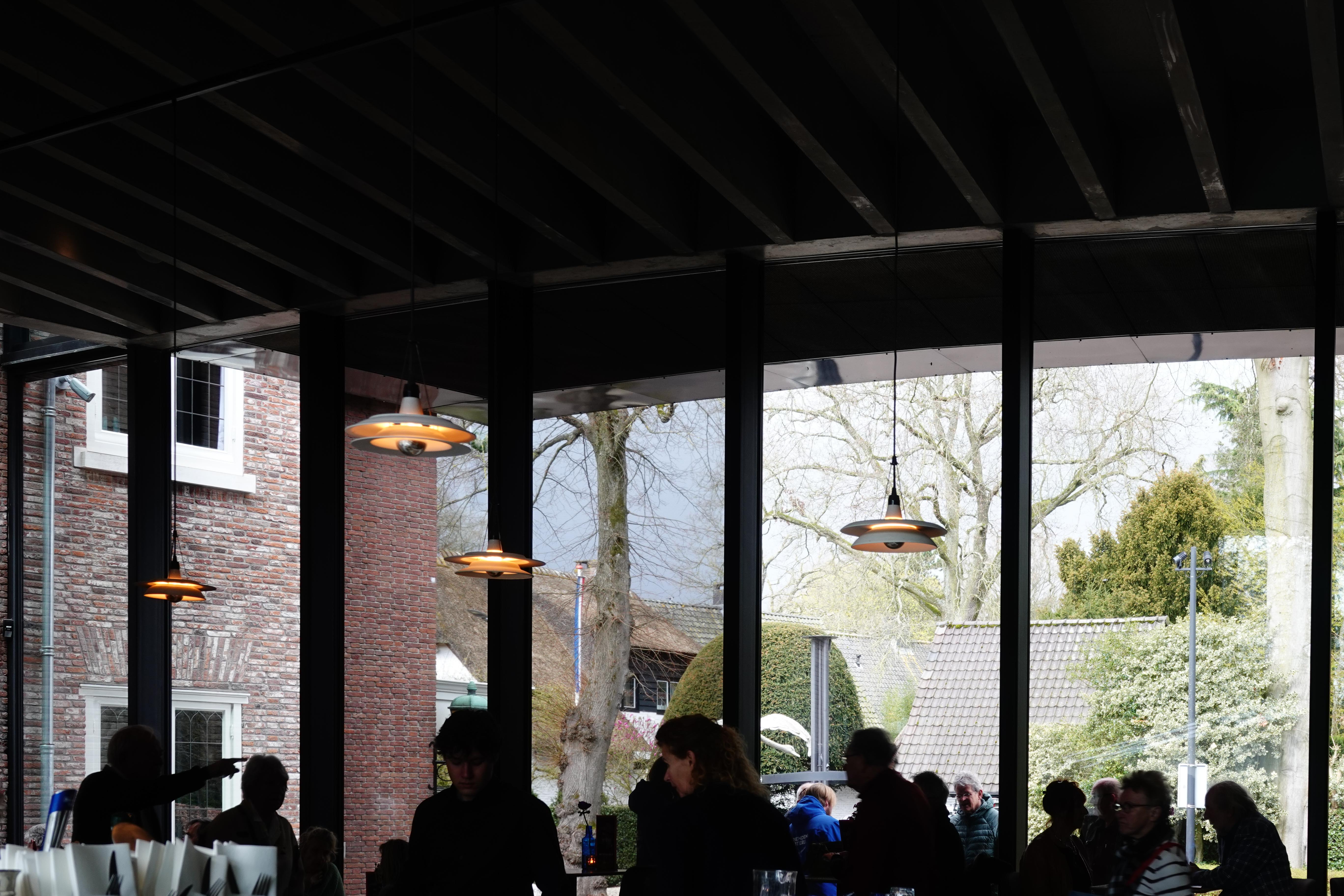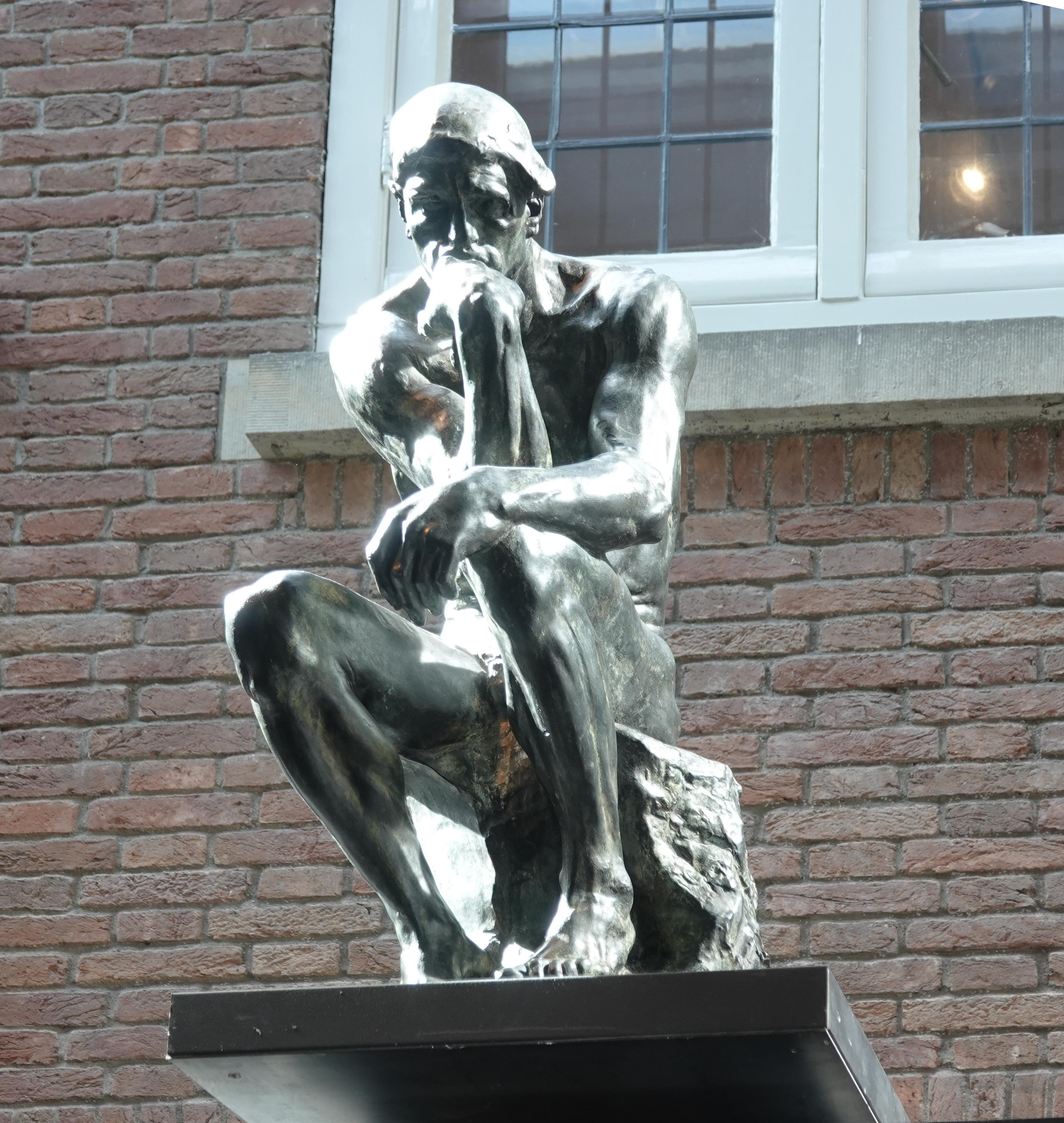 Samen met C en I reden we naar Laren. Het Singermuseum lonkte. Een aantal jaren geleden is daar een grootscheepse verbouwing geweest, wat het museum meer allure en ruimte gegeven heeft. Ik blijf het een heerlijke plek vinden. We begonnen met koffie in het restaurant. Buiten passeerden er maartse buien, maar ook mooie blauwe luchten. Met zicht op de museumtuin konden we dat alles goed bekijken. Een kopie van het beeld De Denker van Rodin, dat eerst in de tuin stond, heeft een prominente plek boven de ingang gekregen.