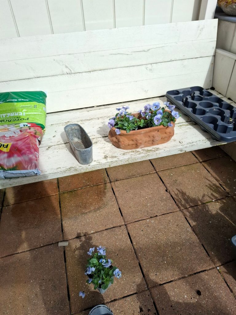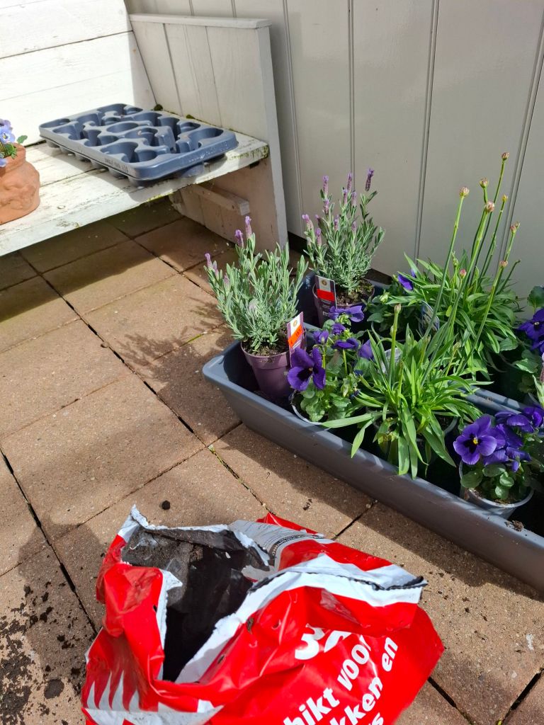 Na dat uur ging ik met dochterlief en kleinzoon naar het tuincentrum. Ik had plantjes nodig voor op mijn balkon. Misschien nog een beetje vroeg in het jaar, maar ik heb genoeg van die kale balkonrand. Dus na de middag wist ik wat me te doen stond, bakken vullen met potaarde en plantjes.